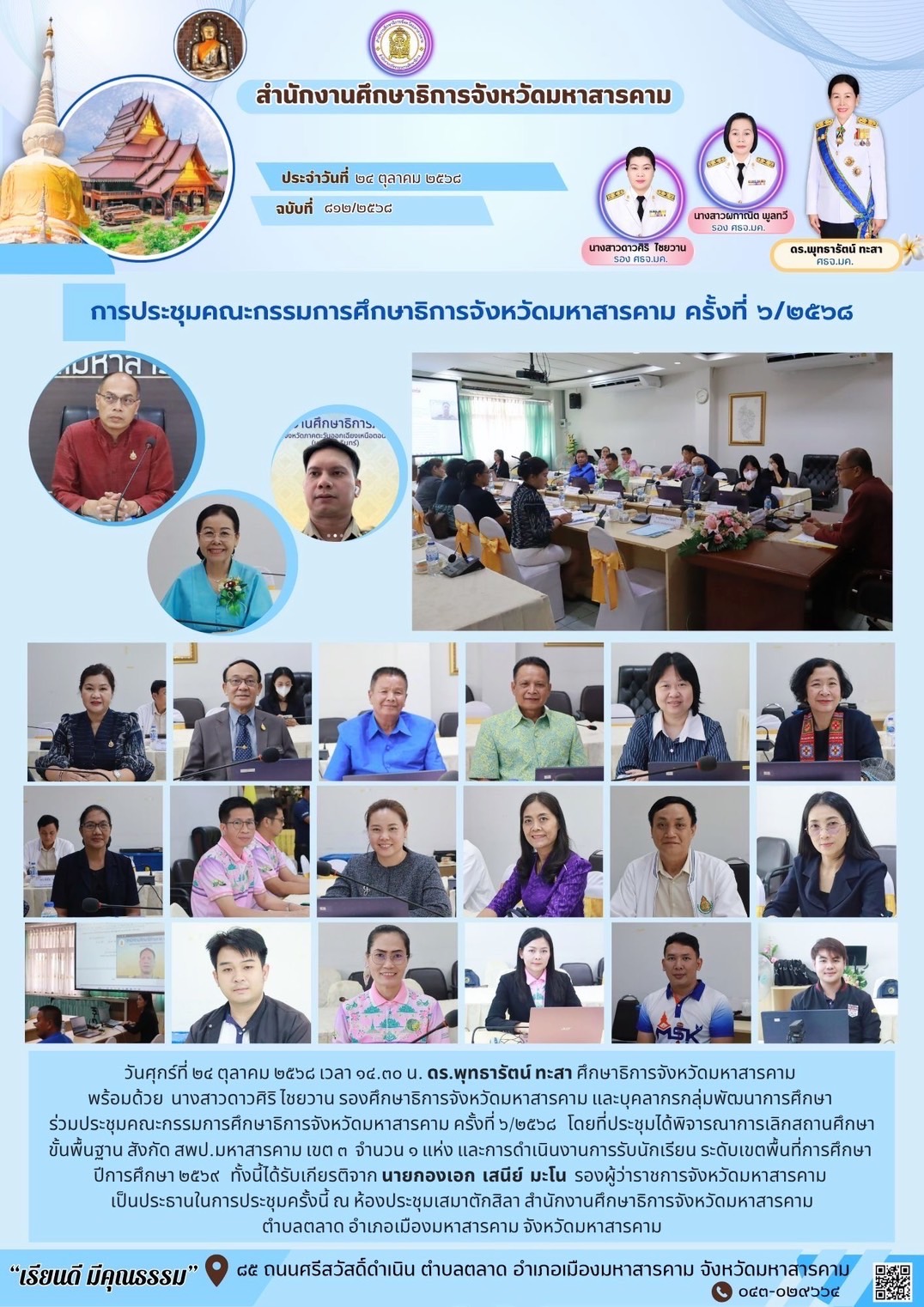 กิจกรรม นศุกร์ที่ ๒๔ ตุลาคม ๒๕๖๘ เวลา ๑๔.๓๐ น. ดร.พุทธารัตน์ ทะสา ศึกษาธิการจังหวัดมหาสารคาม พร้อมด้วย นางสาวดาวศิริ ไชยวาน รองศึกษาธิการจังหวัดมหาสารคาม และบุคลากรกลุ่มพัฒนาการศึกษา ร่วมประชุมคณะกรรมการศึกษาธิการจังหวัดมหาสารคาม ครั้งที่ ๖/๒๕๖๘ โดยที่ประชุมได้พิจารณาการเลิกสถานศึกษาขั้นพื้นฐาน สังกัด สพป.มหาสารคาม เขต ๓ จำนวน ๑ แห่ง และการดำเนินงานการรับนักเรียน ระดับเขตพื้นที่การศึกษา ปีการศึกษา ๒๕๖๙ ทั้งนี้ได้รับเกียรติจาก นายกองเอก เสนีย์ มะโน รองผู้ว่าราชการจังหวัดมหาสารคาม เป็นประธานในการประชุมครั้งนี้ ณ ห้องประชุมเสมาตักสิลา สำนักงานศึกษาธิการจังหวัดมหาสารคาม ตำบลตลาด อำเภอเมืองมหาสารคาม จังหวัดมหาสารคาม Posted on 27 October 202527 October 2025 by admin admin วันที่ 24 ตุลาคม 2568 เวลา 13.00 น. ดร.พุทธารัตน์ ทะสา ศึกษาธิการจังหวัดมหาสารคาม เข้ารับโล่เชิดชูเกียรติ “สุดยอดบุคคลต้นแบบ และสุดยอดองค์กรต้นแบบของแผ่นดิน 100 ปี ราชภัฏ” ด้านการศึกษาและพัฒนาสังคม โดยมี นายบุญสิงห์ วรินทร์รักษ์ ที่ปรึกษารัฐมนตรีว่าการกระทรวงศึกษาธิการ เป็นประธานในพิธีมอบรางวัล ณ ห้องประชุมพระบรมธาตุนาดูน อาคาร 1 คณะครุศาสตร์ มหาวิทยาลัยราชภัฏมหาสารคาม วันที่ 26 ตุลาคม 2568 เวลา 14.30 น. ดร.พุทธารัตน์ ทะสา ศึกษาธิการจังหวัดมหาสารคาม พร้อมด้วยนางสาวธัญญลักษณ์ รัตนแสนศรี เข้าร่วมพิธีถวายน้ำสรงพระบรมศพและพิธีลงนามถวายความอาลัยเบื้องหน้าพระฉายาลักษณ์ สมเด็จพระนางเจ้าสิริกิติ์ พระบรมราชินีนาถ พระบรมราชชนนีพันปีหลวง ณ โถงศาลากลางจังหวัดมหาสารคาม จัดโดยสำนักงานจังหวัดมหาสารคาม ได้รับเกียรติจากนายกนก ศรีวิชัยนันท์ รองผู้ว่าราชการจังหวัดมหาสารคาม รักษาการในตำแหน่ง ผู้ว่าราชการจังหวัดมหาสารคาม เป็นประธานในพิธี