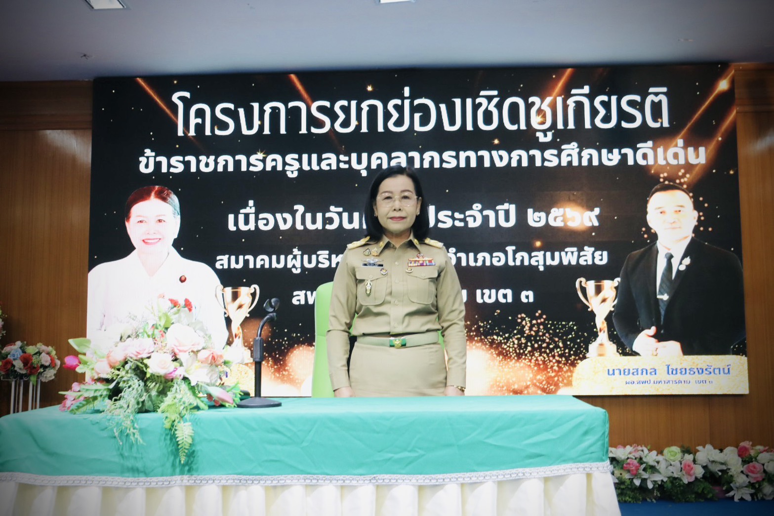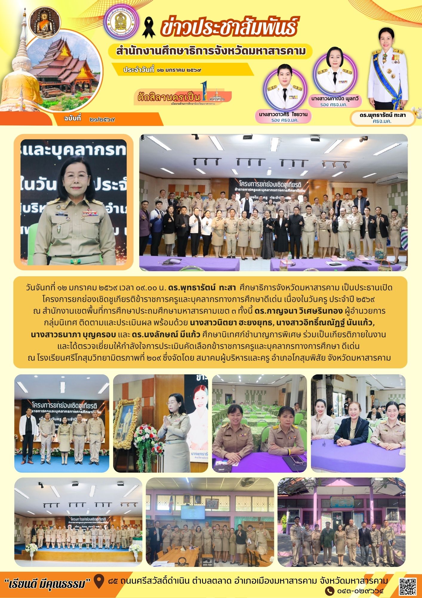 วันจันทที่ ๑๒ มกราคม ๒๕๖๙ เวลา ๐๙.๐๐ น. ดร.พุทธารัตน์ ทะสา ศึกษาธิการจังหวัดมหาสารคาม เป็นประธานเปิดโครงการยกย่องเชิดชูเกียรติข้าราชการครูและบุคลากรทางการศึกษาดีเด่น เนื่องในวันครู ประจำปี ๒๕๖๙ ณ สำนักงานเขตพื้นที่การศึกษาประถมศึกษามหาสารคามเขต ๓ ทั้งนี้ ดร.กาญจนา วิเศษรินทอง ผู้อำนวยการ กลุ่มนิเทศ ติดตามและประเมินผล พร้อมด้วย นางสาวนิตยา ฮะยงยุทธ, นางสาวอิทธิ์ณณัฏฐ์ นันแก้ว, นางสาวธนาภา บุญครอบ และ ดร.นงลักษณ์ มีแก้ว ศึกษานิเทศก์ชำนาญการพิเศษ ร่วมเป็นเกียรติภายในงาน และได้ตรวจเยี่ยมให้กำลังใจการประเมินคัดเลือกข้าราชการครูและบุคลากรทางการศึกษา ดีเด่น ณ โรงเรียนศรีโกสุมวิทยามิตรภาพที่ ๒๐๙ ซึ่งจัดโดย สมาคมผู้บริหารและครู อำเภอโกสุมพิสัย จังหวัดมหาสารคาม