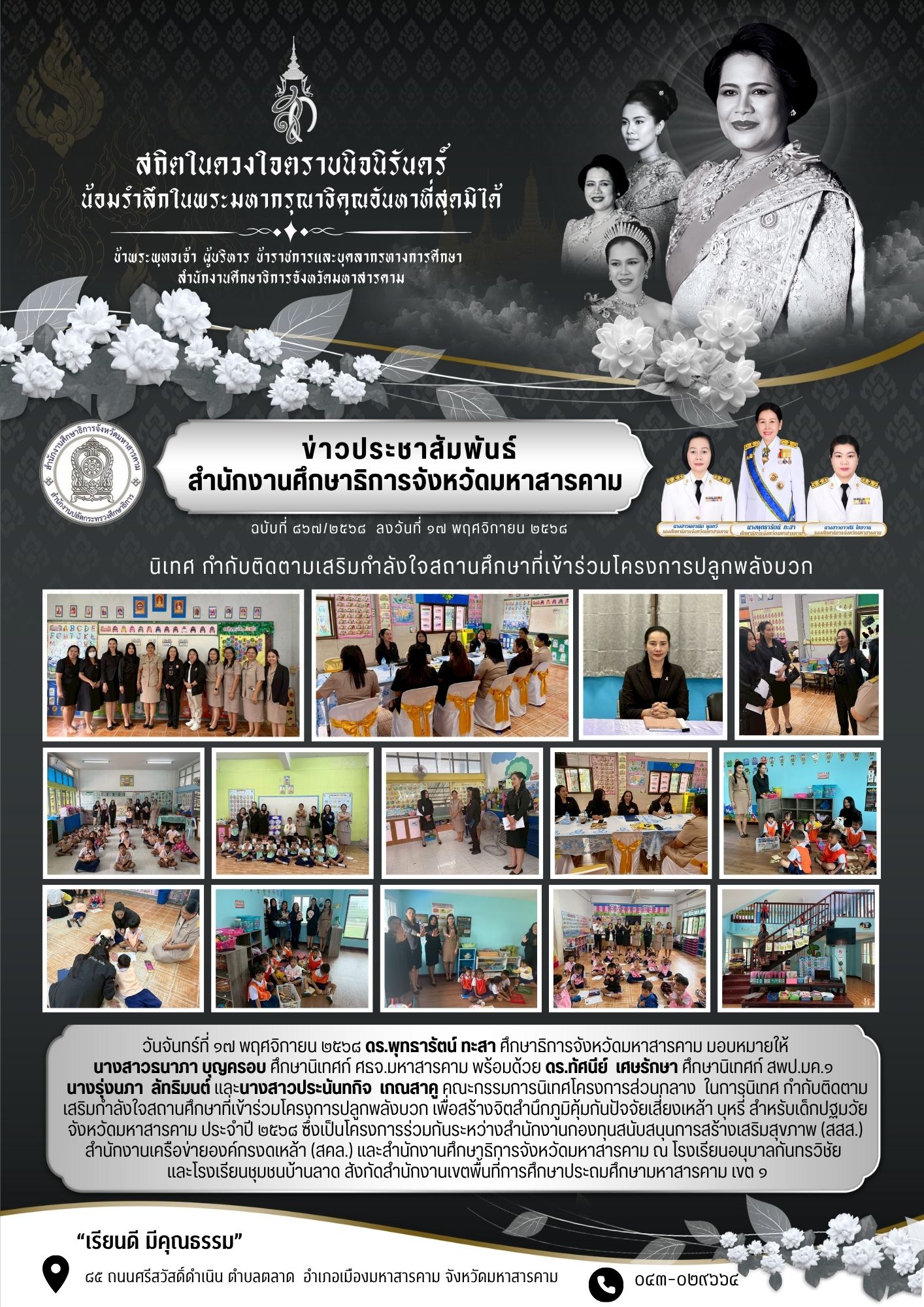 วันจันทร์ที่ ๑๗ พฤศจิกายน ๒๕๖๘ ดร.พุทธารัตน์ ทะสา ศึกษาธิการจังหวัดมหาสารคาม มอบหมายให้ นางสาวธนาภา บุญครอบ ศึกษานิเทศก์ ศธจ.มหาสารคาม พร้อมด้วย ดร.ทัศนีย์ เศษรักษา ศึกษานิเทศก์ สพป.มค.๑ นางรุ่งนภา ลัทธิมนต์ และนางสาวประนันทกิจ เกณสาคู คณะกรรมการนิเทศโครงการส่วนกลาง ในการนิเทศ กำกับติดตาม เสริมกำลังใจสถานศึกษาที่เข้าร่วมโครงการปลูกพลังบวก เพื่อสร้างจิตสำนึกภูมิคุ้มกันปัจจัยเสี่ยงเหล้า บุหรี่ สำหรับเด็กปฐมวัย จังหวัดมหาสารคาม ประจำปี ๒๕๖๘ ซึ่งเป็นโครงการร่วมกันระหว่างสำนักงานกองทุนสนับสนุนการสร้างเสริมสุขภาพ (สสส.) สำนักงานเครือข่ายองค์กรงดเหล้า (สคล.) และสำนักงานศึกษาธิการจังหวัดมหาสารคาม ณ โรงเรียนอนุบาลกันทรวิชัย และโรงเรียนชุมชนบ้านลาด สังกัดสำนักงานเขตพื้นที่การศึกษาประถมศึกษามหาสารคาม เขต ๑