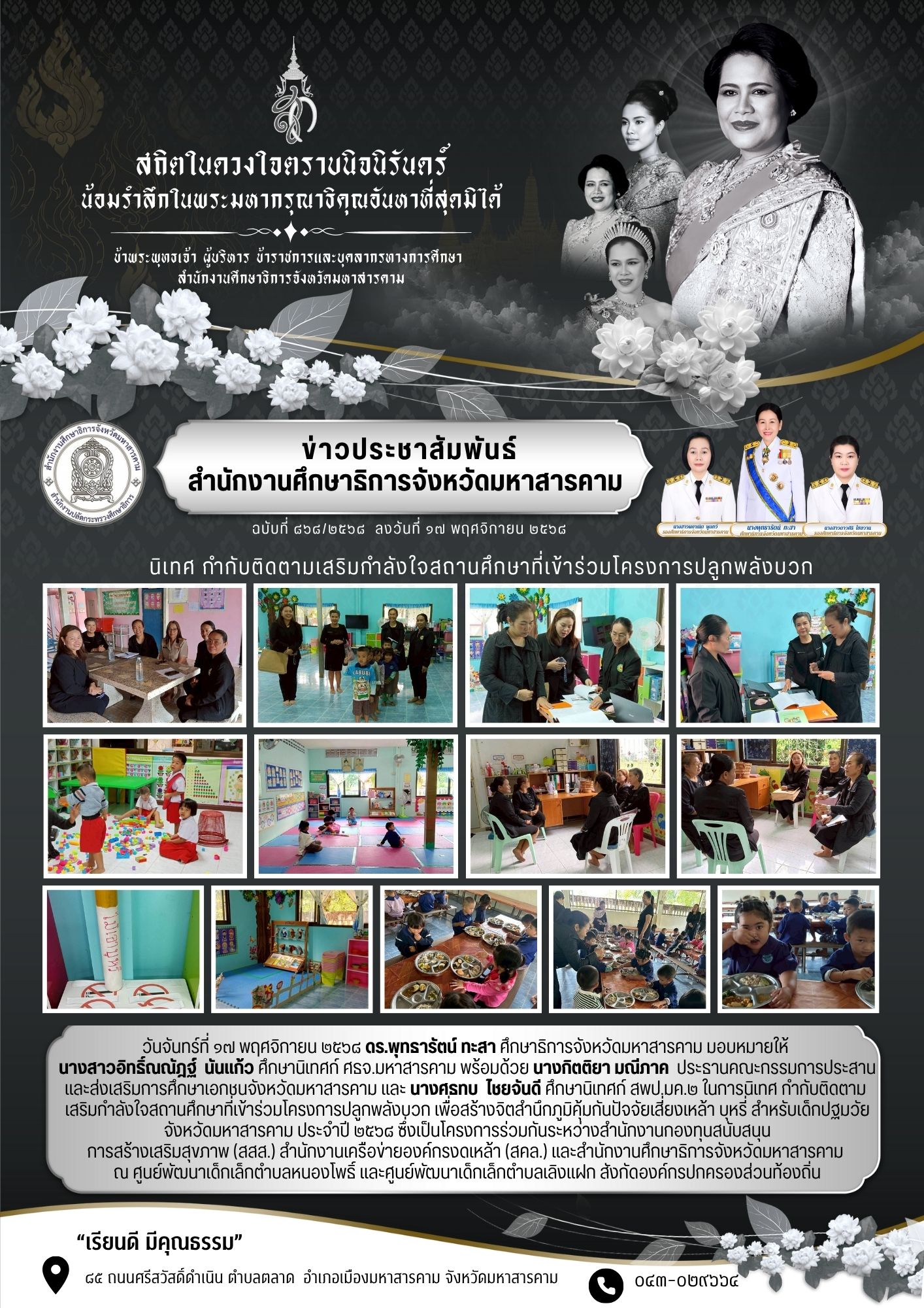 วันจันทร์ที่ ๑๗ พฤศจิกายน ๒๕๖๘ ดร.พุทธารัตน์ ทะสา ศึกษาธิการจังหวัดมหาสารคาม มอบหมายให้ นางสาวอิทธิ์ณณัฎฐ์ นันแก้ว ศึกษานิเทศก์ ศธจ.มหาสารคาม พร้อมด้วย นางกิตติยา มณีภาค ประธานคณะกรรมการประสานและส่งเสริมการศึกษาเอกชนจังหวัดมหาสารคาม และ นางศธทบ ไชยจันดี ศึกษานิเทศก์ สพป.มค.๒ ในการนิเทศ กำกับติดตาม เสริมกำลังใจสถานศึกษาที่เข้าร่วมโครงการปลูกพลังบวก เพื่อสร้างจิตสำนึกภูมิคุ้มกันปัจจัยเสี่ยงเหล้า บุหรี่ สำหรับเด็กปฐมวัย จังหวัดมหาสารคาม ประจำปี ๒๕๖๘ ซึ่งเป็นโครงการร่วมกันระหว่างสำนักงานกองทุนสนับสนุน การสร้างเสริมสุขภาพ (สสส.) สำนักงานเครือข่ายองค์กรงดเหล้า (สคล.) และสำนักงานศึกษาธิการจังหวัดมหาสารคาม ณ ศูนย์พัฒนาเด็กเล็กตําบลหนองโพธิ์ และศูนย์พัฒนาเด็กเล็กตำบลเลิงแฝก สังกัดองค์กรปกครองส่วนท้องถิ่น