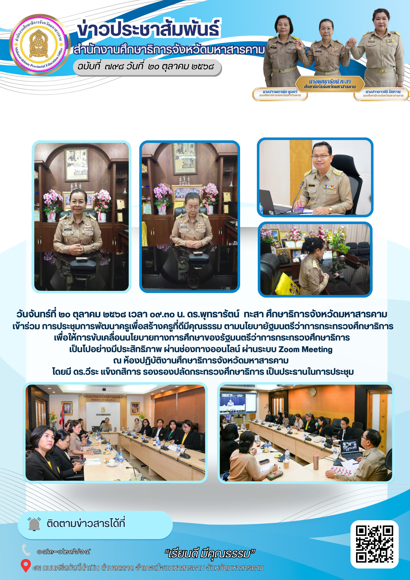 วันจันทร์ที่ ๒๐ ตุลาคม ๒๕๖๘ เวลา ๐๙.๓๐ น. ดร.พุทธารัตน์ ทะสา ศึกษาธิการจังหวัดมหาสารคาม เข้าร่วม การประชุมการพัฒนาครูเพื่อสร้างครูที่ดีมีคุณธรรม ตามนโยบายัฐมนตรีว่าการกระทรวงศึกษาธิการ เพื่อให้การขับเคลื่อนนโยบายทางการศึกษาของรัฐมนตรีว่าการกระทรวงศึกษาธิการ เป็นไปอย่างมีประสิทธิภาพ ผ่านช่องทางออนไลน์ ผ่านระบบ Zoom Meeting ณ ห้องปฏิบัติงานศึกษาธิการจังหวัดมหาสารคาม โดยมี ดร.วีระ แข็งกสิการ รองรองปลัดกระทรวงศึกษาธิการ เป็นประธานในการประชุม