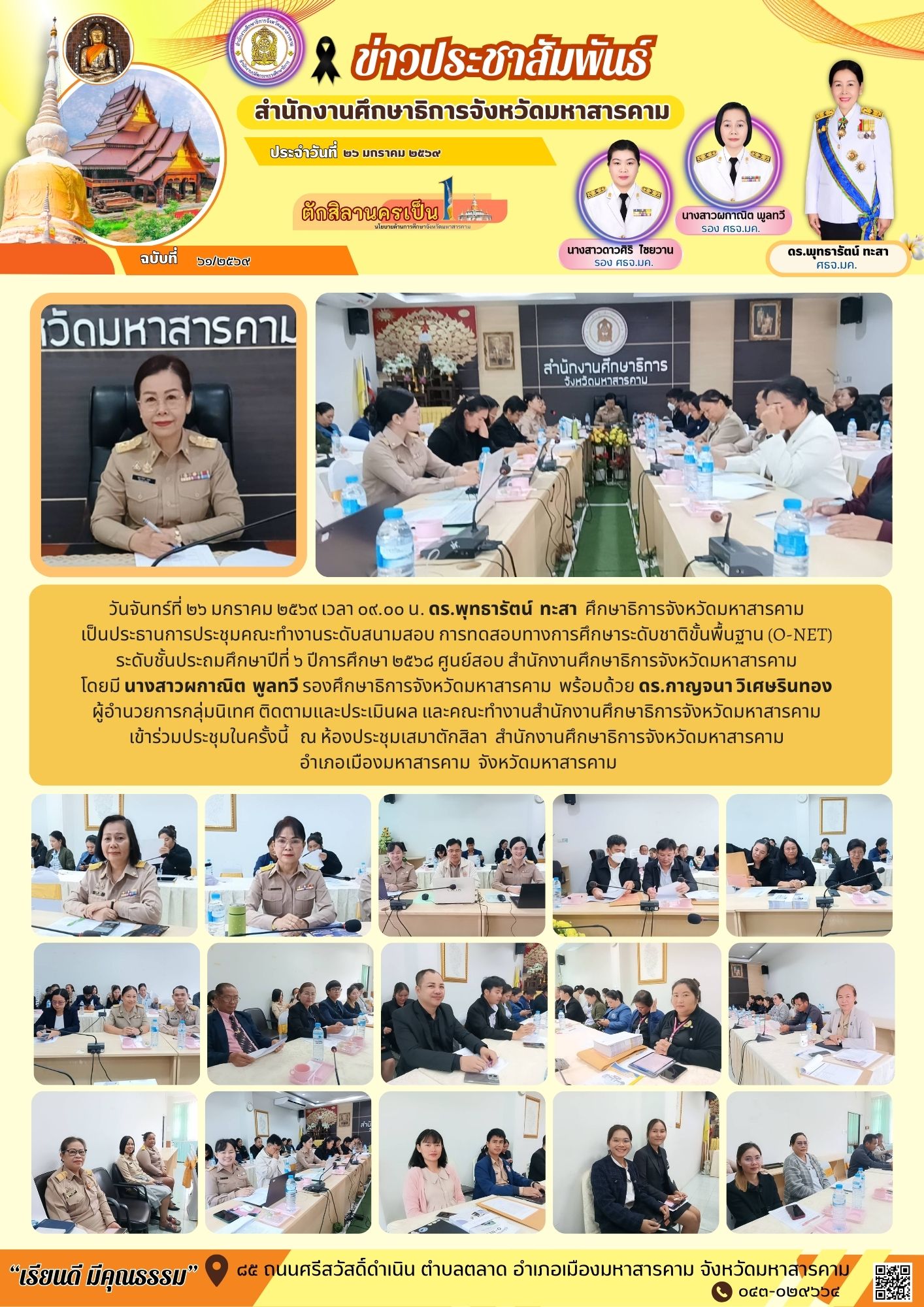 กิจกรรม วันจันทร์ที่ ๒๖ มกราคม ๒๕๖๙ เวลา ๐๙.๐๐ น. ดร.พุทธารัตน์ ทะสา ศึกษาธิการจังหวัดมหาสารคาม เป็นประธานการประชุมคณะทำงานระดับสนามสอบ การทดสอบทางการศึกษาระดับชาติขั้นพื้นฐาน (O-NET) ระดับชั้นประถมศึกษาปีที่ ๖ ปีการศึกษา ๒๕๖๘ ศูนย์สอบ สำนักงานศึกษาธิการจังหวัดมหาสารคาม โดยมี นางสาวผกาณิต พูลทวี รองศึกษาธิการจังหวัดมหาสารคาม พร้อมด้วย ดร.กาญจนา วิเศษรินทอง ผู้อำนวยการกลุ่มนิเทศ ติดตามและประเมินผล และคณะทำงานสำนักงานศึกษาธิการจังหวัดมหาสารคาม เข้าร่วมประชุมในครั้งนี้ ณ ห้องประชุมเสมาตักสิลา สำนักงานศึกษาธิการจังหวัดมหาสารคาม อำเภอเมืองมหาสารคาม จังหวัดมหาสารคาม Posted on 27 January 2026 by admin admin วันศุกร์ที่ ๒๓ มกราคม ๒๕๖๙ เวลา ๑๘.๓๐ น. ดร.พุทธารัตน์ ทะสา ศึกษาธิการจังหวัดมหาสารคาม พร้อมด้วยบุคลากรกลุ่มอำนวยการ เข้าร่วมพิธีเปิดกิจกรรมเดินแบบผ้าไทย “งานเส้นสายลายผ้า” ในงานประเพณีบุญเบิกฟ้าและงานกาชาดจังหวัดมหาสารคาม ประจำปี ๒๕๖๙ ณ เวทีกลางงานประเพณีบุญเบิกฟ้าและงานกาชาดจังหวัดมหาสารคาม อำเภอเมืองมหาสารคาม จังหวัดมหาสารคาม โดยมีนายชุมพิชญ์ เดชะรัฐ ผู้ว่าราชการจังหวัดมหาสารคาม เป็นประธาน วันจันทร์ที่ ๒๖ มกราคม ๒๕๖๙ เวลา ๑๓.๓๐ น. ดร.พุทธารัตน์ ทะสา ศึกษาธิการจังหวัดมหาสารคาม เป็นประธานการประชุมคณะทำงานระดับศูนย์สอบ การทดสอบทางการศึกษาระดับชาติขั้นพื้นฐาน (O-NET) ระดับชั้นประถมศึกษาปีที่ ๖ และชั้นมัธยมศึกษาปีที่ ๓ ปีการศึกษา ๒๕๖๘ ศูนย์สอบ สำนักงานศึกษาธิการจังหวัดมหาสารคาม โดยมี นางสาวผกาณิต พูลทวี รองศึกษาธิการจังหวัดมหาสารคาม นางสาวดาวศิริ ไชยวาน รองศึกษาธิการจังหวัดมหาสารคาม พร้อมด้วย ผู้อำนวยการกลุ่ม/หน่วย และคณะทำงานสำนักงานศึกษาธิการจังหวัดมหาสารคาม เข้าร่วมประชุมในครั้งนี้ ณ ห้องประชุมเสมาตักสิลา สำนักงานศึกษาธิการจังหวัดมหาสารคาม อำเภอเมืองมหาสารคาม จังหวัดมหาสารคาม