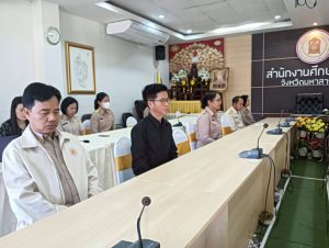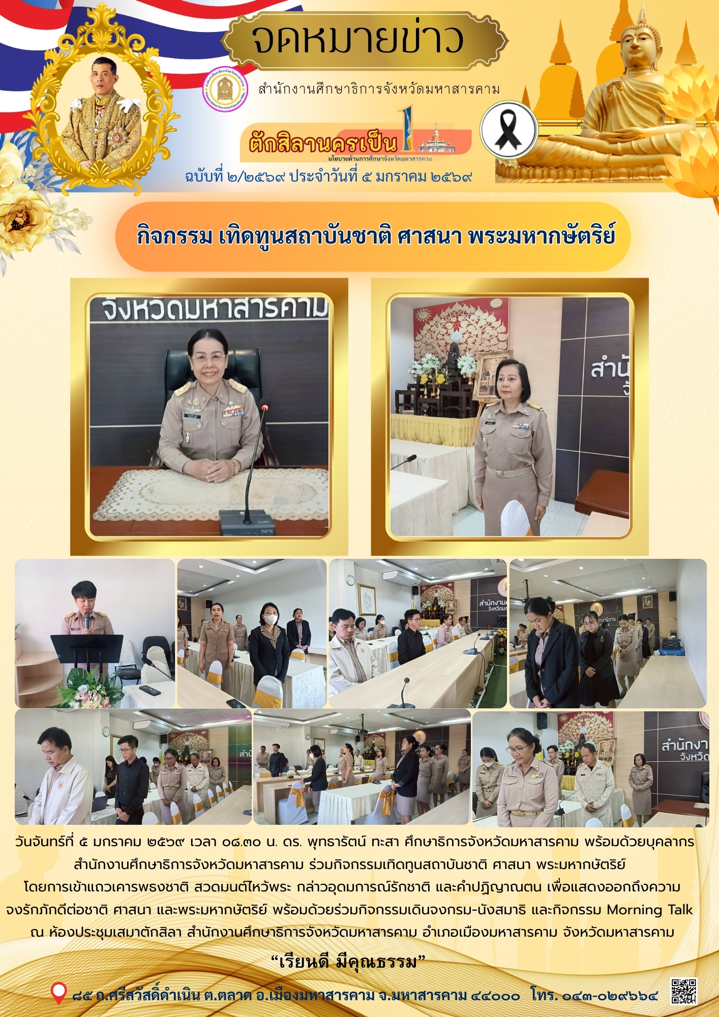 กิจกรรม วันจันทร์ที่ ๕ มกราคม ๒๕๖๙ เวลา ๐๘.๓๐ น. ดร. พุทธารัตน์ ทะสา ศึกษาธิการจังหวัดมหาสารคาม พร้อมด้วยบุคลากรสำนักงานศึกษาธิการจังหวัดมหาสารคาม ร่วมกิจกรรมเทิดทูนสถาบันชาติ ศาสนา พระมหากษัตริย์ โดยการเข้าแถวเคารพธงชาติ สวดมนต์ไหว้พระ กล่าวอุดมการณ์รักชาติ และคำปฏิญาณตน เพื่อแสดงออกถึงความจงรักภักดีต่อชาติ ศาสนา และพระมหากษัตริย์ พร้อมด้วยร่วมกิจกรรมเดินจงกรม-นังสมาธิ และกิจกรรม Morning Talk ณ ห้องประชุมเสมาตักสิลา สำนักงานศึกษาธิการจังหวัดมหาสารคาม อำเภอเมืองมหาสารคาม จังหวัดมหาสารคาม Posted on 5 January 2026 by admin admin วันศุกร์ ที่ 26 ธันวาคม 2568 เวลา 09.00น. ดร.พุทธารัตน์ ทะสา ศึกษาธิการจังหวัดมหาสารคาม มอบหมายให้ นางสาวดาวศิริ ไชยวาน รองศึกษาธิการจังหวัดมหาสารคาม เข้าร่วมงานวันป้องกันอุบัติภัยแห่งชาติประจำปี 2569 และพิธีเปิดศูนย์ปฏิบัติการป้องกันและลดอุบัติเหตุทางถนนช่วงเทศกาลปีใหม่พ.ศ 2569 จังหวัดมหาสารคาม ณ สวนสุขภาพเฉลิมพระเกียรติสมเด็จพระนางเจ้าสิริกิติ์พระบรมราชินีนาถ อำเภอเมืองมหาสารคาม โดยมี นายชุมพิชญ์ เดชะรัฐ ผู้ว่าราชการจังหวัดมหาสารคาม เป็นประธาน