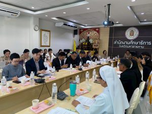 กิจกรรม วันจันทร์ที่ 1 ธันวาคม 2568 เวลา 09.30 น. ดร. พุทธารัตน์ ทะสา ศึกษาธิการจังหวัดมหาสารคาม เป็นประธานประชุม ผู้รับใบอนุญาตและผู้บริหารโรงเรียนเอกชนในระบบ ครั้งที่ 1/2568 เพื่อหารือแนวทางการพัฒนาการศึกษาเอกชน ซึ่งมีวาระการพิจารณา การดำเนินกิจกรรมของกลุ่มนิเทศ ติดตาม และประเมินผล และหน่วยตรวจสอบภายใน โดยมีผู้รับใบอนุญาต ผู้จัดการ ผู้อำนวยการ ข้าราชการสำนักงานศึกษาธิการจังหวัดมหาสารคาม เข้าร่วมประชุม ณ ห้องประชุมเสมาตักสิลา สำนักงานศึกษาธิการจังหวัดมหาสารคาม Posted on 1 December 20251 December 2025 by admin admin ประกาศกระทรวงศึกษาธิการ เรื่อง นโยบายและแนวทางการพัฒนาครู คณาจารย์ และบุคลากรทางการศึกษา ของกระทรวงศึกษาธิการ ประจำปีงบประมาณ พ.ศ. ๒๕๖๙ – ๒๕๗๐ วันจันทร์ที่ ๑ ธันวาคม ๒๕๖๘ เวลา ๑๔.๐๐ น. สำนักงานศึกษาธิการจังหวัดมหาสารคาม นำโดย ดร.พุทธารัตน์ ทะสา ศึกษาธิการจังหวัดมหาสารคาม พร้อมด้วย นางสาวดาวศิริ ไชยวาน รองศึกษาธิการจังหวัดมหาสารคาม และบุคลากรสำนักงานศึกษาธิการจังหวัดมหาสารคาม ประกาศเจตนารมณ์การขับเคลื่อนสำนักงานศึกษาธิการจังหวัดมหาสารคามเป็นองค์กรคุณธรรม ตามแผนปฏิบัติการด้านการส่งเสริมคุณธรรมแห่งชาติ ระยะที่ ๒ (พ.ศ. ๒๕๖๖-๒๕๗๐) ประจำปีงบประมาณ พ.ศ. ๒๕๖๙ เพื่อขับเคลื่อนสำนักงานศึกษาธิการจังหวัดมหาสารคาม ให้เป็นองค์กรคุณธรรม ภายใต้คุณธรรมหลัก “พอเพียง วินัย สุจริต จิตอาสา และกตัญญู”
