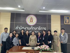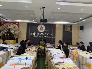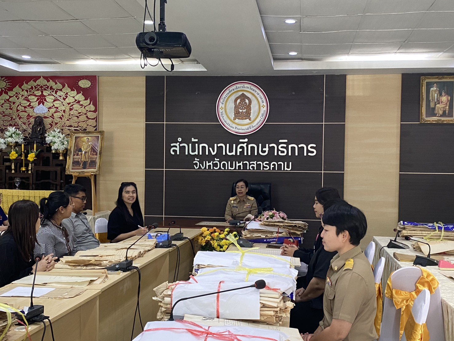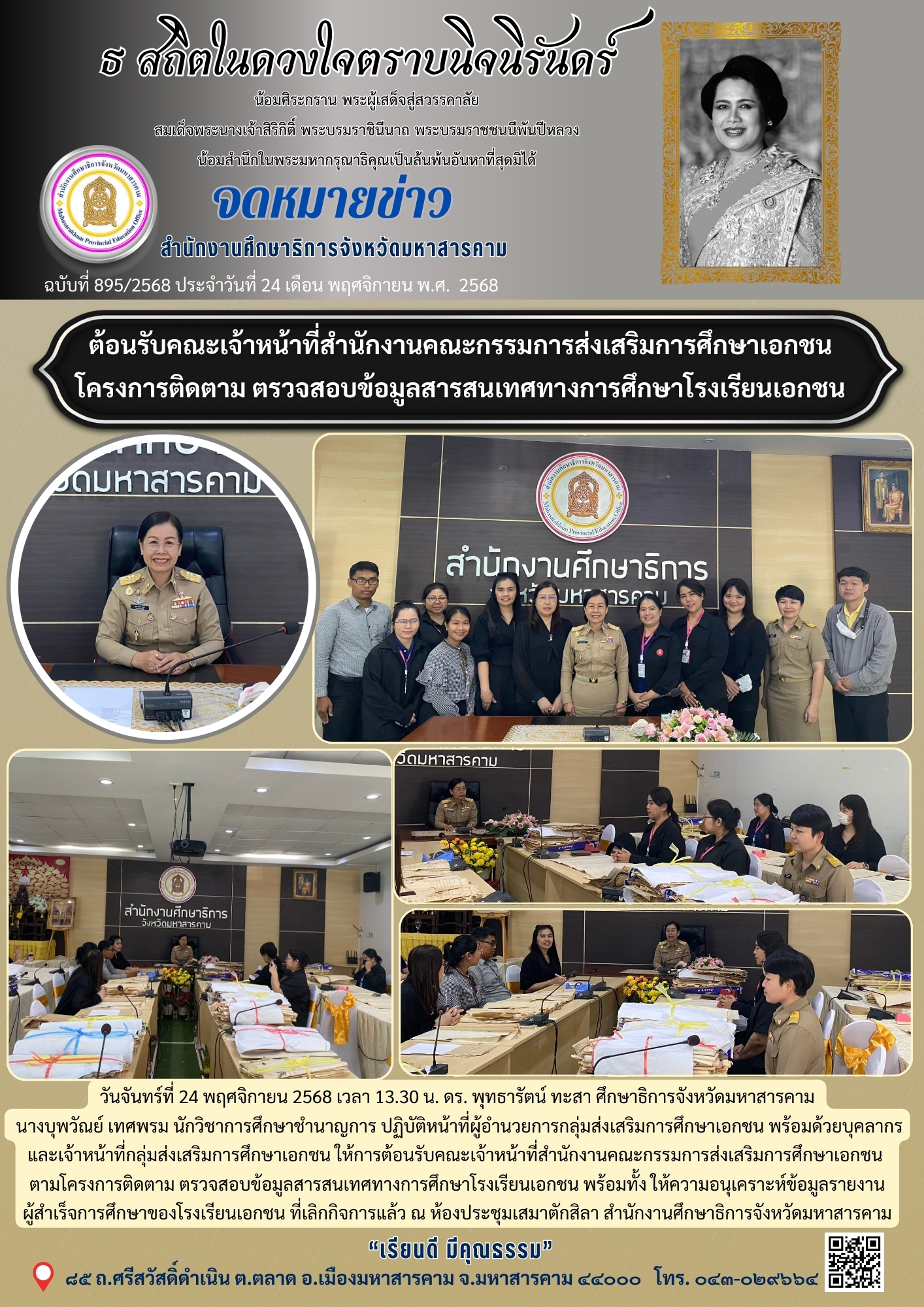 กิจกรรม วันจันทร์ที่ 24 พฤศจิกายน 2568 เวลา 13.30 น. ดร. พุทธารัตน์ ทะสา ศึกษาธิการจังหวัดมหาสารคาม นางบุพวัณย์ เทศพรม นักวิชาการศึกษาชำนาญการ ปฏิบัติหน้าที่ผู้อำนวยการกลุ่มส่งเสริมการศึกษาเอกชน พร้อมด้วยบุคลากรและเจ้าหน้าที่กลุ่มส่งเสริมการศึกษาเอกชน ให้การต้อนรับคณะเจ้าหน้าที่สำนักงานคณะกรรมการส่งเสริมการศึกษาเอกชน ตามโครงการติดตาม ตรวจสอบข้อมูลสารสนเทศทางการศึกษาโรงเรียนเอกชน พร้อมทั้ง ให้ความอนุเคราะห์ข้อมูลรายงาน ผู้สำเร็จการศึกษาของโรงเรียนเอกชน ที่เลิกกิจการแล้ว ณ ห้องประชุมเสมาตักสิลา สำนักงานศึกษาธิการจังหวัดมหาสารคาม Posted on 25 November 2025 by admin admin วันจันทร์ที่ 24 พฤศจิกายน 2568 เวลา 09.30 น. ดร. พุทธารัตน์ ทะสา ศึกษาธิการจังหวัดมหาสารคาม มอบหมายให้ บุคลากรกลุ่มส่งเสริมการศึกษาเอกชน นำโดย นางบุพวัณย์ เทศพรม นักวิชาการศึกษาชำนาญการ ปฏิบัติหน้าที่ผู้อำนวยการกลุ่มส่งเสริมการศึกษาเอกชน ออกเยี่ยม ติดตาม และให้กำลังใจเจ้าหน้าที่โรงเรียนเอกชน ที่มารับการจัดเก็บข้อมูลแบบรายงานผู้สำเร็จการศึกษา (ปพ.3) และข้อมูลการดำเนินกิจการของโรงเรียนในระบบ จากเจ้าหน้าที่สำนักงานคณะกรรมการส่งเสริมการศึกษาเอกชน (สช.) สำนักงานปลัดกระทรวงศึกษาธิการ ตามโครงการติดตาม ตรวจสอบข้อมูลสารสนเทศทางการศึกษาโรงเรียนเอกชนในจังหวัดมหาสารคาม กลุ่มที่ 1 ณ โรงเรียนอนุบาลกิติยา อำเภอเมืองมหาสารคาม จังหวัดมหาสารคาม