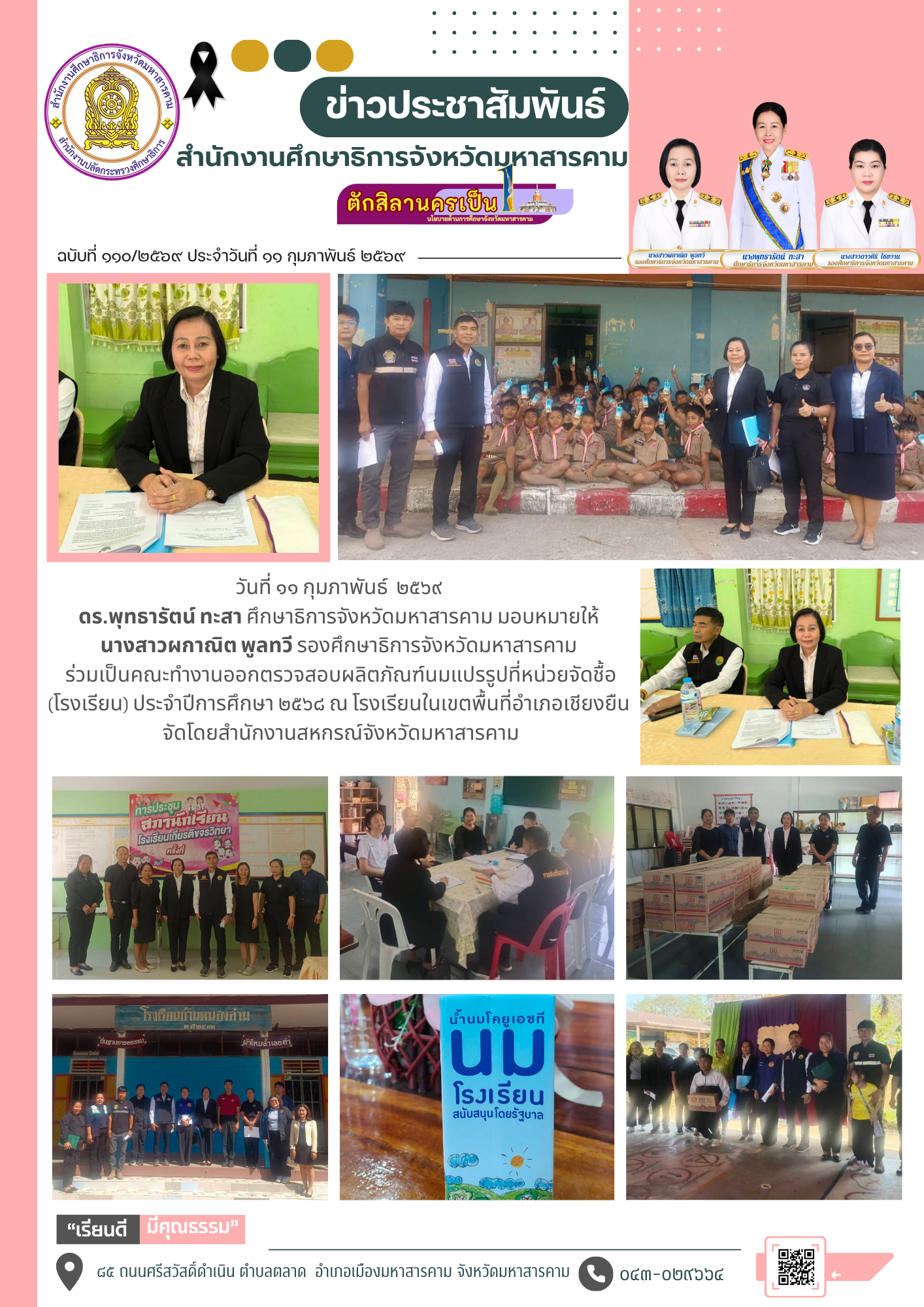 กิจกรรม วันที่ ๑๐ มกราคม ๒๕๖๙ ดร.พุทธารัตน์ ทะสา ศึกษาธิการจังหวัดมหาสารคาม มอบหมายให้ นางสาวผกาณิต พูลทวี รองศึกษาธิการจังหวัดมหาสารคาม ร่วมเป็นคณะทำงานออกตรวจสอบผลิตภัณฑ์นมแปรรูปที่หน่วยจัดชื้อ (โรงเรียน) ประจำปีการศึกษา ๒๕๖๘ ณ โรงเรียนในเขตพื้นที่อำเภอกันทรวิชัย จัดโดยสำนักงานสหกรณ์จังหวัดมหาสารคาม Posted on 12 February 2026 by admin admin วันที่ 11 กุมภาพันธ์ 2569 เวลา 10.00 น. ดร.พุทธารัตน์ ทะสา ศึกษาธิการจังหวัดมหาสารคาม มอบหมายให้ นางวรทิพ จันทรา ผู้อำนวยการกลุ่มลูกเสือ ยุวกาชาด และกิจการนักเรียน เข้าร่วมพิธีเปิดงานมหกรรมกลองยาวอีสาน (วัดป่าวังน้ำเย็น) ครั้งที่ 2 และงานนมัสการพระมหาธาตุเจดีย์ศรีมหาสารคาม ประจำปี พ.ศ. 2569 ณ วัดพุทธวนาราม (วัดป่าวังน้ำเย็น) ตำบลเกิ้ง อำเภอเมืองมหาสารคาม จังหวัดมหาสารคาม โดยมี นายสมเกียรติ วิริยะกุลนันท์ รองผู้ว่าราชการจังหวัดมหาสารคาม เป็นประธาน วันพุธ ที่ ๑๑ กุมภาพันธ์ ๒๕๖๙ ดร. พุทธารัตน์ ทะสา ศึกษาธิการจังหวัดมหาสารคาม พบปะผู้บริหาร ครูโรงเรียนเอกชน เพื่อขับเคลื่อนนโยบาย เรียนดี มีคุณธรรม และติดตาม การขับเคลื่อนนโยบายด้านการจัดการศึกษา “ตักสิลานครเป็นหนึ่ง” สู่การปฏิบัติอย่างมีประสิทธิภาพของโรงเรียนเอกชนในกำกับสำนักงานศึกษาธิการจังหวัดมหาสารคาม ณ โรงเรียนเซนต์แมรี่พยัคภูมิพิสัย และโรงเรียนอนุบาลเอี่ยมสุข อำเภอพยัคภูมิพิสัย จังหวัดมหาสารคาม ทั้งนี้ ได้มอบทุนการศึกษาให้กับโรงเรียนเพื่อนำไปพัฒนาผู้เรียนให้มีความสำนึกในพระมหากรุณาธิคุณของสมเด็จพระนางเจ้าสิริกิติ์พระบรมราชินีนาถ พระบรมราชชนนีพันปีหลวง