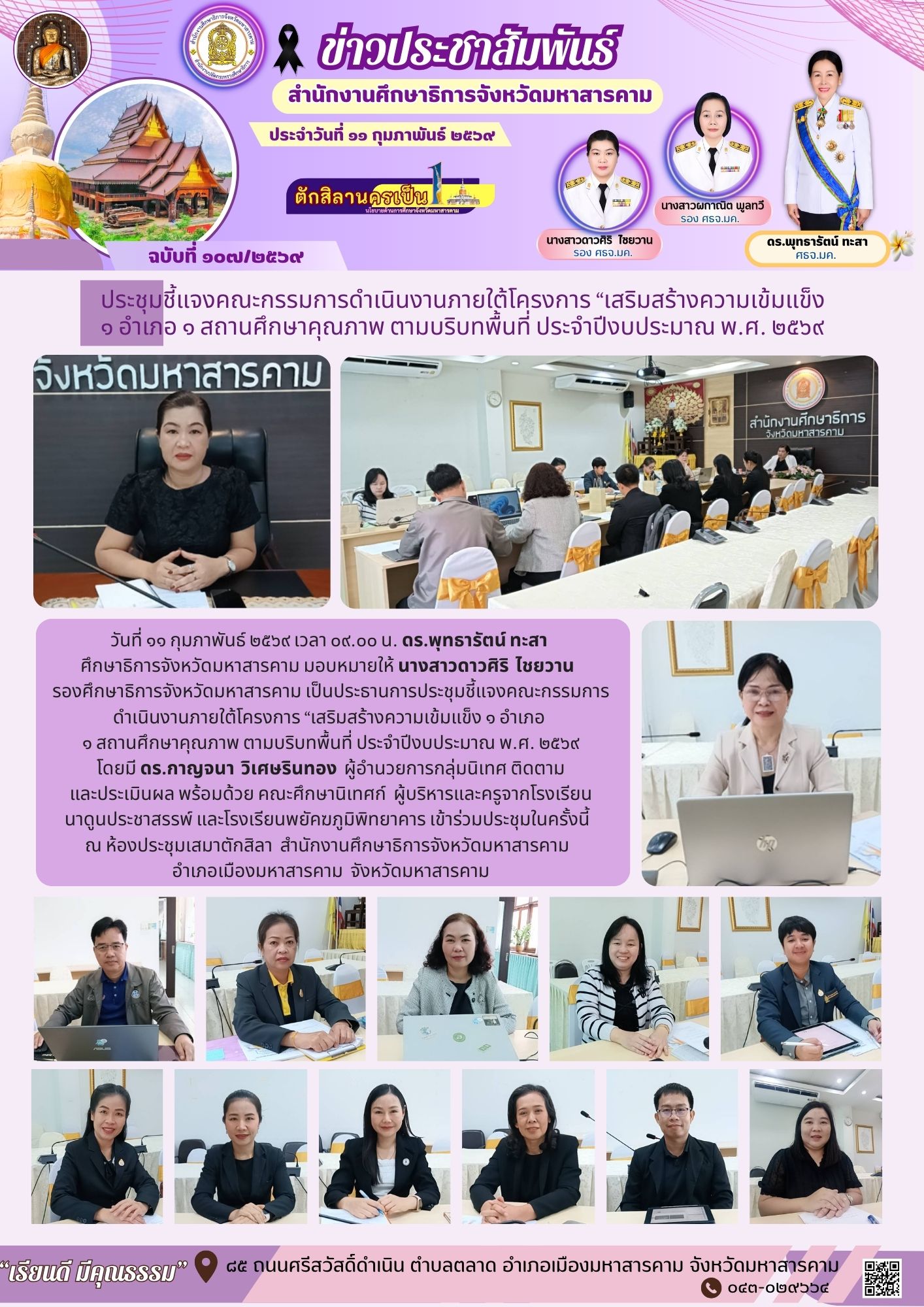 กิจกรรม วันที่ ๑๑ กุมภาพันธ์ ๒๕๖๙ เวลา ๐๙.๐๐ น. ดร.พุทธารัตน์ ทะสา ศึกษาธิการจังหวัดมหาสารคาม มอบหมายให้ นางสาวดาวศิริ ไชยวาน รองศึกษาธิการจังหวัดมหาสารคาม เป็นประธานการประชุมชี้แจงคณะกรรมการดำเนินงานภายใต้โครงการ “เสริมสร้างความเข้มแข็ง ๑ อำเภอ ๑ สถานศึกษาคุณภาพ ตามบริบทพื้นที่ ประจำปีงบประมาณ พ.ศ. ๒๕๖๙ โดยมี ดร.กาญจนา วิเศษรินทอง ผู้อำนวยการกลุ่มนิเทศ ติดตาม และประเมินผล พร้อมด้วย คณะศึกษานิเทศก์ ผู้บริหารและครูจากโรงเรียนนาดูนประชาสรรพ์ และโรงเรียนพยัคฆภูมิพิทยาคาร เข้าร่วมประชุมในครั้งนี้ ณ ห้องประชุมเสมาตักสิลา สำนักงานศึกษาธิการจังหวัดมหาสารคาม อำเภอเมืองมหาสารคาม จังหวัดมหาสารคาม Posted on 12 February 2026 by admin admin วันที่ ๙-๑๑ กุมภาพันธ์ ๒๕๖๙ ดร.พุทธารัตน์ ทะสา ศึกษาธิการจังหวัดมหาสารคาม มอบหมายให้ ดร.นงลักษณ์ มีแก้ว ศึกษานิเทศก์ชำนาญการพิเศษ สำนักงานศึกษาธิการจังหวัดมหาสารคาม พร้อมด้วยทีมวิทยากรแกนนำคุณภาพจังหวัดมหาสารคาม ได้แก่ ดร.อรชุมา ด้วงช้าง ศึกษานิเทศก์ชำนาญการพิเศษ สำนักงานเขตพื้นที่การศึกษามัธยมศึกษามหาสารคาม ดร.พลพิศิษฐ์ ตาละซอน ศึกษานิเทศก์ชำนาญการพิเศษ สำนักงานเขตพื้นที่การศึกษาประถมศึกษามหาสารคาม เขต ๑ และ ดร.อุษณีย์ ดวงพรม ศึกษานิเทศก์ชำนาญการพิเศษ สำนักงานเขตพื้นที่การศึกษาประถมศึกษามหาสารคาม เขต ๓ เข้าร่วมประชุม เชิงปฏิบัติการหลักสูตรการเพิ่มพูนสมรรถนะการจัดการเรียนรู้ของครู ที่เอื้อต่อการพัฒนาทักษะผู้เรียนในศตวรรษที่ ๒๑ ตามโครงการพัฒนาสมรรถนะครูและบุคลากรทางการศึกษาโดยความร่วมมือของภาคีเครือข่าย ในระดับพื้นที่ ประจำปีงบประมาณ พ.ศ.๒๕๖๙ โดยมี ดร.สุเทพ แก่งสันเที๊ยะ ปลัดกระทรวงศึกษาธิการ เป็นประธานพิธีเปิดและบรรยายพิเศษ ณ สถาบันพัฒนาครู คณาจารย์และบุคลากรทางการศึกษา อำเภอสามพราน จังหวัดนครปฐม วันพุธที่ ๑๑ กุมภาพันธ์ ๒๕๖๙ เวลา ๐๙.๐๐ น. ดร.พุทธารัตน์ ทะสา ศึกษาธิการจังหวัดมหาสารคาม ออกตรวจเยี่ยมให้กำลังใจคณะครูและนักเรียนในการดำเนินการประเมิน ความสามารถด้านการอ่านของผู้เรียน ชั้นประถมศึกษาปีที่ ๑ (RT) ปีการศึกษา ๒๕๖๘ โรงเรียนเซนต์แมรี่พยัคฆภูมิพิสัย และโรงเรียนอนุบาลเอี่ยมสุข อำเภอพยัคฆภูมิพิสัย จังหวัดมหาสารคาม เพื่อนำผลจากการประเมิน มาเป็นข้อมูลสำคัญที่สะท้อนคุณภาพผู้เรียน คุณภาพการจัดการศึกษา ให้บรรลุเป้าหมาย สมรรถนะเด็กและเยาวชนตักสิลานคร “คุณภาพคู่คุณธรรม”