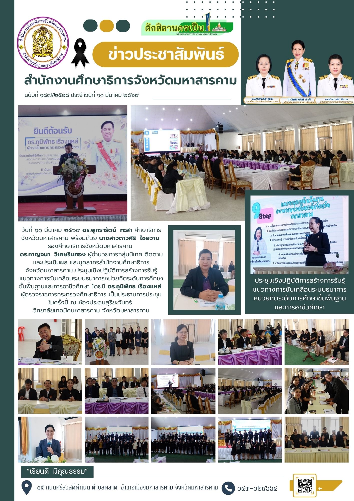กิจกรรม วันที่ ๑๑ มีนาคม ๒๕๖๙ ดร.พุทธารัตน์ ทะสา ศึกษาธิการ จังหวัดมหาสารคาม พร้อมด้วย นางสาวดาวศิริ ไชยวาน รองศึกษาธิการจังหวัดมหาสารคาม ดร.กาญจนา วิเศษรินทอง ผู้อำนวยการกลุ่มนิเทศ ติดตามและประเมินผล และบุคลากรสำนักงานศึกษาธิการ จังหวัดมหาสารคาม ประชุมเชิงปฏิบัติการสร้างการรับรู้แนวทางการขับเคลื่อนระบบธนาคารหน่วยกิตระดับการศึกษา ขั้นพื้นฐานและการอาชีวศึกษา โดยมี ดร.ภูมิพัทธ เรืองแหล่ ผู้ตรวจราชการกระทรวงศึกษาธิการ เป็นประธานการประชุม ในครั้งนี้ ณ ห้องประชุมสุริยะจันทร์ วิทยาลัยเทคนิคมหาสารคาม จังหวัดมหาสารคาม Posted on 16 March 202616 March 2026 by admin admin วันที่ ๑๑ มีนาคม ๒๕๖๙ เวลา ๐๘.๐๐ น. ดร.พุทธารัตน์ ทะสา ศึกษาธิการจังหวัดมหาสารคาม มอบหมายให้ นางสาวผกาณิต พูลทวี รองศึกษาธิการจังหวัดมหาสารคาม พร้อมด้วย นายกริณทร์ สิมลิลาด นักวิชาการศึกษาชำนาญการ เข้าร่วมการประชุมเชิงปฏิบัติการแลกเปลี่ยนเรียนรู้การขับเคลื่อนการแก้ไขปัญหาเด็กและเยาวชนนอกระบบการศึกษา ให้กลายเป็นศูนย์ Thailand Zero Dropout จังหวัดขอนแก่น ณ ห้องประชุมมงกุฎเพชร โรงแรมโฆษะขอนแก่น อำเภอเมืองขอนแก่น จังหวัดขอนแก่น ทั้งนี้ได้รับเกียรติจาก นายสุรศักดิ์ อินศรีไกร รองปลัดกระทรวงศึกษาธิการ เป็นประธาน วันพุธที่ ๑๑ มีนาคม ๒๕๖๙ เวลา ๑๓.๓๐ น. ดร.พุทธารัตน์ ทะสา ศึกษาธิการจังหวัดมหาสารคาม นางสาวผกาณิต พูลทวี นางสาวดาวศิริ ไชยวาน รองศึกษาธิการจังหวัดมหาสารคาม พร้อมด้วยหน่วยงานทางการศึกษาทั้ง ๘ หน่วยงาน ร่วมประชุมปรึกษาหารือการดำเนินโครงการพบปะแลกเปลี่ยนความคิดเห็นและสร้างความสามัคคี (สภากาแฟ) ประจำปี ๒๕๖๙ ครั้งที่ ๑/๒๕๖๙ ณ ห้องประชุมเสมาตักสิลา สำนักงานศึกษาธิการจังหวัดมหาสารคาม