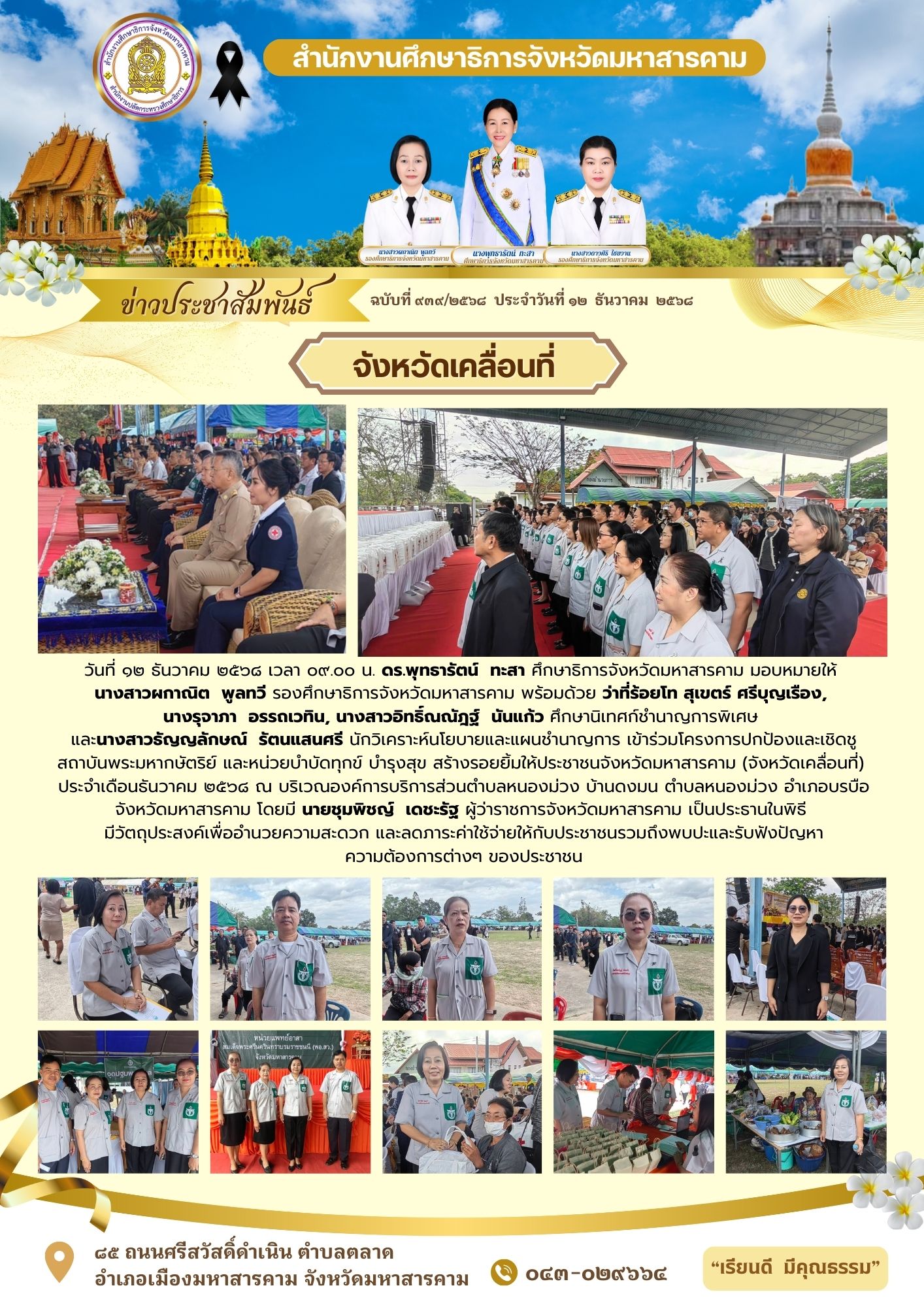กิจกรรม วันที่ ๑๒ ธันวาคม ๒๕๖๘ เวลา ๐๙.๐๐ น. ดร.พุทธารัตน์ ทะสา ศึกษาธิการจังหวัดมหาสารคาม มอบหมายให้ นางสาวผกาณิต พูลทวี รองศึกษาธิการจังหวัดมหาสารคาม พร้อมด้วย ว่าที่ร้อยโท สุเขตร์ ศรีบุญเรือง, นางรุจาภา อรรถเวทิน, นางสาวอิทธิ์ณณัฎฐ์ นันแก้ว ศึกษานิเทศก์ชำนาญการพิเศษ และนางสาวธัญญลักษณ์ รัตนแสนศรี นักวิเคราะห์นโยบายและแผนชำนาญการ เข้าร่วมโครงการปกป้องและเชิดชู สถาบันพระมหากษัตริย์ และหน่วยบำบัดทุกข์ บำรุงสุข สร้างรอยยิ้มให้ประชาชนจังหวัดมหาสารคาม (จังหวัดเคลื่อนที่) ประจำเดือนธันวาคม ๒๕๖๘ ณ บริเวณองค์การบริการส่วนตำบลหนองม่วง บ้านดงมน ตำบลหนองม่วง อำเภอบรบือ จังหวัดมหาสารคาม โดยมี นายชุมพิชญ์ เดชะรัฐ ผู้ว่าราชการจังหวัดมหาสารคาม เป็นประธานในพิธี มีวัตถุประสงค์เพื่ออำนวยความสะดวก และลดภาระค่าใช้จ่ายให้กับประชาชนรวมถึงพบปะและรับฟังปัญหา ความต้องการต่างๆ ของประชาชน Posted on 12 December 202512 December 2025 by admin admin วันที่ 11 ธันวาคม 2568 เวลา 13.30 น. ดร.พุทธารัตน์ ทะสา ศึกษาธิการจังหวัดมหาสารคาม พร้อมด้วย นางสาวผกาณิต พูลทวี รองศึกษาธิการจังหวัดมหาสารคาม นางสาวดาวศิริ ไชยวาน รองศึกษาธิการจังหวัดมหาสารคาม และบุคลากรกลุ่มพัฒนาการศึกษา ร่วมประชุมคณะอนุกรรมการพัฒนาการศึกษา ครั้งที่ 4/2568 ณ ห้องประชุมเสมาตักสิลา สำนักงานศึกษาธิการจังหวัดมหาสารคาม ซึ่งที่ประชุมได้พิจารณา 1.การโอนสถานศึกษาขั้นพื้นฐานไปสังกัดองค์กรปกครองส่วนท้องถิ่น(สังกัด สพม.มหาสารคาม)จำนวน 1 แห่ง 2.การดำเนินงานการรับนักเรียน สังกัด สพฐ. ประจำปีการศึกษา 2569 ทั้งนี้ได้รับเกียรติจาก ดร.สุรัตน์ ดวงชาทม ประธานคณะอนุกรรมการพัฒนาการศึกษา เป็นประธานในการประชุมครั้งนี้