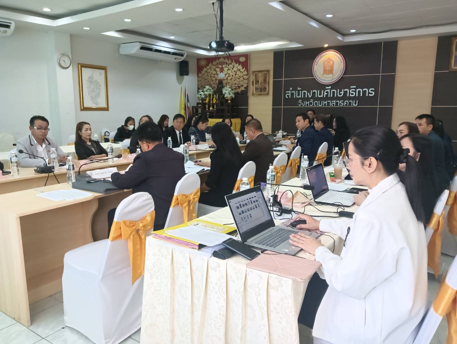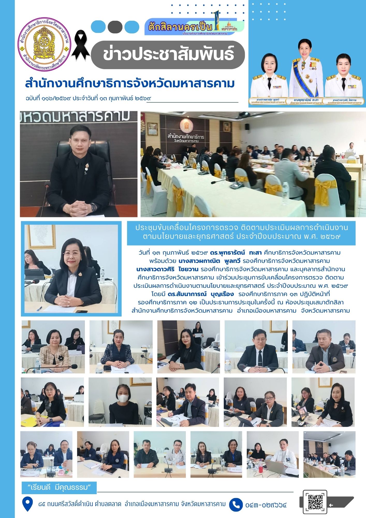 กิจกรรม วันที่ ๑๓ กุมภาพันธ์ ๒๕๖๙ ดร.พุทธารัตน์ ทะสา ศึกษาธิการจังหวัดมหาสารคาม พร้อมด้วย นางสาวผกาณิต พูลทวี รองศึกษาธิการจังหวัดมหาสารคาม นางสาวดาวศิริ ไชยวาน รองศึกษาธิการจังหวัดมหาสารคาม และบุคลากรสำนักงานศึกษาธิการจังหวัดมหาสารคาม เข้าร่วมประชุมการขับเคลื่อนโครงการตรวจ ติดตาม ประเมินผลการดำเนินงานตามนโยบายและยุทธศาสตร์ ประจำปีงบประมาณ พ.ศ. ๒๕๖๙ โดยมี ดร.สัมนาการณ์ บุญเรือง รองศึกษาธิการภาค ๑๓ ปฏิบัติหน้าที่รองศึกษาธิการภาค ๑๒ เป็นประธานการประชุมในครั้งนี้ ณ ห้องประชุมเสมาตักสิลา สำนักงานศึกษาธิการจังหวัดมหาสารคาม อำเภอเมืองมหาสารคาม จังหวัดมหาสารคาม Posted on 13 February 202613 February 2026 by admin admin วันศุกร์ที่ 13 ก.พ. 2569 เวลา 09.00 น. ดร.พุทธารัตน์ ทะสา ศึกษาธิการจังหวัดมหาสารคาม พร้อมด้วย ดร.กาญจนา วิเศษรินทอง ผู้อำนวยการกลุ่มนิเทศติดตามและประเมินผล นางอรดี วรรณคำ ผู้อำนวยการกลุ่มพัฒนาการศึกษา นายธีระเดช รัตนเมือง ผู้อำนวยการหน่วยตรวจสอบภายใน และเจ้าหน้าที่คุรุสภาประจำศึกษาธิการจังหวัดมหาสารคาม ร่วมพิธีทำบุญสำนักงาน สกสค.จังหวัดมหาสารคาม และแสดงความยินดีกับ ดร.ปราณี รัตนธรรม เข้ารับตำแหน่ง ผู้อำนวยการสำนักงานคณะกรรมการส่งเสริมสวัสดิการและสวัสดิภาพครูและบุคลากรทางการศึกษา จังหวัดมหาสารคาม ณ สำนักงานคณะกรรมการส่งเสริมสวัสดิการและสวัสดิภาพครูและบุคลากรทางการศึกษา จังหวัดมหาสารคาม ตำบลแวงน่าง อำเภอเมืองมหาสารคาม จังหวัดมหาสารคาม