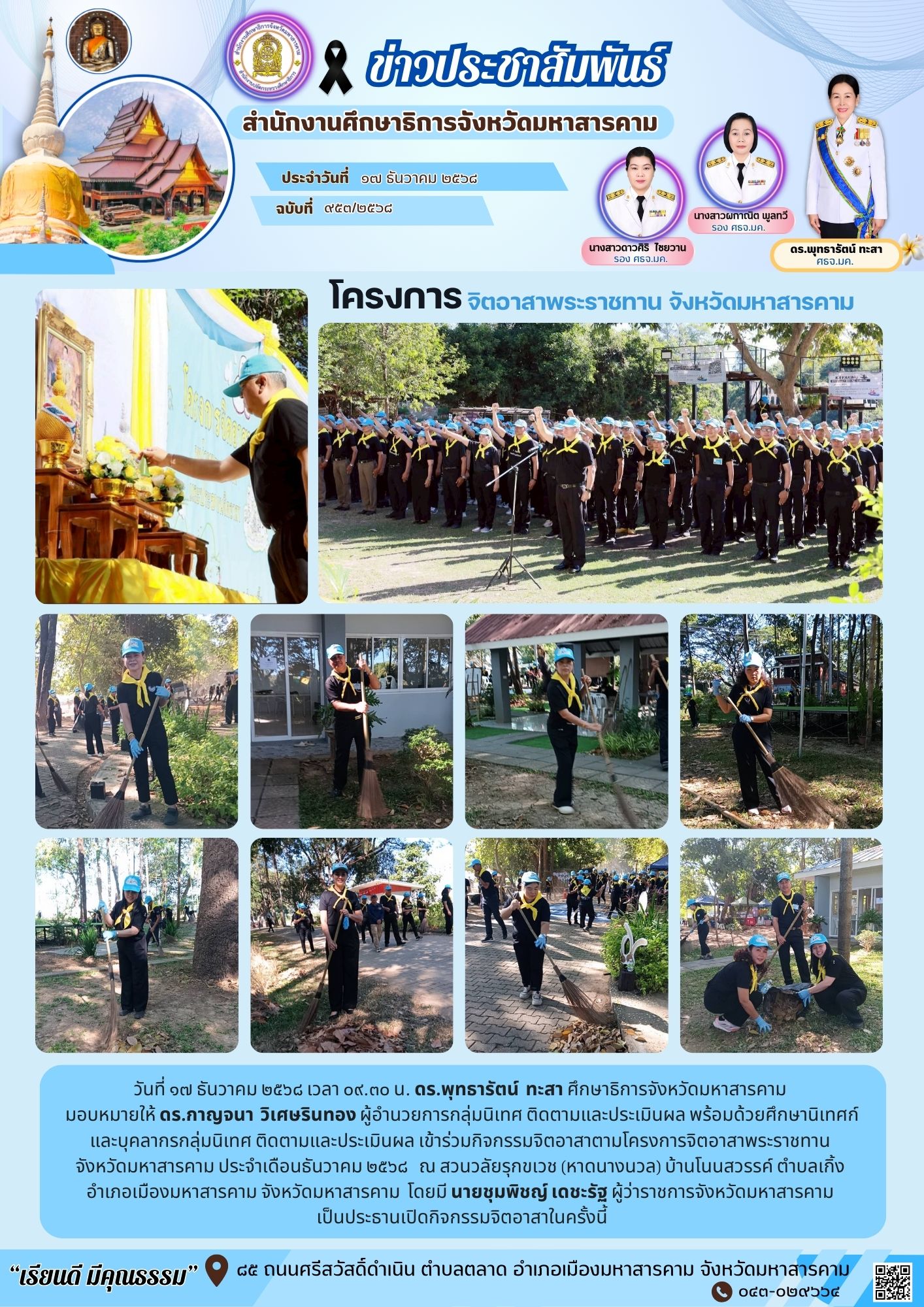 กิจกรรม วันที่ ๑๗ ธันวาคม ๒๕๖๘ เวลา ๐๙.๓๐ น. ดร.พุทธารัตน์ ทะสา ศึกษาธิการจังหวัดมหาสารคาม มอบหมายให้ ดร.กาญจนา วิเศษรินทอง ผู้อำนวยการกลุ่มนิเทศ ติดตามและประเมินผล พร้อมด้วยศึกษานิเทศก์ และบุคลากรกลุ่มนิเทศ ติดตามและประเมินผล เข้าร่วมกิจกรรมจิตอาสาตามโครงการจิตอาสาพระราชทาน จังหวัดมหาสารคาม ประจำเดือนธันวาคม ๒๕๖๘ ณ สวนวลัยรุกขเวช (หาดนางนวล) บ้านโนนสวรรค์ ตำบลเกิ้ง อำเภอเมืองมหาสารคาม จังหวัดมหาสารคาม โดยมี นายชุมพิชญ์ เดชะรัฐ ผู้ว่าราชการจังหวัดมหาสารคาม เป็นประธานเปิดกิจกรรมจิตอาสาในครั้งนี้ Posted on 17 December 2025 by admin (kittitat) admin (kittitat) วันอังคารที่ ๑๖ ธันวาคม ๒๕๖๘ เวลา ๐๙.๓๐ น. ดร.พุทธารัตน์ ทะสา ศึกษาธิการจังหวัดมหาสารคาม มอบหมายให้ นางสาวผกาณิต พูลทวี รองศึกษาธิการจังหวัด มหาสารคาม และนางชลดา พิมพิบาล นักวิชาการศึกษาชำนาญการ เข้าร่วมเป็นวิทยากรบรรยาย ในการประชุมชี้แจงให้ความรู้เรื่องโครงการ เพิ่มทักษะด้านอาชีพแก่นักเรียนที่ไม่ได้เรียนต่อหลังจบการศึกษา ภาคบังคับ ประจำปีงบประมาณ พ.ศ.๒๕๖๙ หัวข้อ”ขั้นตอนการสำรวจ การรวบรวม การสรุปและจำแนกข้อมูลนักเรียนกลุ่มเป้าหมาย โดยมี ดร.ประชา แสนเย็น รองผู้อำนวยการสำนักงานเขตพื้นที่การศึกษาประถมศึกษามหาสารคาม เขต ๓ เป็นประธานในพิธีเปิดการประชุม ณ ห้องประชุมสำนักงานเขตพื้นที่การศึกษาประถมศึกษา มหาสารคาม เขต ๓ อำเภอโกสุมพิสัย จังหวัดมหาสารคาม