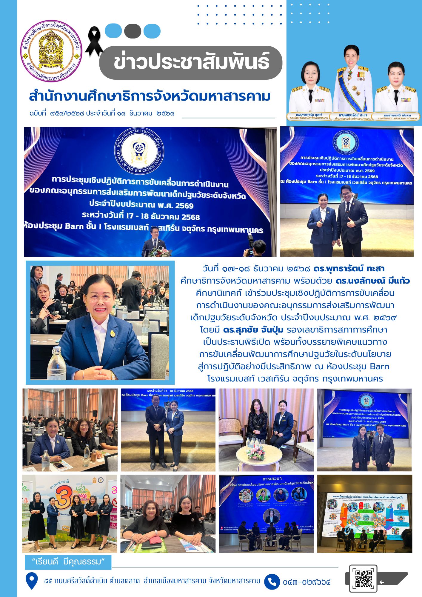 กิจกรรม วันที่ ๑๗-๑๘ ธันวาคม ๒๕๖๘ ดร.พุทธารัตน์ ทะสา ศึกษาธิการจังหวัดมหาสารคาม พร้อมด้วย ดร.นงลักษณ์ มีแก้ว ศึกษานิเทศก์ เข้าร่วมประชุมเชิงปฏิบัติการการขับเคลื่อน การดำเนินงานของคณะอนุกรรมการส่งเสริมการพัฒนา เด็กปฐมวัยระดับจังหวัด ประจำปีงบประมาณ พ.ศ. ๒๕๖๙ โดยมี ดร.สุภชัย จันปุ่ม รองเลขาธิการสภาการศึกษา เป็นประธานพิธีเปิด พร้อมทั้งบรรยายพิเศษแนวทาง การขับเคลื่อนพัฒนาการศึกษาปฐมวัยในระดับนโยบาย สู่การปฏิบัติอย่างมีประสิทธิภาพ ณ ห้องประชุม Barn โรงแรมเบสท์ เวสเทิร์น จตุจักร กรุงเทพมหานคร Posted on 19 December 202519 December 2025 by admin (kittitat) admin (kittitat) วันที่ 16 ธันวาคม 2568 เวลา 13.30 น. ดร.พุทธารัตน์ ทะสา ศึกษาธิการจังหวัดมหาสารคาม มอบหมายให้ นางสาวผกาณิต พูลทวี รองศึกษาธิการจังหวัดมหาสารคาม และบุคลากรในสังกัดสำนักงานศึกษาธิการจังหวัดมหาสารคาม ร่วมมอบสิ่งของเพื่อช่วยเหลือผู้อพยพและได้รับผลกระทบ จากการปะทะตามแนวชายแดนไทย – กัมพูชา ที่เข้ามาพักอาศัยในพื้นที่จังหวัดมหาสารคาม โดยมี นายกองเอก เสนีย์ มะโน รองผู้ว่าราชการจังหวัดมหาสารคาม เป็นประธานในการรับมอบ ฯ ณ ที่ว่าการอำเภอเมืองมหาสารคาม จังหวัดมหาสารคาม วันที่ ๑๘ ธันวาคม ๒๕๖๘ เวลา ๐๙.๐๐ น. ดร.พุทธารัตน์ ทะสา ศึกษาธิการจังหวัดมหาสารคาม มอบหมายให้ นางสาวธนาภา บุญครอบ ศึกษานิเทศก์ชำนาญการพิเศษ เป็นคณะกรรมการ สรรหาและคัดเลือก “ครูดีเด่น” เนื่องในโอกาสวันครู ประจำปี พ.ศ. ๒๕๖๙ สำหรับข้าราชการครู และบุคลากรทางการศึกษาในอำเภอชื่นชม จังหวัดมหาสารคาม ณ ห้องประชุม โรงเรียนกระบากวิทยาคาร ตำบลเหล่าดอกไม้ อำเภอชื่นชม จังหวัดมหาสารคาม