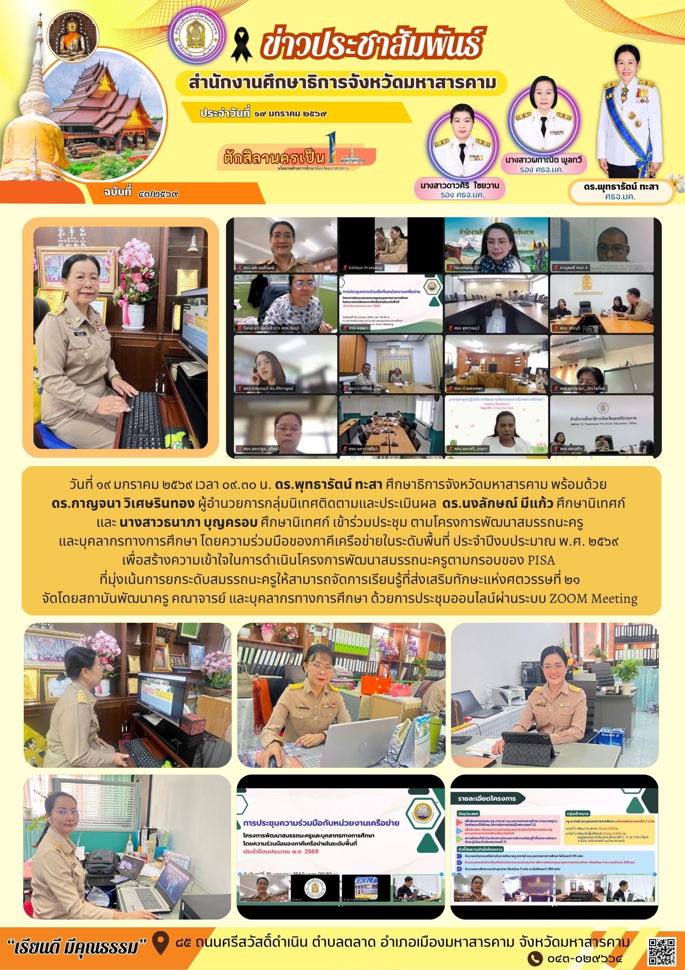 วันที่ ๑๙ มกราคม ๒๕๖๙ เวลา ๐๙.๓๐ น. ดร.พุทธารัตน์ ทะสา ศึกษาธิการจังหวัดมหาสารคาม พร้อมด้วย ดร.กาญจนา วิเศษรินทอง ผู้อำนวยการกลุ่มนิเทศติดตามและประเมินผล ดร.นงลักษณ์ มีแก้ว ศึกษานิเทศก์ และ นางสาวธนาภา บุญครอบ ศึกษานิเทศก์ เข้าร่วมประชุม ตามโครงการพัฒนาสมรรถนะครู และบุคลากรทางการศึกษา โดยความร่วมมือของภาคีเครือข่ายในระดับพื้นที่ ประจำปีงบประมาณ พ.ศ. ๒๕๖๙ เพื่อสร้างความเข้าใจในการดำเนินโครงการพัฒนาสมรรถนะครูตามกรอบของ PISA ที่มุ่งเน้นการยกระดับสมรรถนะครูให้สามารถจัดการเรียนรู้ที่ส่งเสริมทักษะแห่งศตวรรษที่ ๒๑ จัดโดยสถาบันพัฒนาครู คณาจารย์ และบุคลากรทางการศึกษา ด้วยการประชุมออนไลน์ผ่านระบบ ZOOM Meeting
