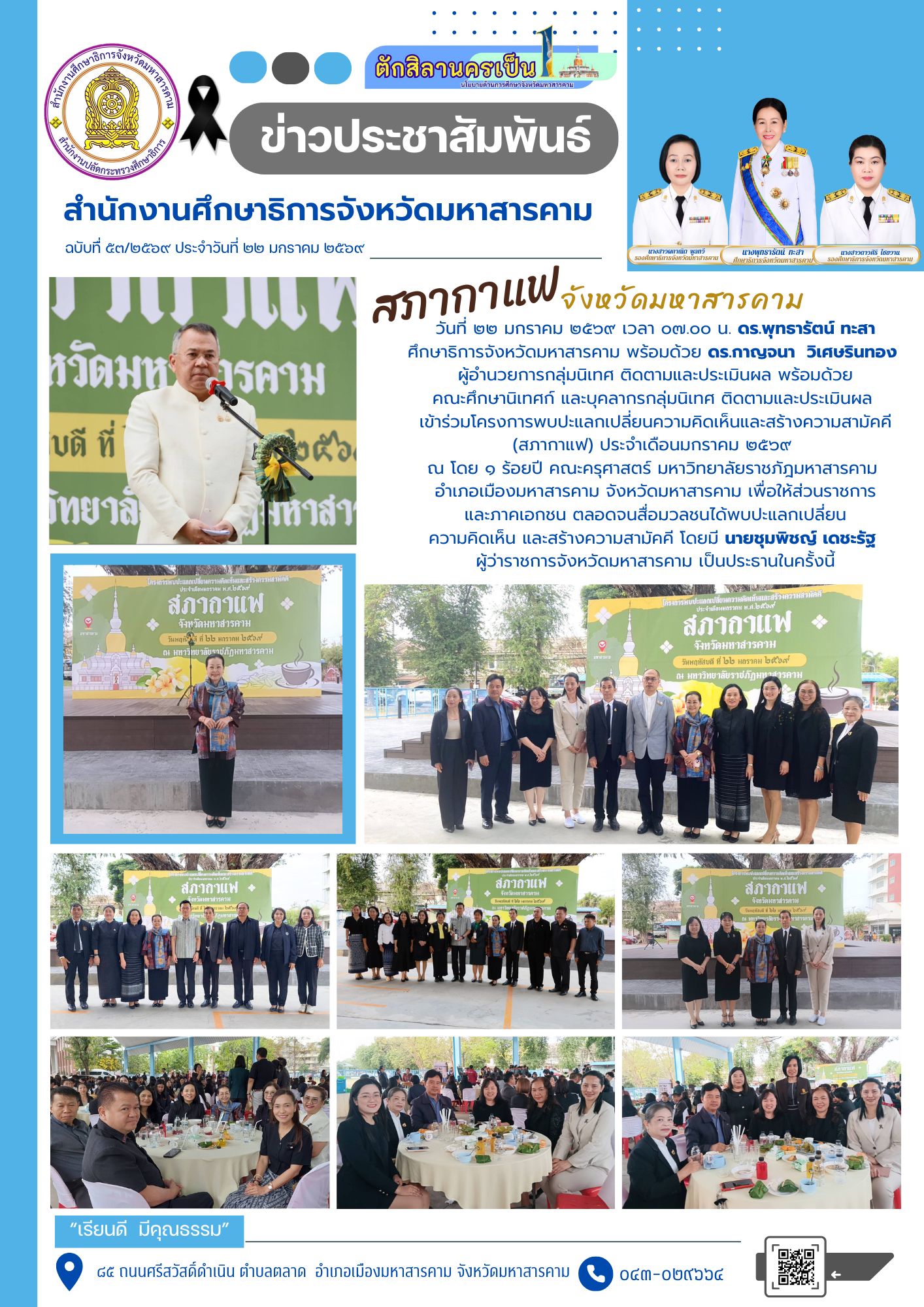 กิจกรรม วันที่ ๒๒ มกราคม ๒๕๖๙ เวลา ๐๗.๐๐ น. ดร.พุทธารัตน์ ทะสา ศึกษาธิการจังหวัดมหาสารคาม พร้อมด้วย ดร.กาญจนา วิเศษรินทอง ผู้อำนวยการกลุ่มนิเทศ ติดตามและประเมินผล พร้อมด้วย คณะศึกษานิเทศก์ และบุคลากรกลุ่มนิเทศ ติดตามและประเมินผล เข้าร่วมโครงการพบปะแลกเปลี่ยนความคิดเห็นและสร้างความสามัคคี (สภากาแฟ) ประจำเดือนมกราคม ๒๕๖๙ ณ โดย ๑ ร้อยปี คณะครุศาสตร์ มหาวิทยาลัยราชภัฎมหาสารคาม อำเภอเมืองมหาสารคาม จังหวัดมหาสารคาม เพื่อให้ส่วนราชการ และภาคเอกชน ตลอดจนสื่อมวลชนได้พบปะแลกเปลี่ยน ความคิดเห็น และสร้างความสามัคคี โดยมี นายชุมพิชญ์ เดชะรัฐ ผู้ว่าราชการจังหวัดมหาสารคาม เป็นประธานในครั้งนี้ Posted on 22 January 2026 by admin admin วันศุกร์ที่ ๑๙- ๒๑ มกราคม ๒๕๖๙ เวลา ๐๙.๐๐- ๑๖.๐๐ น. ดร.พุทธารัตน์ ทะสา ศึกษาธิการจังหวัดมหาสารคาม มอบหมาย กลุ่มพัฒนาการศึกษา จัดประชุมอบรมเชิงปฏิบัติการการใช้งานระบบสารสนเทศ Thailand Zero Dropout เพื่อสร้างองค์ความรู้ในการใช้งานระบบติดตามแก้ไขปัญหาเด็กและเยาวชนนอกระบบการศึกษา ให้กลายเป็นศูนย์ ร่วมกับบุคลากรจากหน่วยงานทางการศึกษา ที่เกี่ยวข้องเพื่อพัฒนาวิทยากร ครู ก. การใช้งานระบบสารสนเทศ Thailand Zero Dropout ทั้งนี้ได้รับความอนุเคราะห์วิทยากรจากกองทุนเพื่อความเสมอภาคทางการศึกษา (กสศ.) ณ ห้องประชุมเสมาตักสิลา สำนักงานศึกษาธิการจังหวัดมหาสารคาม อำเภอเมืองมหาสารคาม จังหวัดมหาสารคาม วันที่ 22 – 23 มกราคม 2569 เวลา 09.00 น. ดร.พุทธารัตน์ ทะสา ศึกษาธิการจังหวัดมหาสารคาม ได้มอบหมายให้ นางสาวผกาณิต พูลทวี รองศึกษาธิการจังหวัดมหาสารคาม พร้อมด้วย 1.นางกาญจนา วิเศษรินทอง ผู้อำนวยการกลุ่มนิเทศติดตามและประเมินผล 2.นางสาวพัชรินทร์ ทับทิมไสย์ ผู้อำนวยการนโยบายและแผน 3.นางสาวธัญญลักษณ์ รัตนแสนศรี นักวิเคราะห์นโยบายและแผนชำนาญการ เข้าร่วมการประชุมเชิงปฏิบัติการจัดทำแผนพัฒนาการศึกษากลุ่มจังหวัด ภาคตะวันออกเฉียงเหนือตอนกลางพ.ศ. 2566 – 2570 (ฉบับทบทวน พ.ศ.2569) และจัดทำแผนปฏิบัติการด้านการศึกษา กลุ่มจังหวัดภาคตะวันออกเฉียงเหนือตอนกลาง ประจำปีงบประมาณ พ.ศ.2571 ณ ห้องประชุมแคนแก่นคูน 1 ชั้น 2 โรงแรมเลอ แคสเซีย อำเภอเมืองขอนแก่น จังหวัดขอนแก่น จัดโดยสำนักงานศึกษาธิการภาค 12 ได้รับเกียรติจาก ดร.ภูมิพัทธ เรืองแหล่ ผู้ตรวจราชการกระทรวงศึกษาธิการ เป็นประธาน