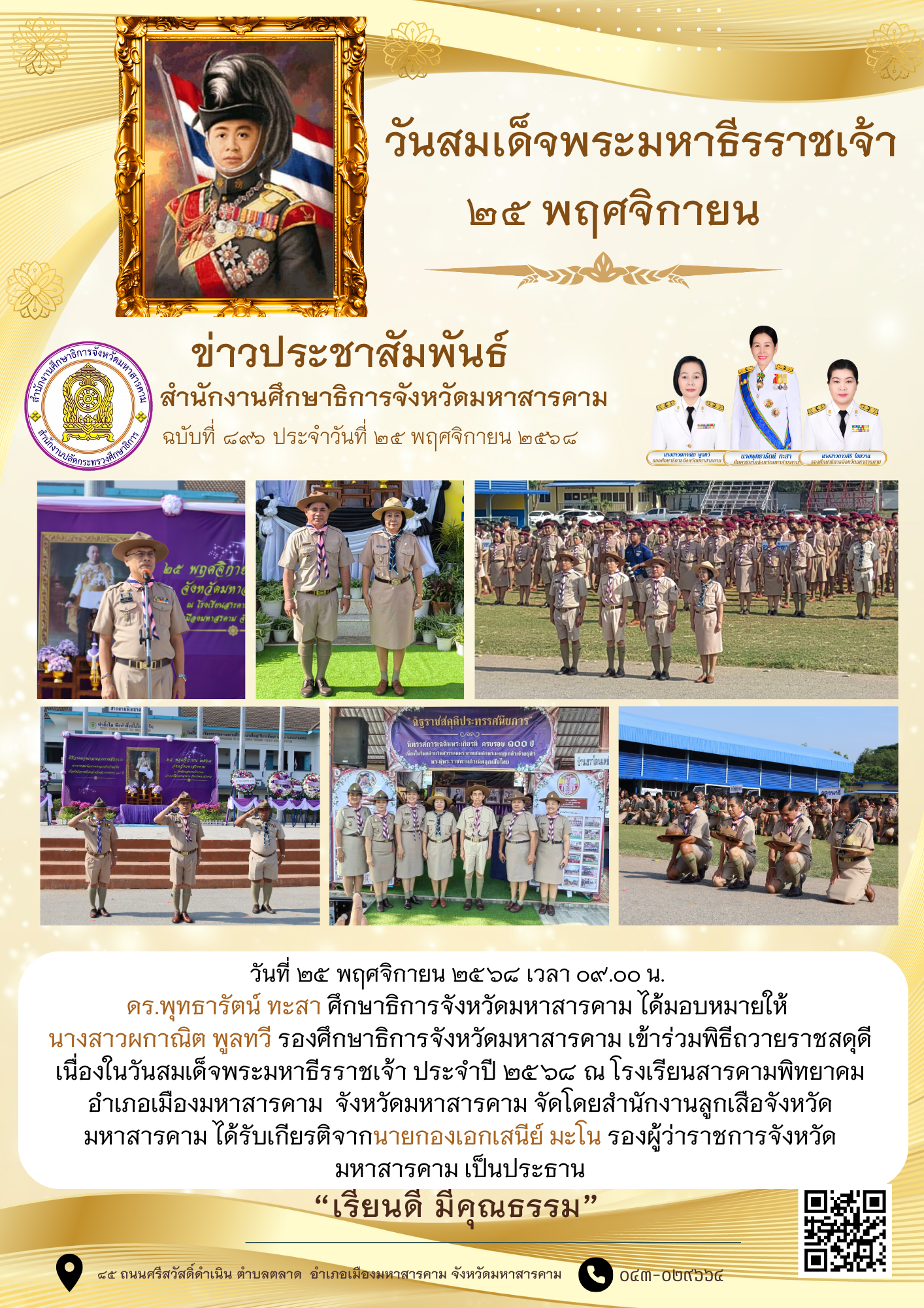 วันที่ ๒๕ พฤศจิกายน ๒๕๖๘ เวลา ​๐๙.๐๐ น. ดร.พุทธารัตน์ ทะสา ศึกษาธิการจังหวัดมหาสารคาม ได้มอบหมายให้ นางสาวผกาณิต พูลทวี รองศึกษาธิการจังหวัดมหาสารคาม​ เข้าร่วมพิธีถวายราชสดุดี เนื่องในวันสมเด็จพระมหาธีรราชเจ้า​ ประจำปี​ ๒๕๖๘​ ณ โรงเรียนสารคามพิทยาคมอำเภอเมืองมหาสารคาม จังหวัดมหาสารคาม จัดโดยสำนักงานจังหวัด ได้รับเกียรติจากนายกองเอกเสนีย์ มะโน รองผู้ว่าราชการจังหวัดมหาสารคาม เป็นประธาน