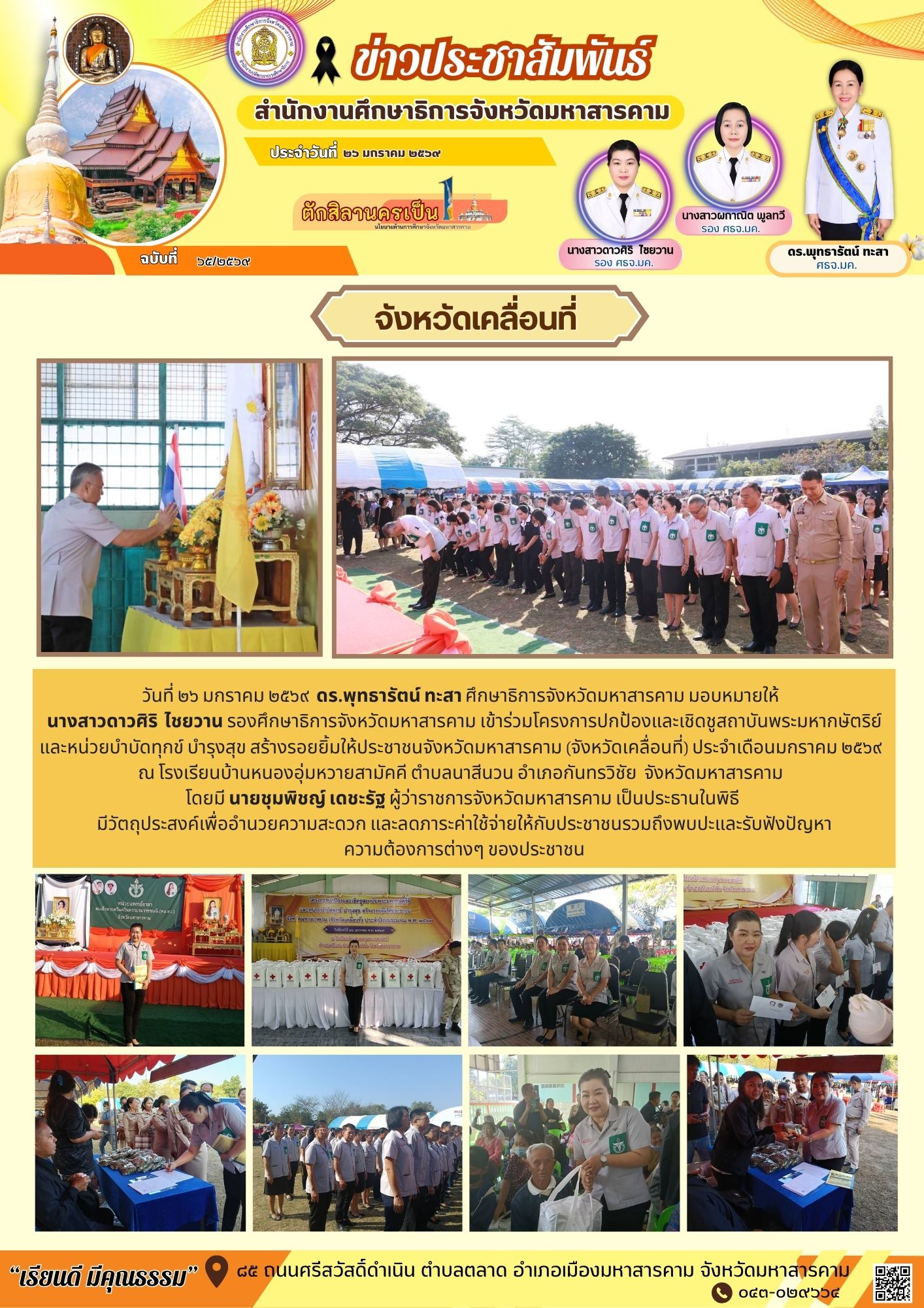 กิจกรรม วันที่ ๒๖ มกราคม ๒๕๖๙ ดร.พุทธารัตน์ ทะสา ศึกษาธิการจังหวัดมหาสารคาม มอบหมายให้ นางสาวดาวศิริ ไชยวาน รองศึกษาธิการจังหวัดมหาสารคาม เข้าร่วมโครงการปกป้องและเชิดชูสถาบันพระมหากษัตริย์ และหน่วยบำบัดทุกข์ บำรุงสุข สร้างรอยยิ้มให้ประชาชนจังหวัดมหาสารคาม (จังหวัดเคลื่อนที่) ประจำเดือนมกราคม ๒๕๖๙ ณ โรงเรียนบ้านหนองอุ่มหวายสามัคคี ตำบลนาสีนวน อำเภอกันทรวิชัย จังหวัดมหาสารคาม โดยมี นายชุมพิชญ์ เดชะรัฐ ผู้ว่าราชการจังหวัดมหาสารคาม เป็นประธานในพิธี มีวัตถุประสงค์เพื่ออำนวยความสะดวก และลดภาระค่าใช้จ่ายให้กับประชาชนรวมถึงพบปะและรับฟังปัญหา ความต้องการต่างๆ ของประชาชน Posted on 27 January 2026 by admin admin วันจันทร์ที่ ๒๖ มกราคม ๒๕๖๙ เวลา ๑๓.๓๐ น. ดร.พุทธารัตน์ ทะสา ศึกษาธิการจังหวัดมหาสารคาม เป็นประธานการประชุมคณะทำงานระดับศูนย์สอบ การทดสอบทางการศึกษาระดับชาติขั้นพื้นฐาน (O-NET) ระดับชั้นประถมศึกษาปีที่ ๖ และชั้นมัธยมศึกษาปีที่ ๓ ปีการศึกษา ๒๕๖๘ ศูนย์สอบ สำนักงานศึกษาธิการจังหวัดมหาสารคาม โดยมี นางสาวผกาณิต พูลทวี รองศึกษาธิการจังหวัดมหาสารคาม นางสาวดาวศิริ ไชยวาน รองศึกษาธิการจังหวัดมหาสารคาม พร้อมด้วย ผู้อำนวยการกลุ่ม/หน่วย และคณะทำงานสำนักงานศึกษาธิการจังหวัดมหาสารคาม เข้าร่วมประชุมในครั้งนี้ ณ ห้องประชุมเสมาตักสิลา สำนักงานศึกษาธิการจังหวัดมหาสารคาม อำเภอเมืองมหาสารคาม จังหวัดมหาสารคาม วันจันทร์ที่ 26 มกราคม 2569 เวลา 08.30 น. ดร.พุทธารัตน์ ทะสา ศึกษาธิการจังหวัดมหาสารคาม พร้อมด้วย คณะผู้บริหารและบุคลากรสำนักงานศึกษาธิการจังหวัดมหาสารคาม ยืนสงบนิ่งเพื่อถวายความอาลัย และน้อมรำลึกพระมหากรุณาธิคุณ สมเด็จพระนางเจ้าสิริกิติ์ พระบรมราชินีนาถ พระบรมราชชนนีพันปีหลวง ก่อนเริ่มกิจกรรมเทิดทูนสถาบันชาติ ศาสนา และพระมหากษัตริย์ โดยการเข้าแถวเคารพธงชาติ สวดมนต์ไหว้พระ กล่าวอุดมการณ์รักชาติ คำปฏิญาณตน เพื่อแสดงออกถึงความจงรักภักดีต่อชาติ ศาสนา พระมหากษัตริย์ ทำสมาธิโดยการเดินจงกรมและนั่งสมาธิ ตามหลักสูตรชินนสาสมาธิ การนี้ ศึกษาธิการจังหวัดมหาสารคาม ได้แจ้งข้อราชการและหลักการปฏิบัติงานแก่บุคลากรสำนักงานศึกษาธิการจังหวัดมหาสารคาม ณ ห้องประชุมเสมาตักสิลา สำนักงานศึกษาธิการจังหวัดมหาสารคาม