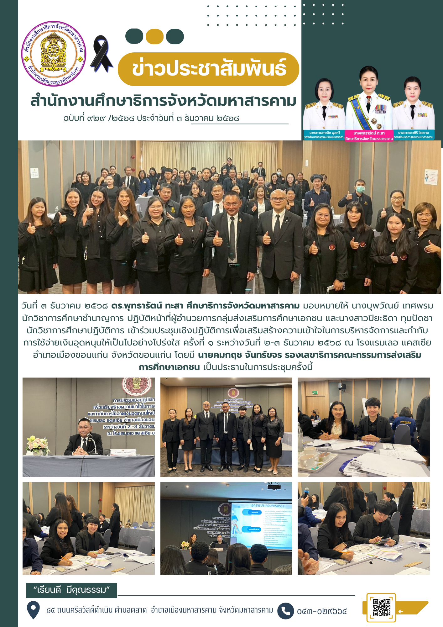 กิจกรรม วันที่ ๓ ธันวาคม ๒๕๖๘ ดร.พุทธารัตน์ ทะสา ศึกษาธิการจังหวัดมหาสารคาม มอบหมายให้ นางบุพวัณย์ เทศพรม นักวิชาการศึกษาชำนาญการ ปฏิบัติหน้าที่ผู้อำนวยการกลุ่มส่งเสริมการศึกษาเอกชน และนางสาวปิยะธิดา ทุมปัดชา นักวิชาการศึกษาปฏิบัติการ เข้าร่วมประชุมเชิงปฏิบัติการเพื่อเสริมสร้างความเข้าใจในการบริหารจัดการและกำกับการใช้จ่ายเงินอุดหนุนให้เป็นไปอย่างโปร่งใส ครั้งที่ ๑ ระหว่างวันที่ ๒-๓ ธันวาคม ๒๕๖๘ ณ โรงแรมเลอ แคสเซีย อำเภอเมืองขอนแก่น จังหวัดขอนแก่น โดยมี นายคมกฤช จันทร์ขจร รองเลขาธิการคณะกรรมการส่งเสริมการศึกษาเอกชน เป็นประธานในการประชุมครั้งนี้ Posted on 4 December 20254 December 2025 by admin admin วันพุธที่ ๓ ธันวาคม ๒๕๖๘ เวลา ๑๓.๓๐ น. ดร.พุทธารัตน์ ทะสา ศึกษาธิการจังหวัดมหาสารคาม พร้อมด้วย นางสาวผกาณิต พูลทวี , นางสาวดาวศิริ ไชยวาน รองศึกษาธิการจังหวัดมหาสารคาม ผู้อำนวยการกลุ่ม/หน่วย และบุคลากรสำนักงานศึกษาธิการจังหวัดมหาสารคาม เข้าร่วมกิจกรรมจิตอาสาประจำเดือนธันวาคม ๒๕๖๘ เพื่อปรับปรุงภูมิทัศน์สำนักงานศึกษาธิการจังหวัดมหาสารคาม โดยมี กลุ่มนิเทศ ติดตามและประเมินผล เป็นผู้รับผิดชอบกิจกรรมจิตอาสาประจำเดือนธันวาคม ๒๕๖๘ ณ สำนักงานศึกษาธิการจังหวัดมหาสารคาม อำเภอเมืองมหาสารคาม จังหวัดมหาสารคาม