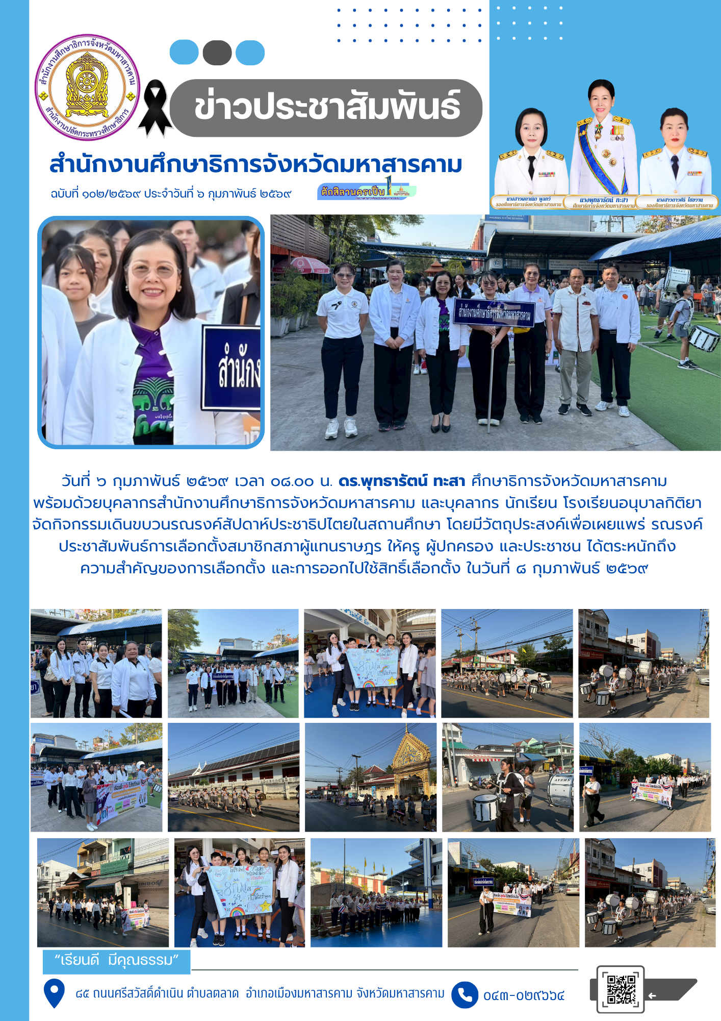กิจกรรม วันที่ ๖ กุมภาพันธ์ ๒๕๖๙ เวลา ๐๘.๐๐ น. ดร.พุทธารัตน์ ทะสา ศึกษาธิการจังหวัดมหาสารคาม พร้อมด้วยบุคลากรสำนักงานศึกษาธิการจังหวัดมหาสารคาม และบุคลากร นักเรียน โรงเรียนอนุบาลกิติยา จัดกิจกรรมเดินขบวนรณรงค์สัปดาห์ประชาธิปไตยในสถานศึกษา Posted on 9 February 20269 February 2026 by admin admin วันศุกรที่ ๖ กุมภาพันธ์ ๒๕๖๙ ดร. พุทธารัตน์ ทะสา ศึกษาธิการจังหวัดมหาสารคาม พบปะผู้บริหาร ครูโรงเรียนเอกชน เพื่อขับเคลื่อนนโยบาย เรียนดี มีคุณธรรม และติดตาม การขับเคลื่อนนโยบายด้านการจัดการศึกษา “ตักสิลานครเป็นหนึ่ง” สู่่การปฏิบัติอย่างมีประสิทธิภาพ ของโรงเรียนเอกชนในกำกับสำนักงานศึกษาธิการจังหวัดมหาสารคาม ณ โรงเรียนอนุบาลอุ่นรัก อำเภอยางสีสุราช จังหวัดมหาสารคาม ทั้งนี้ ได้มอบทุนการศึกษาให้กับโรงเรียนเพื่อนำไปพัฒนาผู้เรียนให้มีความสำนึกในพระมหากรุณาธิคุณของ สมเด็จพระนางเจ้าสิริกิติ์พระบรมราชินีนาถ พระบรมราชชนนีพันปีหลวง