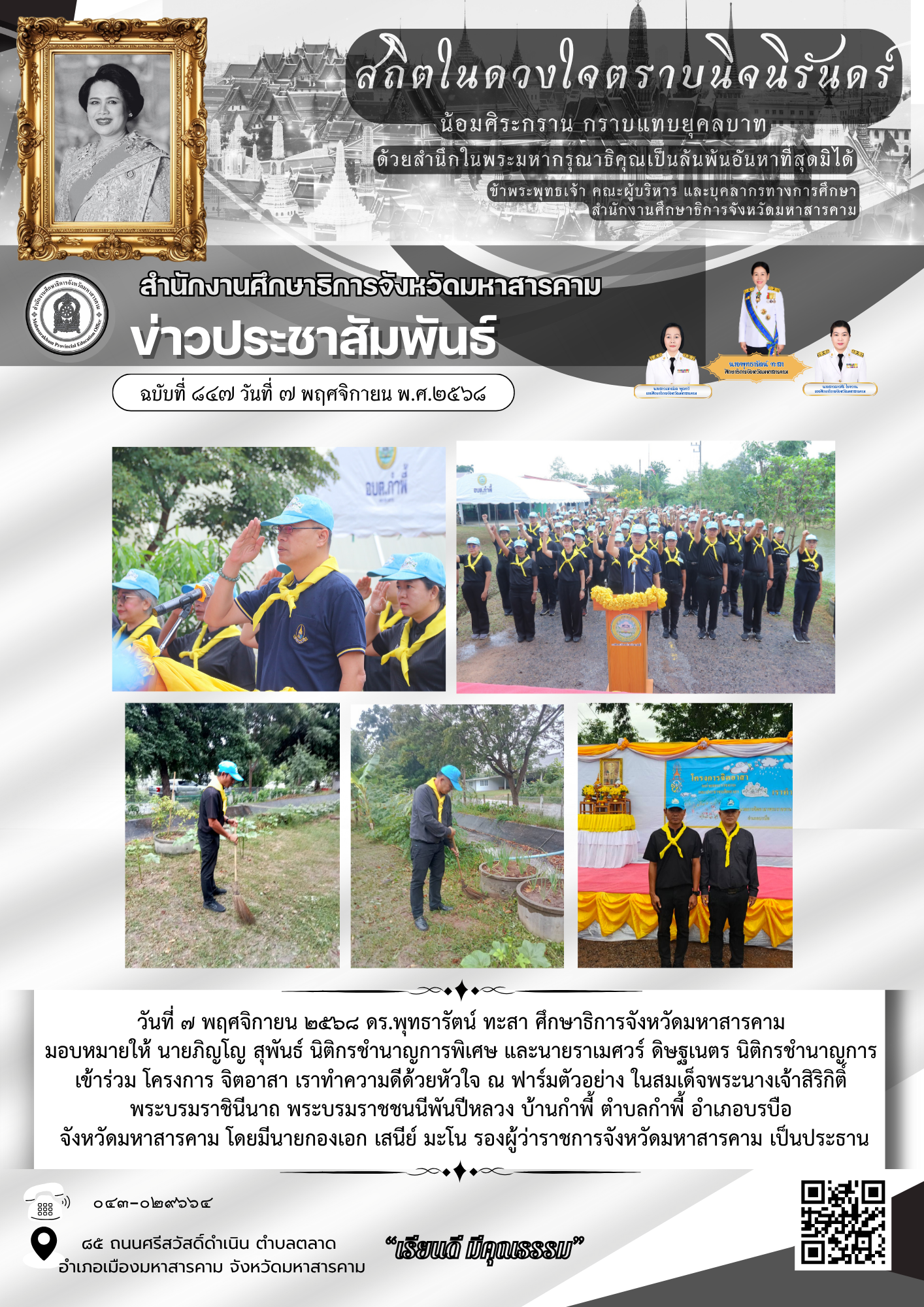 กิจกรรม วันที่ ๗ พฤศจิกายน ๒๕๖๘ ดร.พุทธารัตน์ ทะสา ศึกษาธิการจังหวัดมหาสารคาม มอบหมายให้ นายภิญโญ สุพันธ์ นิติกรชำนาญการพิเศษ และนายราเมศวร์ ดิษฐเนตร นิติกรชำนาญการ เข้าร่วม โครงการ จิตอาสา เราทำความดีด้วยหัวใจ ณ ฟาร์มตัวอย่าง ในสมเด็จพระนางเจ้าสิริกิติ์ พระบรมราชินีนาถ พระบรมราชชนนีพันปีหลวง บ้านกำพี้ ตำบลกำพี้ อำเภอบรบือ จังหวัดมหาสารคาม Posted on 7 November 2025 by admin admin วันที่ ๗ พฤศจิกายน ๒๕๖๘ ดร.พุทธารัตน์ ทะสา ศึกษาธิการจังหวัดมหาสารคาม มอบหมายให้ นายภิญโญ สุพันธ์ นิติกรชำนาญการพิเศษ และนายราเมศวร์ ดิษฐเนตร นิติกรชำนาญการ เข้าร่วม โครงการ จิตอาสา เราทำความดีด้วยหัวใจ ณ ฟาร์มตัวอย่าง ในสมเด็จพระนางเจ้าสิริกิติ์ พระบรมราชินีนาถ พระบรมราชชนนีพันปีหลวง บ้านกำพี้ ตำบลกำพี้ อำเภอบรบือ จังหวัดมหาสารคาม โดยมีนายกองเอก เสนีย์ มะโน รองผู้ว่าราชการจังหวัดมหาสารคาม เป็นประธาน