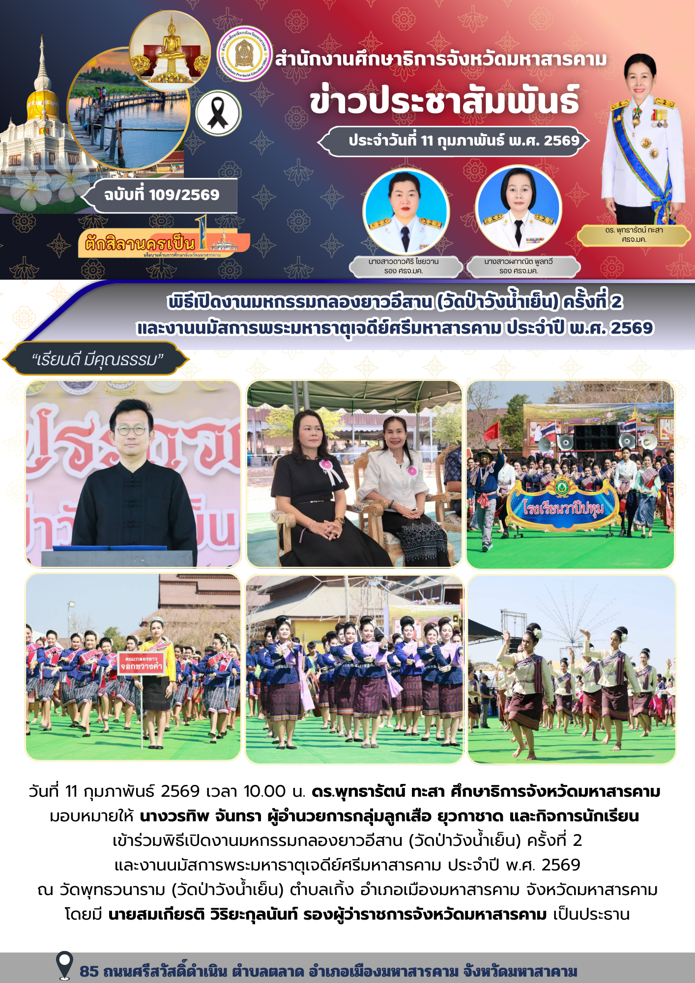 วันที่ 11 กุมภาพันธ์ 2569 เวลา 10.00 น. ดร.พุทธารัตน์ ทะสา ศึกษาธิการจังหวัดมหาสารคาม มอบหมายให้ นางวรทิพ จันทรา ผู้อำนวยการกลุ่มลูกเสือ ยุวกาชาด และกิจการนักเรียน เข้าร่วมพิธีเปิดงานมหกรรมกลองยาวอีสาน (วัดป่าวังน้ำเย็น) ครั้งที่ 2 และงานนมัสการพระมหาธาตุเจดีย์ศรีมหาสารคาม ประจำปี พ.ศ. 2569 ณ วัดพุทธวนาราม (วัดป่าวังน้ำเย็น) ตำบลเกิ้ง อำเภอเมืองมหาสารคาม จังหวัดมหาสารคาม โดยมี นายสมเกียรติ วิริยะกุลนันท์ รองผู้ว่าราชการจังหวัดมหาสารคาม เป็นประธาน