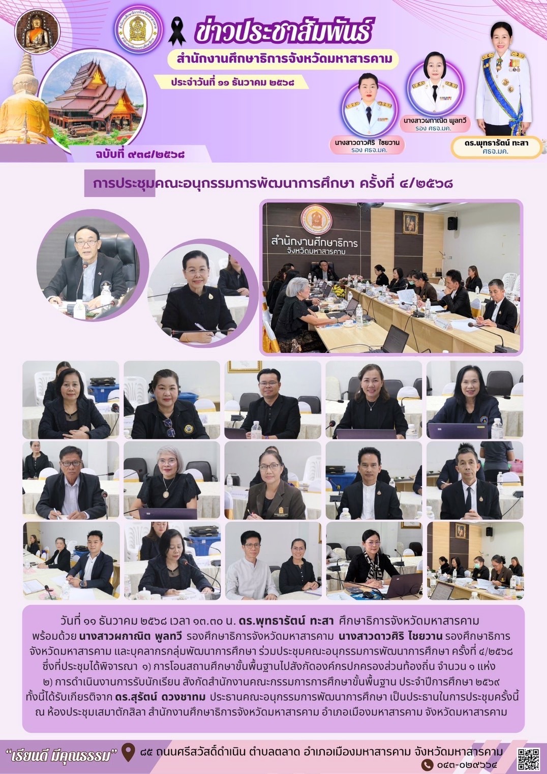 กิจกรรม วันที่ 11 ธันวาคม 2568 เวลา 13.30 น. ดร.พุทธารัตน์ ทะสา ศึกษาธิการจังหวัดมหาสารคาม พร้อมด้วย นางสาวผกาณิต พูลทวี รองศึกษาธิการจังหวัดมหาสารคาม นางสาวดาวศิริ ไชยวาน รองศึกษาธิการจังหวัดมหาสารคาม และบุคลากรกลุ่มพัฒนาการศึกษา ร่วมประชุมคณะอนุกรรมการพัฒนาการศึกษา ครั้งที่ 4/2568 ณ ห้องประชุมเสมาตักสิลา สำนักงานศึกษาธิการจังหวัดมหาสารคาม ซึ่งที่ประชุมได้พิจารณา 1.การโอนสถานศึกษาขั้นพื้นฐานไปสังกัดองค์กรปกครองส่วนท้องถิ่น(สังกัด สพม.มหาสารคาม)จำนวน 1 แห่ง 2.การดำเนินงานการรับนักเรียน สังกัด สพฐ. ประจำปีการศึกษา 2569 ทั้งนี้ได้รับเกียรติจาก ดร.สุรัตน์ ดวงชาทม ประธานคณะอนุกรรมการพัฒนาการศึกษา เป็นประธานในการประชุมครั้งนี้ Posted on 12 December 202512 December 2025 by admin admin วันอังคารที่ ๙ ธันวาคม ๒๕๖๘ เวลา ๐๙.๓๐ น. ดร. พุทธารัตน์ ทะสา ศึกษาธิการจังหวัดมหาสารคาม ร่วมงานวันต่อต้านการทุจริต กระทรวงศึกษาธิการ และประกาศเจตนารมณ์การต่อต้านการทุจริต กระทรวงศึกษาธิการ ภายใต้แนวคิด “กระทรวงศึกษาธิการไม่ทนต่อการทุจริต” (MOE Zero Tolerance) ประจำปีงบประมาณ พ.ศ. ๒๕๖๙ และรับมอบนโยบาย No Gift Policy ณ หอประชุมคุรุสภา กระทรวงศึกษาธิการ กรุงเทพมหานคร ทั้งนี้ ได้รับเกียรติจาก ดร. สุเทพ แก่งสันเทียะ ปลัดกระทรวงศึกษาธิการ เป็นประธาน วันที่ ๑๒ ธันวาคม ๒๕๖๘ เวลา ๐๙.๐๐ น. ดร.พุทธารัตน์ ทะสา ศึกษาธิการจังหวัดมหาสารคาม มอบหมายให้ นางสาวผกาณิต พูลทวี รองศึกษาธิการจังหวัดมหาสารคาม พร้อมด้วย ว่าที่ร้อยโท สุเขตร์ ศรีบุญเรือง, นางรุจาภา อรรถเวทิน, นางสาวอิทธิ์ณณัฎฐ์ นันแก้ว ศึกษานิเทศก์ชำนาญการพิเศษ และนางสาวธัญญลักษณ์ รัตนแสนศรี นักวิเคราะห์นโยบายและแผนชำนาญการ เข้าร่วมโครงการปกป้องและเชิดชู สถาบันพระมหากษัตริย์ และหน่วยบำบัดทุกข์ บำรุงสุข สร้างรอยยิ้มให้ประชาชนจังหวัดมหาสารคาม (จังหวัดเคลื่อนที่) ประจำเดือนธันวาคม ๒๕๖๘ ณ บริเวณองค์การบริการส่วนตำบลหนองม่วง บ้านดงมน ตำบลหนองม่วง อำเภอบรบือ จังหวัดมหาสารคาม โดยมี นายชุมพิชญ์ เดชะรัฐ ผู้ว่าราชการจังหวัดมหาสารคาม เป็นประธานในพิธี มีวัตถุประสงค์เพื่ออำนวยความสะดวก และลดภาระค่าใช้จ่ายให้กับประชาชนรวมถึงพบปะและรับฟังปัญหา ความต้องการต่างๆ ของประชาชน