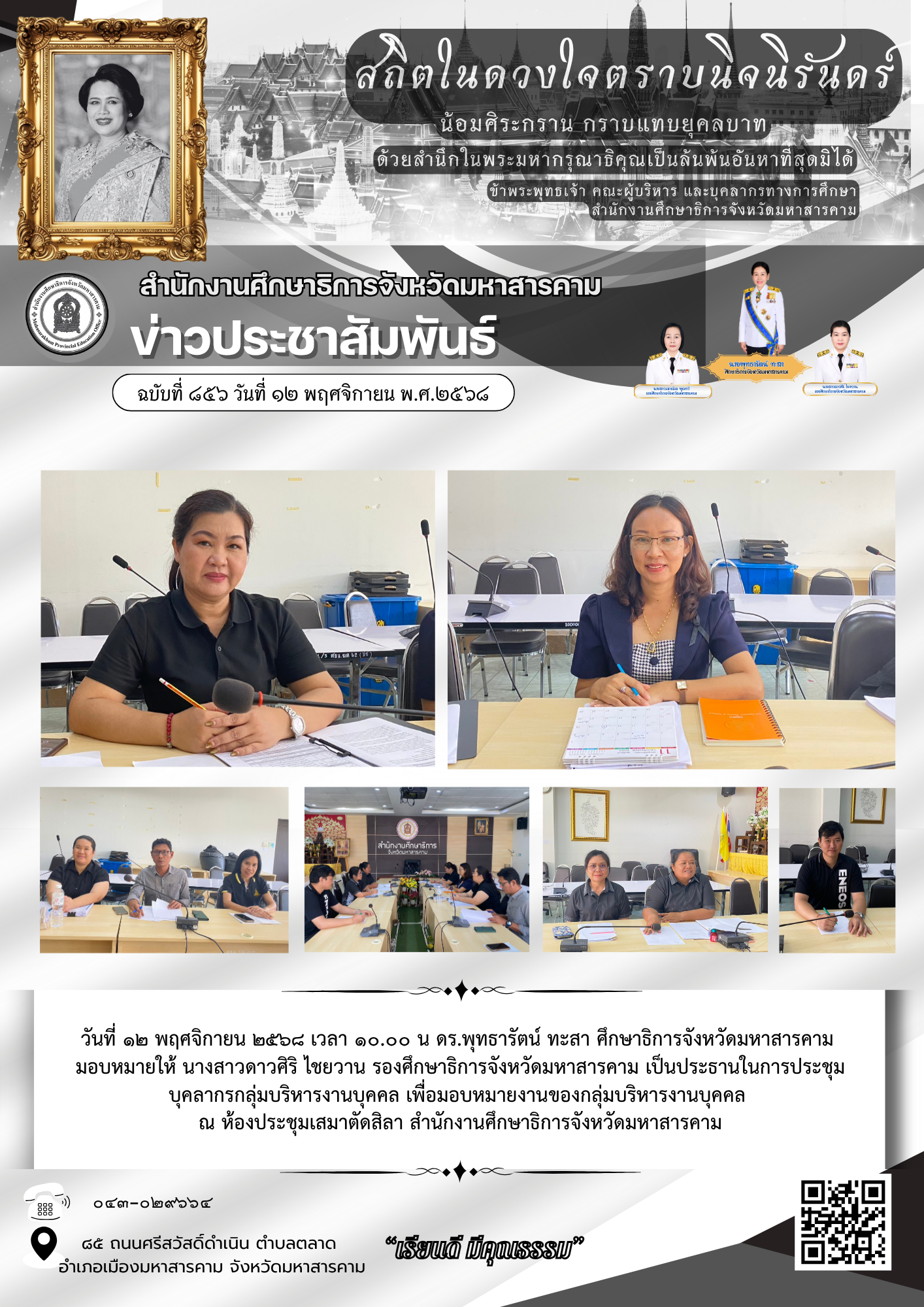กิจกรรม วันที่ 12 พฤศจิกายน 2568 เวลา 10.00 น ดร.พุทธารัตน์ ทะสา ศึกษาธิการจังหวัดมหาสารคาม มอบหมายให้ นางสาวดาวศิริ ไชยวาน รองศึกษาธิการจังหวัดมหาสารคาม เป็นประธานในการประชุม บุคลากรกลุ่มบริหารงานบุคคล เพื่อมอบหมายงานของกลุ่มบริหารงานบุคคล ณ ห้องประชุมเสมาตัดสิลา สำนักงานศึกษาธิการจังหวัดมหาสารคาม Posted on 12 November 202512 November 2025 by admin admin วันพุธที่ ๑๒ พฤศจิกายน ๒๕๖๘ เวลา ๑๐.๐๐ น ดร.พุทธารัตน์ ทะสา ศึกษาธิการจังหวัดมหาสารคาม มอบหมายให้ นางสาวดาวศิริ ไชยวาน รองศึกษาธิการจังหวัดมหาสารคาม เป็นประธานในการประชุม บุคลากรกลุ่มบริหารงานบุคคล เพื่อมอบหมายงานของกลุ่มบริหารงานบุคคล ณ ห้องประชุมเสมาตักสิลา สำนักงานศึกษาธิการจังหวัดมหาสารคาม