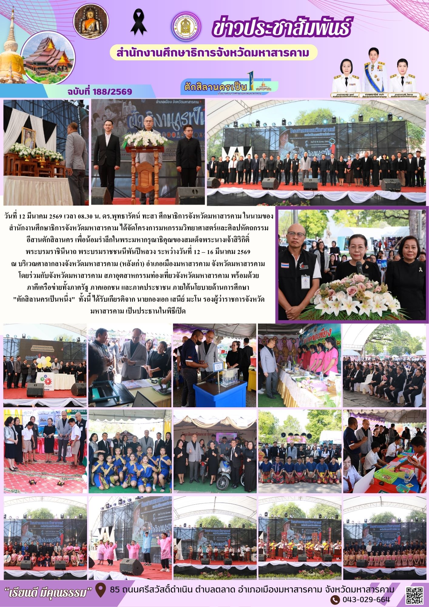 กิจกรรม วันที่ 12 มีนาคม 2569 เวลา 08.30 น. ดร.พุทธารัตน์ ทะสา ศึกษาธิการจังหวัดมหาสารคาม ในนามของสำนักงานศึกษาธิการจังหวัดมหาสารคาม ได้จัดโครงการมหกรรมวิทยาศาสตร์และศิลปหัตถกรรมอีสานตักสิลานคร เพื่อน้อมรำลึกในพระมหากรุณาธิคุณของสมเด็จพระนางเจ้าสิริกิติ์ พระบรมราชินีนาถ พระบรมราชชนนีพันปีหลวง ระหว่างวันที่ 12 – 16 มีนาคม 2569 ณ บริเวณศาลากลางจังหวัดมหาสารคาม (หลังเก่า) อำเภอเมืองมหาสารคาม จังหวัดมหาสารคาม โดยร่วมกับจังหวัดมหาสารคาม สภาอุตสาหกรรมท่องเที่ยวจังหวัดมหาสารคาม พร้อมด้วย ภาคีเครือข่ายทั้งภาครัฐ ภาคเอกชน และภาคประชาชน ภายใต้นโยบายด้านการศึกษา “ตักสิลานครเป็นหนึ่ง” ทั้งนี้ ได้รับเกียรติจาก นายกองเอก เสนีย์ มะโน รองผู้ว่าราชการจังหวัดมหาสารคาม เป็นประธานในพิธีเปิด Posted on 16 March 2026 by admin admin วันพุธที่ ๑๑ มีนาคม ๒๕๖๙ เวลา ๑๓.๓๐ น. ดร.พุทธารัตน์ ทะสา ศึกษาธิการจังหวัดมหาสารคาม นางสาวผกาณิต พูลทวี นางสาวดาวศิริ ไชยวาน รองศึกษาธิการจังหวัดมหาสารคาม พร้อมด้วยหน่วยงานทางการศึกษาทั้ง ๘ หน่วยงาน ร่วมประชุมปรึกษาหารือการดำเนินโครงการพบปะแลกเปลี่ยนความคิดเห็นและสร้างความสามัคคี (สภากาแฟ) ประจำปี ๒๕๖๙ ครั้งที่ ๑/๒๕๖๙ ณ ห้องประชุมเสมาตักสิลา สำนักงานศึกษาธิการจังหวัดมหาสารคาม วันที่ ๑๓ มีนาคม ๒๕๖๙ เวลา ๑๐.๐๐ น. ดร.พุทธารัตน์ ทะสา ศึกษาธิการจังหวัดมหาสารคาม พร้อมด้วย นางสาวผกาณิต พูลทวี รองศึกษาธิการจังหวัดมหาสารคาม นางอรดี วรรณคำ ผู้อำนวยการ กลุ่มพัฒนาการศึกษา และบุคลากรกลุ่มพัฒนาการศึกษา ร่วมประชุมคณะอนุกรรมการพัฒนาการศึกษา ครั้งที่ ๒/๒๕๖๙ ซึ่งที่ประชุมได้พิจารณา ๑) การรวมสถานศึกษาขั้นพื้นฐาน สังกัดสำนักงานเขตพื้นที่การศึกษาประถมศึกษามหาสารคาม เขต ๑ จำนวน ๑ แห่ง ๒) การเลิกสถานศึกษาขั้นพื้นฐาน สังกัดสำนักงานเขตพื้นที่การศึกษาประถมศึกษามหาสารคาม เขต ๑ จำนวน ๔ แห่ง ทั้งนี้ได้รับเกียรติจาก ดร.สุรัตน์ ดวงชาทม ประธานคณะอนุกรรมการพัฒนาการศึกษา เป็นประธานในการประชุมครั้งนี้ ณ ห้องประชุมเสมาตักสิลา สำนักงานศึกษาธิการจังหวัดมหาสารคาม ตำบลตลาด อำเภอเมืองมหาสารคาม จังหวัมหาสารคาม