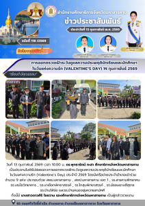 กิจกรรม วันที่ 13 กุมภาพันธ์ 2569 เวลา 10.00 น. ดร.พุทธารัตน์ ทะสา ศึกษาธิการจังหวัดมหาสารคาม เป็นประธานในพิธีปล่อยแถวการออกตรวจเฝ้าระวังดูแลความประพฤตินักเรียนและนักศึกษา ในวันแห่งความรัก (Valentine’s Day) ประจำปี 2569 โดยมีเครือข่ายประจำอำเภอเข้าร่วม จำนวน 9 แห่ง ประกอบด้วย สพม.มหาสารคาม , สพป.มหาสารคาม เขต 1 , รร.สารคามพิทยาคม รร.บรบือวิทยาคาร , รร.นาเชือกพิทยาสรรค์ , รร.โกสุมพิทยาสรรค์ , รร.มัธยมยางสีสุราช รร.บ้านไส้จ่อ และรร.บ้านหนองอุ่มหวายสามัคคี ทั้งนี้มี นางสาวดาวศิริ ไชยวาน รองศึกษาธิการจังหวัดมหาสารคาม เป็นผู้กล่าวรายงาน Posted on 16 February 2026 by admin admin วันที่ ๑๓ กุมภาพันธ์ ๒๕๖๙ ดร.พุทธารัตน์ ทะสา ศึกษาธิการจังหวัดมหาสารคาม พร้อมด้วย นางสาวผกาณิต พูลทวี รองศึกษาธิการจังหวัดมหาสารคาม นางสาวดาวศิริ ไชยวาน รองศึกษาธิการจังหวัดมหาสารคาม และบุคลากรสำนักงานศึกษาธิการจังหวัดมหาสารคาม เข้าร่วมประชุมการขับเคลื่อนโครงการตรวจ ติดตาม ประเมินผลการดำเนินงานตามนโยบายและยุทธศาสตร์ ประจำปีงบประมาณ พ.ศ. ๒๕๖๙ โดยมี ดร.สัมนาการณ์ บุญเรือง รองศึกษาธิการภาค ๑๓ ปฏิบัติหน้าที่รองศึกษาธิการภาค ๑๒ เป็นประธานการประชุมในครั้งนี้ ณ ห้องประชุมเสมาตักสิลา สำนักงานศึกษาธิการจังหวัดมหาสารคาม อำเภอเมืองมหาสารคาม จังหวัดมหาสารคาม วันศุกร์ที่ 13 กุมภาพันธ์ 2569 เวลา 10.00 น. ศูนย์เสมารักษ์สำนักงานศึกษาธิการจังหวัดมหาสารคาม พร้อมด้วยเครือข่ายพนักงานเจ้าหน้าที่ส่งเสริมความประพฤตินักเรียนและนักศึกษา ร่วมบูรณาการออกตรวจเฝ้าระวังดูแลความประพฤตินักเรียนและนักศึกษา ในวันแห่งความรัก (Valentine’s Day) 14 กุมภาพันธ์ 2569 โดยการแบ่งเป็น 2 สายตรวจ ดังนี้ สายที่ 1 ออกตรวจเฝ้าระวังที่สวนสาธารณะ แก่งเลิงจาน ห้างสรรพสินค้าเสริมไทยคอมเพล็กซ์ และสวนหนองนกเป็ดน้ำ พบนักเรียนและนักศึกษาที่อยู่ ในวัยเรียนออกนอกสถานศึกษา จำนวน 9 คน สายที่ 2 ออกตรวจฯที่ โรงแรม รีสอร์ท และหอพัก ไม่พบนักเรียน และนักศึกษาออกนอกสถานศึกษา ทั้งนี้ ตรวจพบน้ำกระท่อม 1 ขวด และบุหรี่ไฟฟ้า 1 เครื่อง เจ้าหน้าที่ฯ ได้ให้คำแนะนำ ตักเตือน และให้กลับเข้าสถานศึกษา
