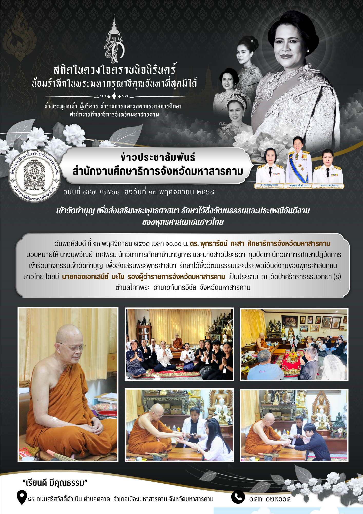 วันที่ 13 พฤศจิกายน 2568 เวลา 10.00 น. ดร.พุทธารัตน์ ทะสา ศึกษาธิการจังหวัดมหาสารคาม มอบหมายให้ นางบุพวัณย์ เทศพรม นักวิชาการศึกษาชำนาญการ และนางสาวปิยะธิดา ทุมปัดชา นักวิชาการศึกษาปฏิบัติการ เข้าร่วมกิจกรรมเข้าวัดทำบุญ เพื่อส่งเสริมพระพุทธศาสนา รักษาไว้ซึ่งวัฒนธรรมและประเพณีอันดีงามของพุทธศาสนิกชนชาวไทย โดยมีนายกองเอกเสนีย์ มะโน รองผู้ว่าราชการจังหวัดมหาสารคาม เป็นประธาน ณ วัดป่าศรัทธาธรรมวิทยา (ธ) ตำบลโคกพระ อำเภอกันทรวิชัย จังหวัดมหาสารคาม