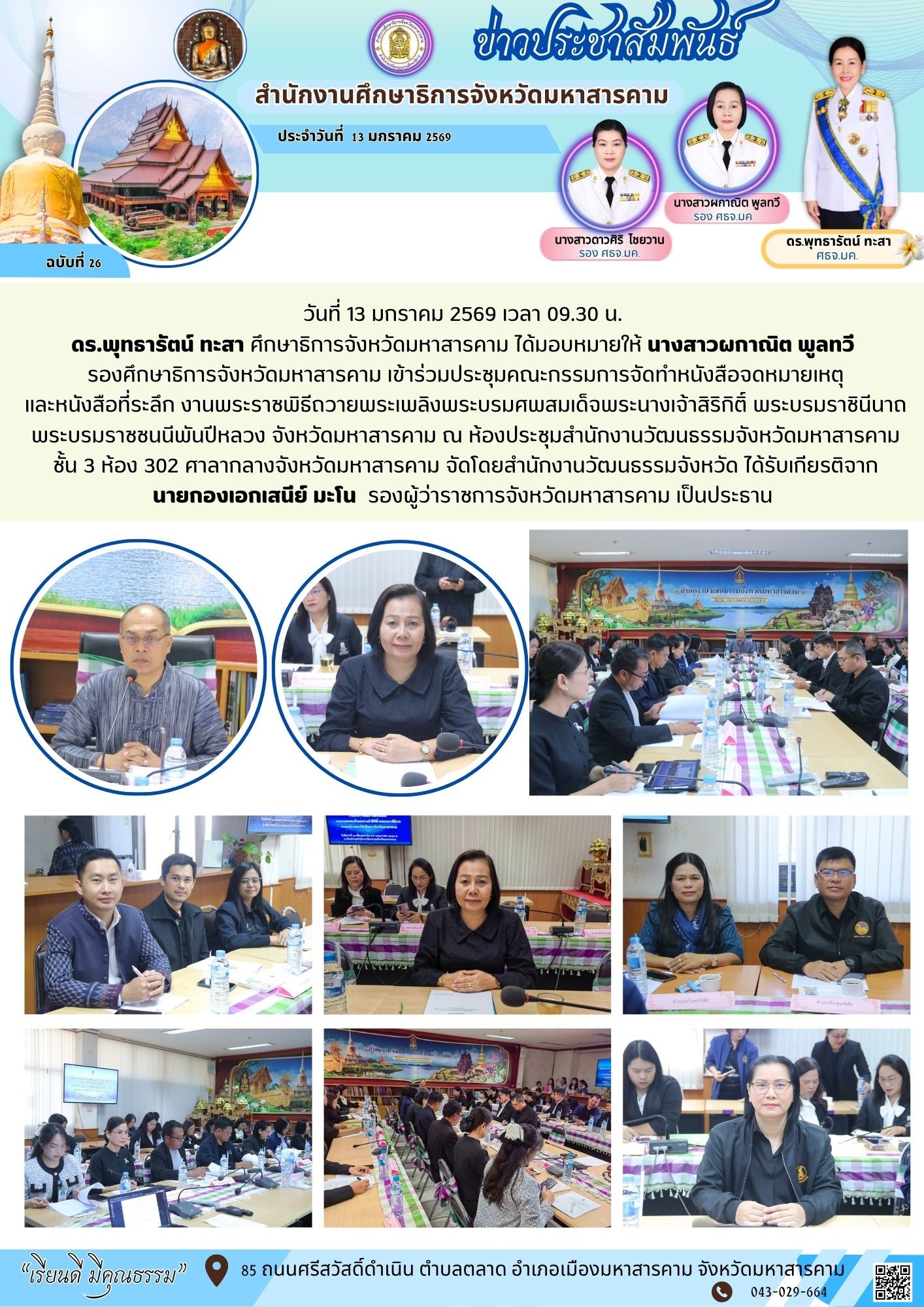 วันที่ 13 มกราคม 2569 เวลา 09.30 น. ดร.พุทธารัตน์ ทะสา ศึกษาธิการจังหวัดมหาสารคาม ได้มอบหมายให้ นางสาวผกาณิต พูลทวี รองศึกษาธิการจังหวัดมหาสารคาม เข้าร่วมประชุมคณะกรรมการจัดทำหนังสือจดหมายเหตุ และหนังสือที่ระลึก งานพระราชพิธีถวายพระเพลิงพระบรมศพสมเด็จพระนางเจ้าสิริกิติ์ พระบรมราชินีนาถ พระบรมราชชนนีพันปีหลวง จังหวัดมหาสารคาม ณ ห้องประชุมสำนักงานวัฒนธรรมจังหวัดมหาสารคาม ชั้น 3 ห้อง 302 ศาลากลางจังหวัดมหาสารคาม จัดโดยสำนักงานวัฒนธรรมจังหวัด ได้รับเกียรติจาก นายกองเอกเสนีย์ มะโน รองผู้ว่าราชการจังหวัดมหาสารคาม เป็นประธาน