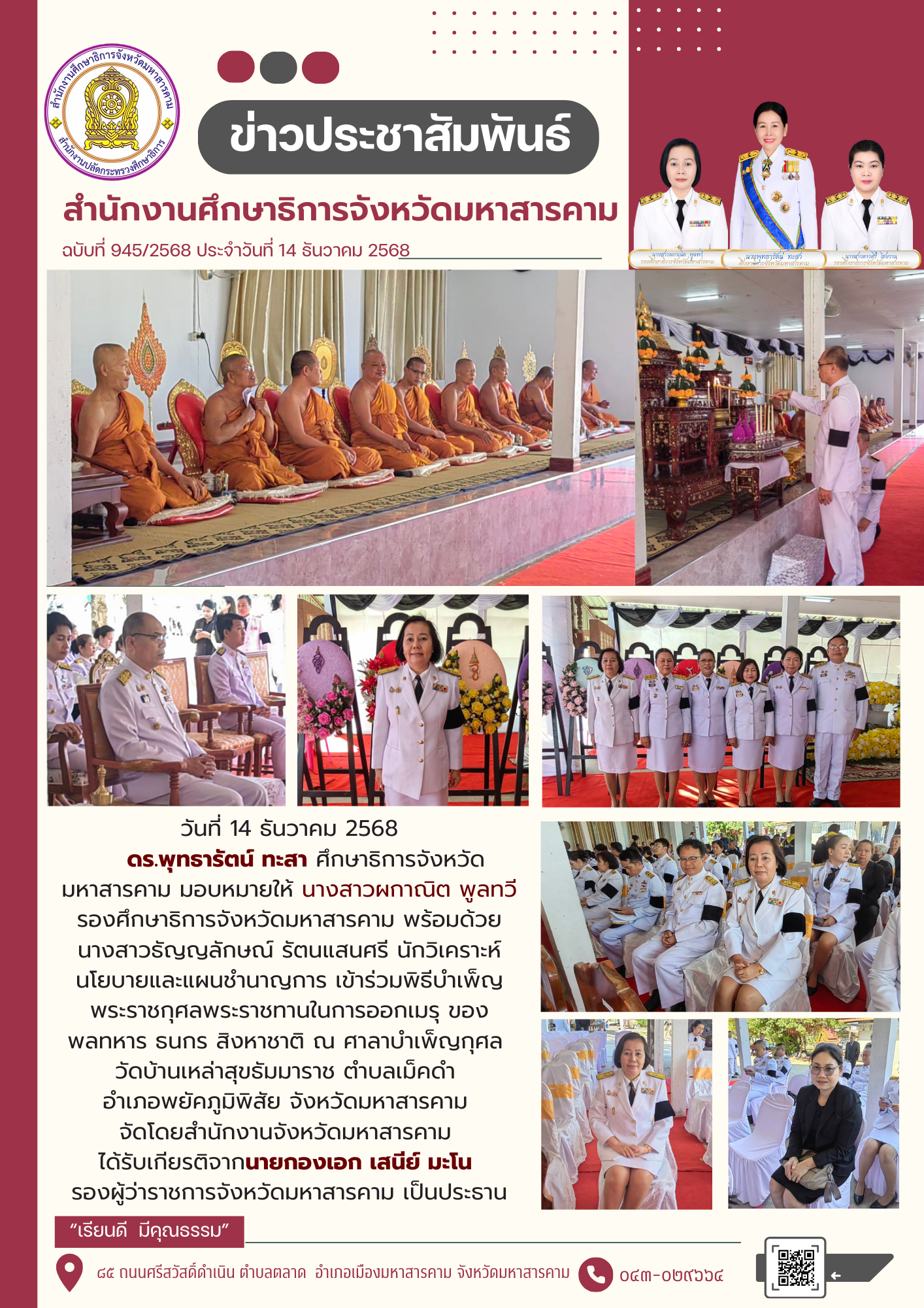 กิจกรรม วันที่ 14 ธันวาคม 2568 ดร.พุทธารัตน์ ทะสา ศึกษาธิการจังหวัดมหาสารคาม มอบหมายให้ นางสาวผกาณิต พูลทวี รองศึกษาธิการจังหวัดมหาสารคาม พร้อมด้วย นางสาวธัญญลักษณ์ รัตนแสนศรี นักวิเคราะห์นโยบายและแผนชำนาญการ เข้าร่วมพิธีบำเพ็ญ พระราชกุศลพระราชทานในการออกเมรุ ของ พลทหาร ธนกร สิงหาชาติ ณ ศาลาบำเพ็ญกุศล วัดบ้านเหล่าสุขธัมมาราช ตำบลเม็คดำ อำเภอพยัคภูมิพิสัย จังหวัดมหาสารคาม จัดโดยสำนักงานจังหวัดมหาสารคาม ได้รับเกียรติจากนายกองเอก เสนีย์ มะโน รองผู้ว่าราชการจังหวัดมหาสารคาม เป็นประธาน Posted on 15 December 202515 December 2025 by admin (kittitat) admin (kittitat) วันศุกร์ที่ ๑๒ ธันวาคม ๒๕๖๘ ดร. พุทธารัตน์ ทะสา ศึกษาธิการจังหวัดมหาสารคาม พบผู้บริหาร ครูโรงเรียนเอกชน เพื่อขับเคลื่อนนโยบาย เรียนดี มีคุณธรรม โรงเรียนเอกชนในกำกับสำนักงานศึกษาธิการจังหวัดมหาสารคาม ณ โรงเรียนอนุบาลกิติยา และโรงเรียนอนุบาลสกุลรัตน์ อำเภอเมืองมหาสารคาม จังหวัดมหาสารคาม
