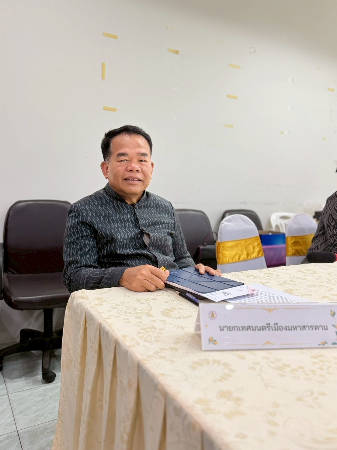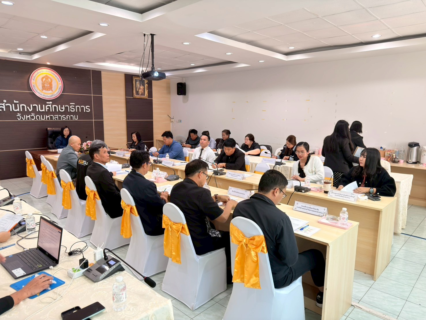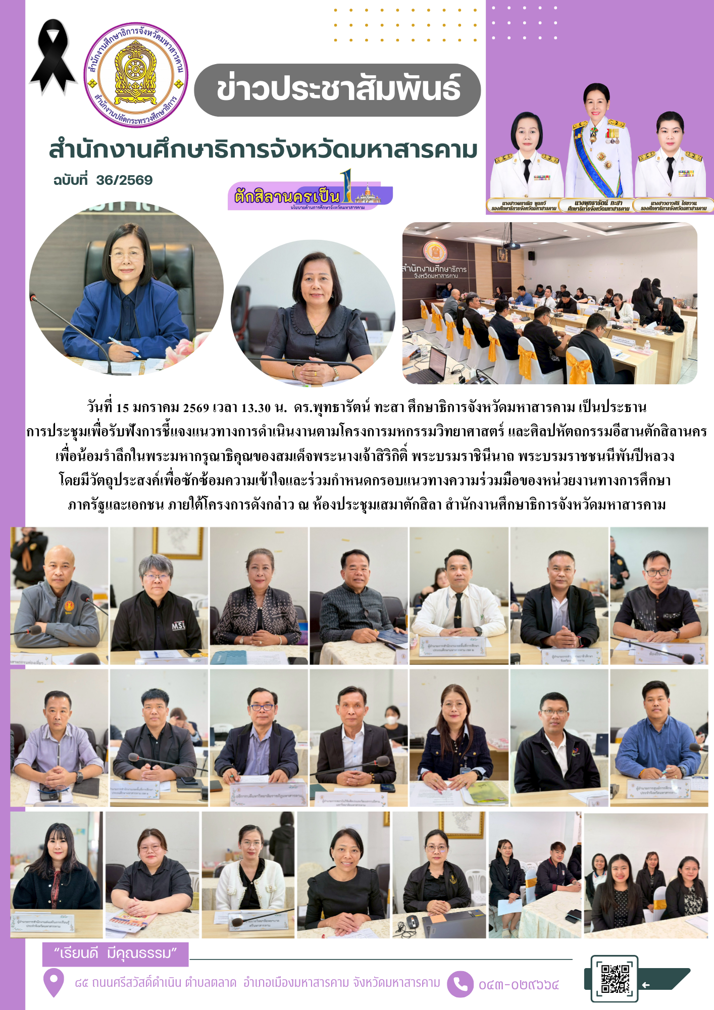 กิจกรรม วันที่ 15 มกราคม 2569 เวลา 13.30 น. ดร.พุทธารัตน์ ทะสา ศึกษาธิการจังหวัดมหาสารคาม เป็นประธาน การประชุมเพื่อรับฟังการชี้แจงแนวทางการดำเนินงานตามโครงการมหกรรมวิทยาศาสตร์ และศิลปหัตถกรรมอีสานตักสิลานคร เพื่อน้อมรำลึกในพระมหากรุณาธิคุณของสมเด็จพระนางเจ้าสิริกิติ์ พระบรมราชินีนาถ พระบรมราชชนนีพันปีหลวง โดยมีวัตถุประสงค์เพื่อซักซ้อมความเข้าใจและร่วมกำหนดกรอบแนวทางความร่วมมือของหน่วยงานทางการศึกษา ภาครัฐและเอกชน ภายใต้โครงการดังกล่าว ณ ห้องประชุมเสมาตักสิลา สำนักงานศึกษาธิการจังหวัดมหาสารคาม Posted on 19 January 2026 by admin admin วันที่ 15 มกราคม 2569 เวลา 17.00 น. ดร.พุทธารัตน์ ทะสา ศึกษาธิการจังหวัดมหาสารคาม มอบหมายให้ นางสาวผกาณิต พูลทวี รองศึกษาธิการจังหวัดมหาสารคาม และนางสาวธัญญลักษณ์ รัตนแสนศรี นักวิเคราะห์นโยบายและแผน เข้าร่วมรับฟังการแถลงข่าว “การจัดงานประเพณีบุญเบิกฟ้าและงานกาชาดจังหวัดมหาสารคาม ณ บริเวณสวนสุขภาพเฉลิมพระเกียรติสมเด็จพระนางเจ้าสิริกิติ์ พระบรมราชินีนาถ (ตรงข้ามโรงเรียนสารคามพิทยาคม) อำเภอเมืองมหาสารคาม จังหวัดมหาสารคาม จัดโดยสำนักงานประชาสัมพันธ์จังหวัด ได้รับเกียรติจากนายชุมพิชญ์ เดชะรัฐ ผู้ว่าราชการจังหวัดมหาสารคาม เป็นประธาน วันศุกร์ที่ ๑๖ มกราคม ๒๕๖๙ เวลา ๑๓.๓๐ น. ดร.พุทธารัตน์ ทะสา ศึกษาธิการจังหวัดมหาสารคาม เข้าร่วมประชุมคณะอนุกรรมการบริหารกองทุนส่งเสริมการ จัดสวัสดิการสังคมจังหวัดมหาสารคาม ครั้งที่ ๑/๒๕๖๙ ณ ห้องประชุม ๔๐๙ ชั้น ๔ ศาลากลางจังหวัดมหาสารคาม เพื่อพิจารณาการเสนอของบประมาณจากโครงการกองทุนส่งเสริมการจัดสวัสดิการสังคมขององค์การสวัสดิการสังคม ประจำปีงบประมาณ พ.ศ. ๒๕๖๙ จำนวน ๑๐ โครงการ จัดโดย สำนักงานพัฒนาสังคมและความมั่นคง ของมนุษย์จังหวัดมหาสารคาม ทั้งนี้ ได้รับเกียรติจาก นายกองเอกเสนีย์ มะโน รองผู้ว่าราชการจังหวัดมหาสารคาม เป็นประธานในการประชุม