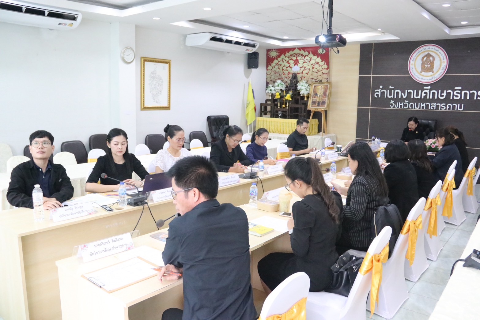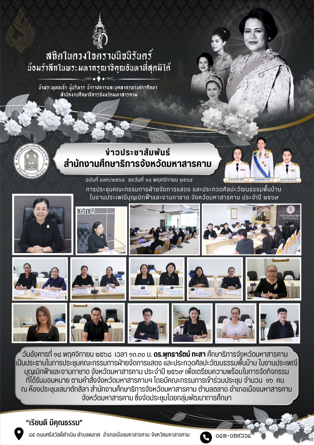 กิจกรรม วันที่ 18 พฤศจิกายน 2568 เวลา 13.30 น. ดร.พุทธารัตน์ ทะสา ศึกษาธิการจังหวัดมหาสารคาม เป็นประธานในการประชุมคณะกรรมการฝ่ายจัดการแสดง และประกวดศิลปะวัฒนธรรมพื้นบ้าน ในงานประเพณีบุญเบิกฟ้าและงานกาชาด จังหวัดมหาสารคาม ประจำปี 2569 เพื่อเตรียมความพร้อมในการจัดกิจกรรมที่ได้รับมอบหมาย ตามคำสั่งจังหวัดมหาสารคามฯ ณ ห้องประชุมเสมาตักสิลา สำนักงานศึกษาธิการจังหวัดมหาสารคาม อ.เมือง จ.มหาสารคาม จัดประชุมโดย:กลุ่มพัฒนาการศึกษา Posted on 20 November 202520 November 2025 by admin admin วันพุธที่ 19 พฤศจิกายน 2568 เวลา 09.00 น. ดร.พุทธารัตน์ ทะสา ศึกษาธิการจังหวัดมหาสารคาม เข้าร่วมประชุมเรื่องแนวปฏิบัติในการเลิกสถานศึกษาขั้นพื้นฐาน ในสังกัด สพป.มหาสารคาม เขต 1,เขต 2,เขต 3 และ สพม.มหาสารคาม เพื่อปรึกษาหารือข้อราชการ แลกเปลี่ยนข้อมูลการทำงาน รวมถึงการประสานงานและแก้ไขปัญหาร่วมกัน ของส่วนราชการในสังกัดกระกรวงศึกษาธิการ โดยมี นายกองเอก เสนีย์ มะโน รองผู้ว่าราชการจังหวัดมหาสารคาม เป็นประธานในการประชุม ณ ห้องปฏิบัติการรองผู้ว่าราชการจังหวัดมหาสารคาม (ชั้น 4) ศาลากลางจังหวัดมหาสารคาม ต.แวงน่าง อ.เมืองฯ จ.มหาสารคาม