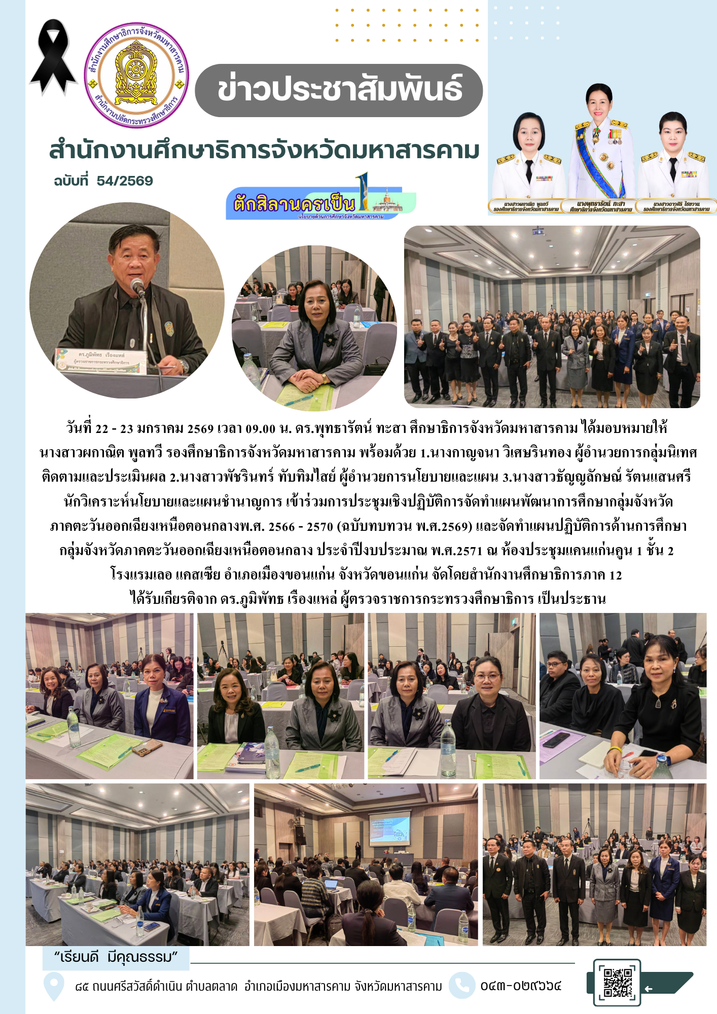 กิจกรรม วันที่ 22 – 23 มกราคม 2569 เวลา 09.00 น. ดร.พุทธารัตน์ ทะสา ศึกษาธิการจังหวัดมหาสารคาม ได้มอบหมายให้ นางสาวผกาณิต พูลทวี รองศึกษาธิการจังหวัดมหาสารคาม พร้อมด้วย 1.นางกาญจนา วิเศษรินทอง ผู้อำนวยการกลุ่มนิเทศติดตามและประเมินผล 2.นางสาวพัชรินทร์ ทับทิมไสย์ ผู้อำนวยการนโยบายและแผน 3.นางสาวธัญญลักษณ์ รัตนแสนศรี นักวิเคราะห์นโยบายและแผนชำนาญการ เข้าร่วมการประชุมเชิงปฏิบัติการจัดทำแผนพัฒนาการศึกษากลุ่มจังหวัด ภาคตะวันออกเฉียงเหนือตอนกลางพ.ศ. 2566 – 2570 (ฉบับทบทวน พ.ศ.2569) และจัดทำแผนปฏิบัติการด้านการศึกษา กลุ่มจังหวัดภาคตะวันออกเฉียงเหนือตอนกลาง ประจำปีงบประมาณ พ.ศ.2571 ณ ห้องประชุมแคนแก่นคูน 1 ชั้น 2 โรงแรมเลอ แคสเซีย อำเภอเมืองขอนแก่น จังหวัดขอนแก่น จัดโดยสำนักงานศึกษาธิการภาค 12 ได้รับเกียรติจาก ดร.ภูมิพัทธ เรืองแหล่ ผู้ตรวจราชการกระทรวงศึกษาธิการ เป็นประธาน Posted on 22 January 2026 by admin admin วันที่ ๒๒ มกราคม ๒๕๖๙ เวลา ๐๗.๐๐ น. ดร.พุทธารัตน์ ทะสา ศึกษาธิการจังหวัดมหาสารคาม พร้อมด้วย ดร.กาญจนา วิเศษรินทอง ผู้อำนวยการกลุ่มนิเทศ ติดตามและประเมินผล พร้อมด้วย คณะศึกษานิเทศก์ และบุคลากรกลุ่มนิเทศ ติดตามและประเมินผล เข้าร่วมโครงการพบปะแลกเปลี่ยนความคิดเห็นและสร้างความสามัคคี (สภากาแฟ) ประจำเดือนมกราคม ๒๕๖๙ ณ โดย ๑ ร้อยปี คณะครุศาสตร์ มหาวิทยาลัยราชภัฎมหาสารคาม อำเภอเมืองมหาสารคาม จังหวัดมหาสารคาม เพื่อให้ส่วนราชการ และภาคเอกชน ตลอดจนสื่อมวลชนได้พบปะแลกเปลี่ยน ความคิดเห็น และสร้างความสามัคคี โดยมี นายชุมพิชญ์ เดชะรัฐ ผู้ว่าราชการจังหวัดมหาสารคาม เป็นประธานในครั้งนี้