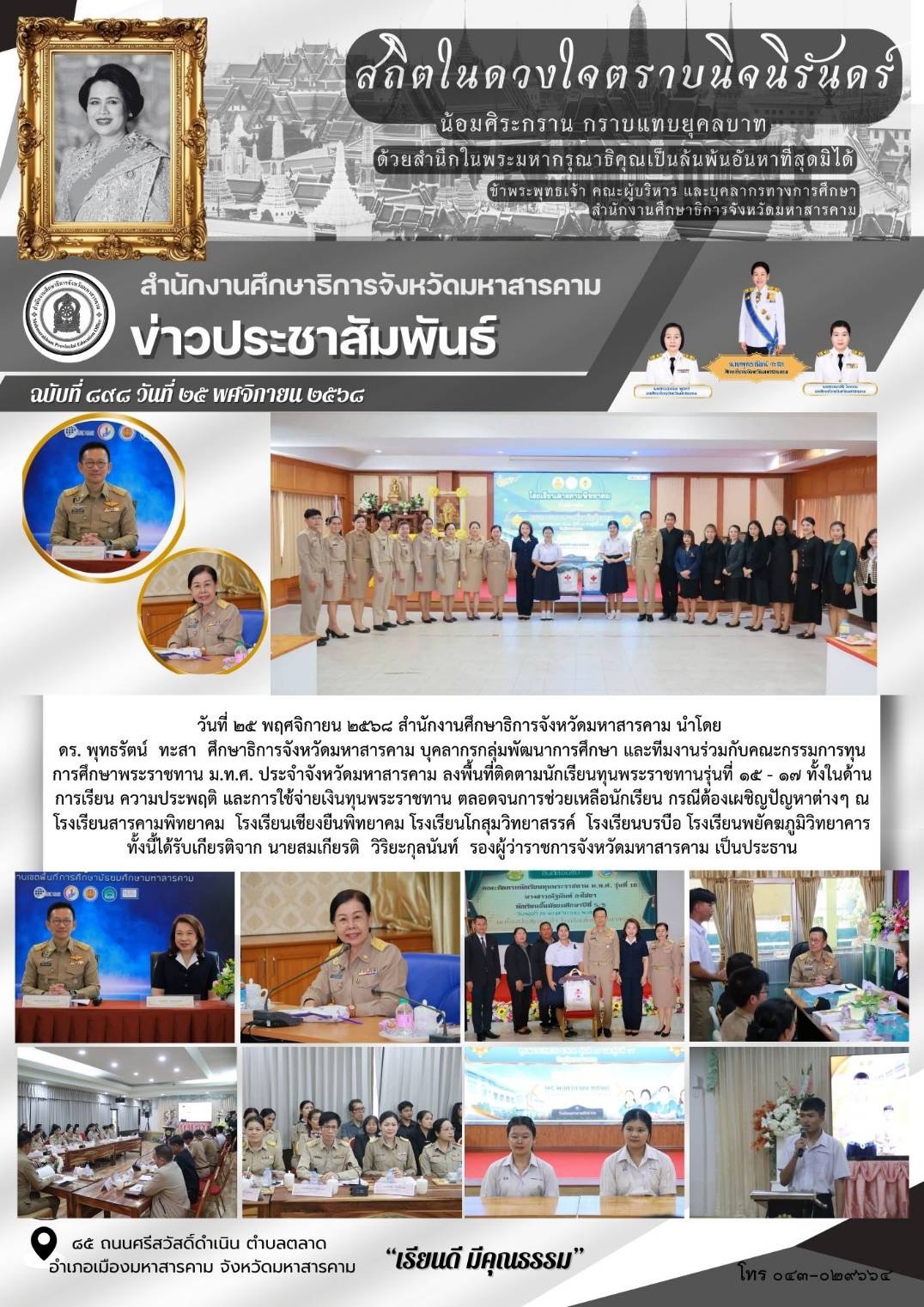 กิจกรรม วันที่ 25 พฤศจิกายน 2568 สำนักงานศึกษาธิการจังหวัดมหาสารคาม นำโดย ดร. พุทธรัตน์ ทะสา ศึกษาธิการจังหวัดมหาสารคาม บุคลากรกลุ่มพัฒนาการศึกษา และทีมงานร่วมกับคณะกรรมการทุนการศึกษาพระราชทาน ม.ท.ศ. ประจำจังหวัดมหาสารคาม ลงพื้นที่ติดตามนักเรียนทุนพระราชทานรุ่นที่ 15 -17 ทั้งในด้านการเรียนความประพฤติ และการใช้จ่ายเงินทุนพระราชทาน ตลอดจนการช่วยเหลือนักเรียน กรณีต้องเผชิญปัญหาต่างๆ ณ โรงเรียนสารคามพิทยาคม โรงเรียนเชียงยืนพิทยาคม โรงเรียนโกสุมวิทยาสรรค์ โรงเรียนบรบือ โรงเรียนพยัคฆภูมิวิทยาคาร ทั้งนี้ได้รับเกียรติจาก นายสมเกียรติ วิริยะกุลนันท์ รองผู้ว่าราชการจังหวัดมหาสารคาม เป็นประธาน Posted on 28 November 202528 November 2025 by admin admin ศูนย์อำนวยการจิตอาสาพระราชทาน จังหวัดมหาสารคาม ได้มอบหมายให้ส่วนราชการระดับจังหวัด รับผิดชอบจัดกิจกรรมจิตอาสาพัฒนาในโอกาสวันสำคัญของชาติไทย เนื่องในวันคล้าย วันสวรรคต พระบาทสมเด็จพระมงกุฎเกล้าเจ้าอยู่หัว 25 พฤศจิกายน 2568 สำนักงานศึกษาธิการจังหวัดมหาสารคาม สำนักงานส่งเสริมการเรียนรู้ประจำจังหวัดมหาสารคาม และศูนย์การศึกษาพิเศษประจำจังหวัดมหาสารคาม เป็นหน่วยงานที่รับผิดชอบ ในการจัดกิจกรรมจิตอาสาพัฒนาทำความสะอาด ปรับปรุงภูมิทัศน์ และปลูกต้นไม้ ณ บริเวณวัดป่าศุภมิตรสิทธาราม ตำบลตลาด อำเภอเมืองมหาสารคาม จังหวัดมหาสารคาม มีจิตอาสา 904 หัวหน้าหน่วยงานระดับจังหวัด ประชาชนจิตอาสา เข้าร่วมกิจกรรม จำนวน 300 คน โดยมีนายกองเอกเสนีย์ มะโน รองผู้ว่าราชการจังหวัดมหาสารคาม เป็นประธานพิธีเปิดกิจกรรมจิตอาสา