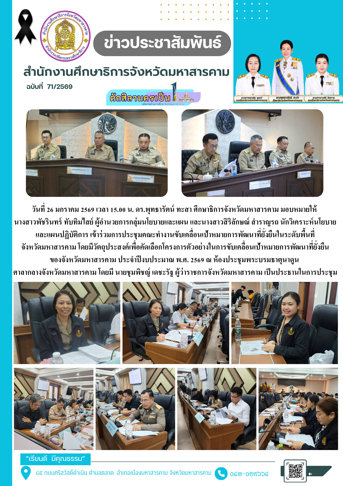 กิจกรรม วันที่ 26 มกราคม 2569 เวลา 15.00 น. ดร.พุทธารัตน์ ทะสา ศึกษาธิการจังหวัดมหาสารคาม มอบหมายให้ นางสาวพัชรินทร์ ทับทิมไสย์ ผู้อำนวยการกลุ่มนโยบายและแผน และนางสาวสิริลักษณ์ สำราญรถ นักวิเคราะห์นโยบายและแผนปฏิบัติการ เข้าร่วมการประชุมคณะทำงานขับเคลื่อนเป้าหมายการพัฒนาที่ยั่งยืนในระดับพื้นที่ จังหวัดมหาสารคาม โดยมีวัตถุประสงค์เพื่อคัดเลือกโครงการตัวอย่างในการขับเคลื่อนเป้าหมายการพัฒนาที่ยั่งยืน ของจังหวัดมหาสารคาม ประจำปีงบประมาณ พ.ศ. 2569 ณ ห้องประชุมพระบรมธาตุนาดูน ศาลากลางจังหวัดมหาสารคาม โดยมี นายชุมพิชญ์ เดชะรัฐ ผู้ว่าราชการจังหวัดมหาสารคาม เป็นประธานในการประชุม Posted on 28 January 2026 by admin admin วันที่ 26 มกราคม 2569 เวลา 13.30 น. ดร.พุทธารัตน์ ทะสา ศึกษาธิการจังหวัดมหาสารคาม มอบหมายให้ นางสาวพัชรินทร์ ทับทิมไสย์ ผู้อำนวยการกลุ่มนโยบายและแผน เข้าร่วมประชุมการจัดโครงการ/กิจกรรม บริเวณริมคลองสมถวิล ให้เป็น Landmark ของเมืองมหาสารคาม ครั้งที่ 1/2569 โดยมีวัตถุประสงค์ เพื่อพิจารณา ร่างปฏิทินการจัดโครงการ/กิจกรรมดังกล่าว ณ ห้องประชุมอเนกประสงค์ เทศบาลเมืองมหาสารคาม จังหวัดมหาสารคาม โดยมี นายภาคิน ติระพงศ์ไพบูลย์ นายกเทศมนตรีเมืองมหาสารคาม เป็นประธานในการประชุม วันอังคารที่ ๒๗ มกราคม ๒๕๖๙ เวลา ๑๓.๓๐ น. ดร. พุทธารัตน์ ทะสา ศึกษาธิการจังหวัดมหาสารคาม พร้อมด้วย นางสาวพัชรินทร์ ทับทิมไสย์ ผู้อำนวยการกลุ่มนโยบายและแผน และนางสาวไอยรา สังฆะ นักวิเคราะห์นโยบาย และแผนชำนาญการ เข้าร่วมประชุมคณะกรรมการร่วมภาครัฐและเอกชนเพื่อพัฒนาและแก้ไขปัญหาทางเศรษฐกิจจังหวัดมหาสารคาม (กรอ.จังหวัดมหาสารคาม) ครั้งที่ ๑/๒๕๖๙ เพื่อขับเคลื่อนโครงการมหกรรมวิทยาศาสตร์ และศิลปหัตถกรรมอีสานตักสิลานครเพื่อน้อมรำลึกในพระมหากรุณาธิคุณของสมเด็จพระนางเจ้าสิริกิติ์ พระบรมราชินีนาถ พระบรมราชชนนีพันปีหลวง ซึ่งเป็นโครงการที่ดำเนินการร่วมกับสภาอุตสาหกรรมท่องเที่ยวจังหวัดมหาสารคาม ณ ห้องประชุม ๔๐๙ ชั้น ๔ ศาลากลางจังหวัดมหาสารคาม โดยมี นายชุมพิชญ์ เดชะรัฐ ผู้ว่าราชการจังหวัดมหาสารคาม เป็นประธาน