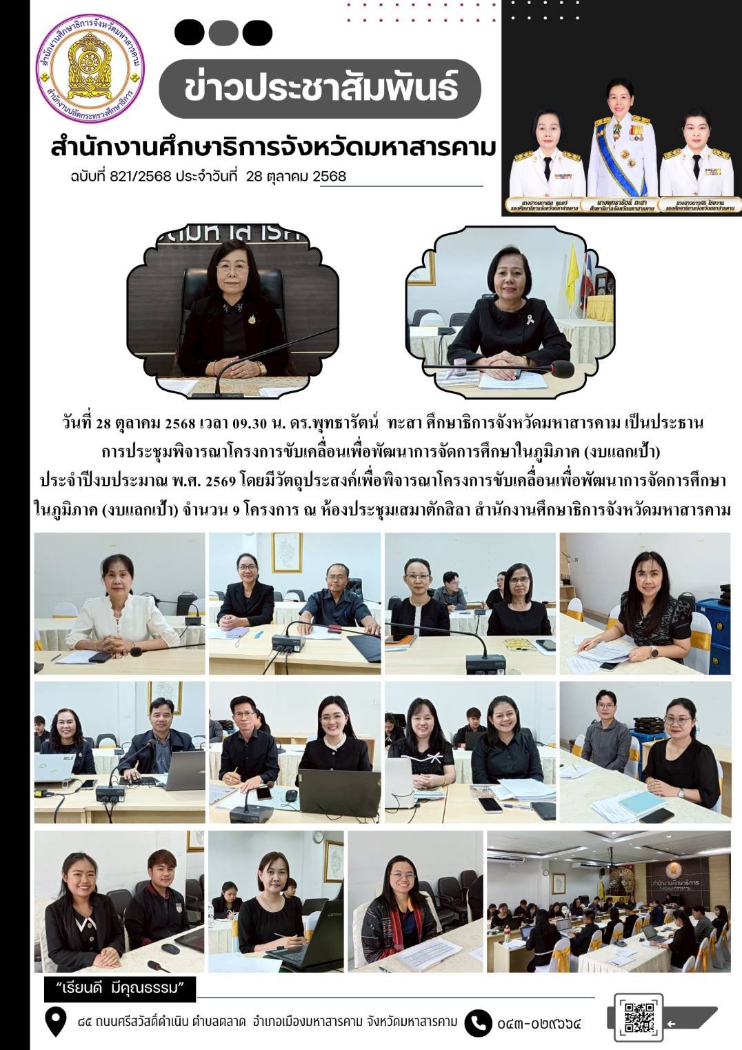 กิจกรรม วันที่ 28 ตุลาคม 2568 เวลา 09.30 น. ดร.พุทธารัตน์ ทะสา ศึกษาธิการจังหวัดมหาสารคาม เป็นประธาน การประชุมพิจารณาโครงการขับเคลื่อนเพื่อพัฒนาการจัดการศึกษาในภูมิภาค (งบแลกเป้า) ประจำปีงบประมาณ พ.ศ. 2569 โดยมีวัตถุประสงค์เพื่อพิจารณาโครงการขับเคลื่อนเพื่อพัฒนาการจัดการศึกษาในภูมิภาค (งบแลกเป้า) จำนวน 9 โครงการ ณ ห้องประชุมเสมาตักสิลา สำนักงานศึกษาธิการจังหวัดมหาสารคาม Posted on 29 October 2025 by admin admin วันอังคารที่ ๒๘ ตุลาคม ๒๕๖๘ ดร.พุทธารัตน์ ทะสาศึกษาธิการจังหวัดมหาสารคาม มอบหมายให้ กลุ่มบริหารงานบุคคล เข้าร่วม โครงการเฉลิมพระเกียรติ “พระบาทสมเด็จ พระวชิรเกล้าเจ้าอยู่หัว”ตามหลักธรรมชุดพระราชทานธรรมนาวา “วัง” ณ วัดปัจฉิมทัศน์ ตำบลตลาด อำเภอเมืองมหาสารคาม จังหวัดมหาสารคาม โดยมีนายกองเอก เสนีย์ มะโน รองผู้ว่าราชการจังหวัดมหาสารคาม เป็นประธาน วันที่ 29 ตุลาคม 2568 เวลา 07.00 น. ดร.พุทธารัตน์ ทะสา ศึกษาธิการจังหวัดมหาสารคาม ได้มอบหมายให้ นางสาวผกาณิต พลูทวี รองศึกษาธิการจังหวัดมหาสารคาม พร้อมด้วยบุคลากรกลุ่มพัฒนาการศึกษา เข้าร่วมกิจกรรมทำบุญ ส่งเสริมพระพุทธศาสนา ณ วัดอภิสิทธิ์ ตำบลตลาด อำเภอเมืองมหาสารคาม จังหวัดมหาสารคาม จัดโดยสำนักงานพระพุทธศาสนาจังหวัดมหาสารคาม ได้รับเกียรติจากนายกองเอกเสนีย์ มะโน รองผู้ว่าราชการจังหวัดมหาสารคาม เป็นประธาน