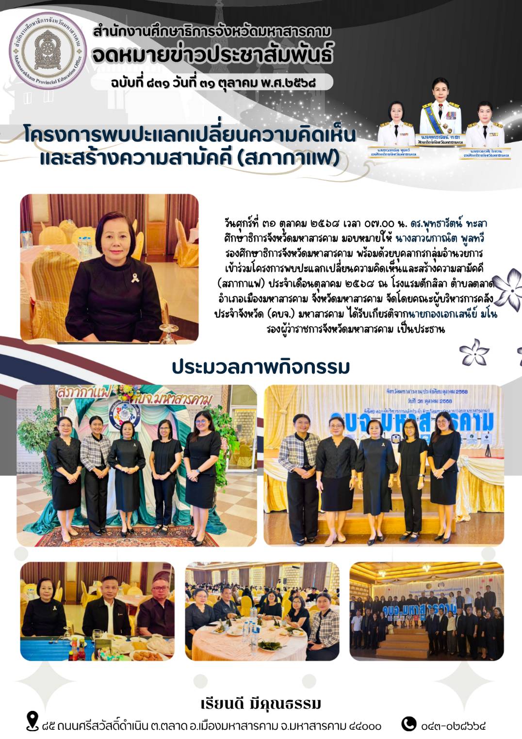 กิจกรรม วันที่ 31 ตุลาคม 2568 เวลา 07.00 น. ดร.พุทธารัตน์ ทะสา ศึกษาธิการจังหวัดมหาสารคาม มอบหมายให้ นางสาวผกาณิต พูลทวี รองศึกษาธิการจังหวัดมหาสารคาม พร้อมด้วยบุคลากรกลุ่มอำนวยการ เข้าร่วมโครงการพบปะแลกเปลี่ยนความคิดเห็นและสร้างความสามัคคี (สภากาแฟ) ประจำเดือนตุลาคม 2568 ณ โรงแรมตักสิลา ตำบลตลาด อำเภอเมืองมหาสารคาม จังหวัดมหาสารคาม จัดโดยคณะผู้บริหารการคลังประจำจังหวัด (คบจ.) มหาสารคาม ได้รับเกียรติจากนายกองเอกเสนีย์ มโน รองผู้ว่าราชการจังหวัดมหาสารคาม เป็นประธาน Posted on 31 October 2025 by admin admin วันที่ 30 ตุลาคม 2568 เวลา 16.30 น. ดร.พุทธารัตน์ ทะสา ศึกษาธิการจังหวัดมหาสารคาม มอบหมายให้ นางสาวผกาณิต พลูทวี รองศึกษาธิการจังหวัดมหาสารคาม เข้าร่วมพิธีสัตตมวาร 7 วัน เพื่ออุทิศถวายเป็นพระราชกุศล สมเด็จพระนางเจ้าสิริกิติ์ พระบรมราชินีพันปีหลวง ณ วัดปัจฉิมทัศน์ ตำบลตลาด อำเภอเมืองมหาสารคาม จังหวัดมหาสารคาม จัดโดยสำนักงานจังหวัดมหาสารคาม ได้รับเกียรติจากนายกนก ศรีวิชัยนันท์ รองผู้ว่าราชการจังหวัด รักษาราชการแทนผู้ว่าราชการจังหวัดมหาสารคาม เป็นประธาน วันที่ ๓๐ ตุลาคม ๒๕๖๘ เวลา ๑๗.๐๐ น. ดร.พุทธารัตน์ ทะสา ศึกษาธิการจังหวัดมหาสารคาม พร้อมด้วย นางสาวดาวศิริ ไชยวาน รองศึกษาธิการจังหวัดมหาสารคาม ร่วมพิธีสมโภชผ้าพระกฐินพระราชทาน ของกระทรวงศึกษาธิการ ประจำปี ๒๕๖๘ ณ โรงเรียนอิศรานุสรณ์ ตำบลปากน้ำ อำเภอเมืองกระบี่ จังหวัดกระบี่ และวันศุกร์ที่ ๓๑ ตุลาคม ๒๕๖๘ เวลา ๐๖.๐๐ น. ร่วมพิธีถวายผ้าพระกฐินพระราชทาน ณ วัดแก้วโกรวาราม ตำบลปากน้ำ อำเภอเมืองกระบี่ จังหวัดกระบี่ โดยมี ดร.สุเทพ แก่งสันเทียะ ปลัดกระทรวงศึกษาธิการ เป็นประธานฝ่ายฆราวาส