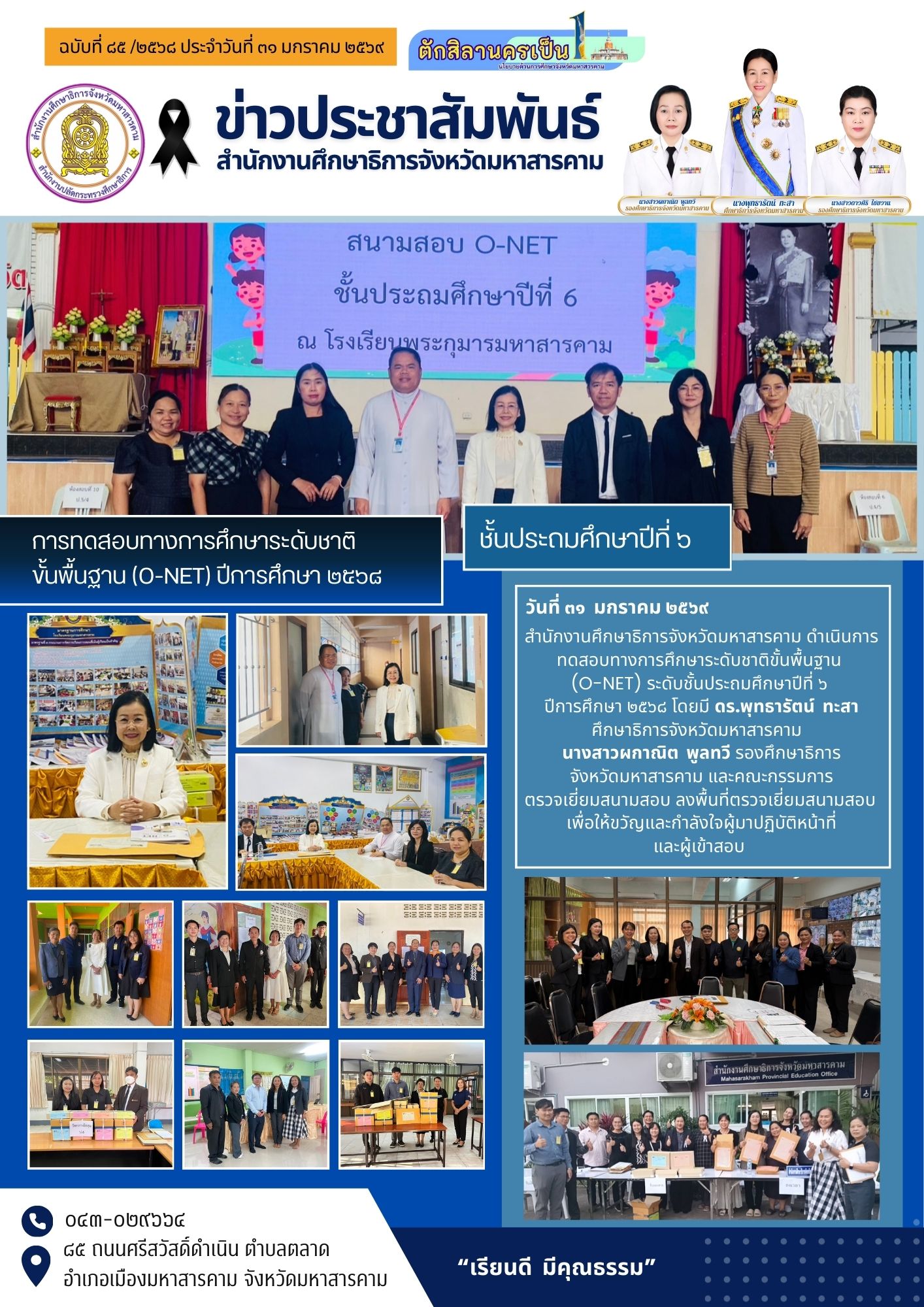 วันที่ 31 มกราคม 2569 สำนักงานศึกษาธิการจังหวัดมหาสารคาม ดำเนินการทดสอบทางการศึกษาระดับชาติขั้นพื้นฐาน (O-NET) ระดับชั้นประถมศึกษาปีที่ ๖ ปีการศึกษา ๒๕๖๘ โดยมี ดร.พุทธารัตน์ ทะสา ศึกษาธิการจังหวัดมหาสารคาม นางสาวผกาณิต พูลทวี รองศึกษาธิการจังหวัดมหาสารคาม และคณะกรรมการ ตรวจเยี่ยมสนามสอบลงพื้นที่ตรวจเยี่ยมสนามสอบเพื่อให้ขวัญและกำลังใจผู้มาปฏิบัติหน้าที่และผู้เข้าสอบ