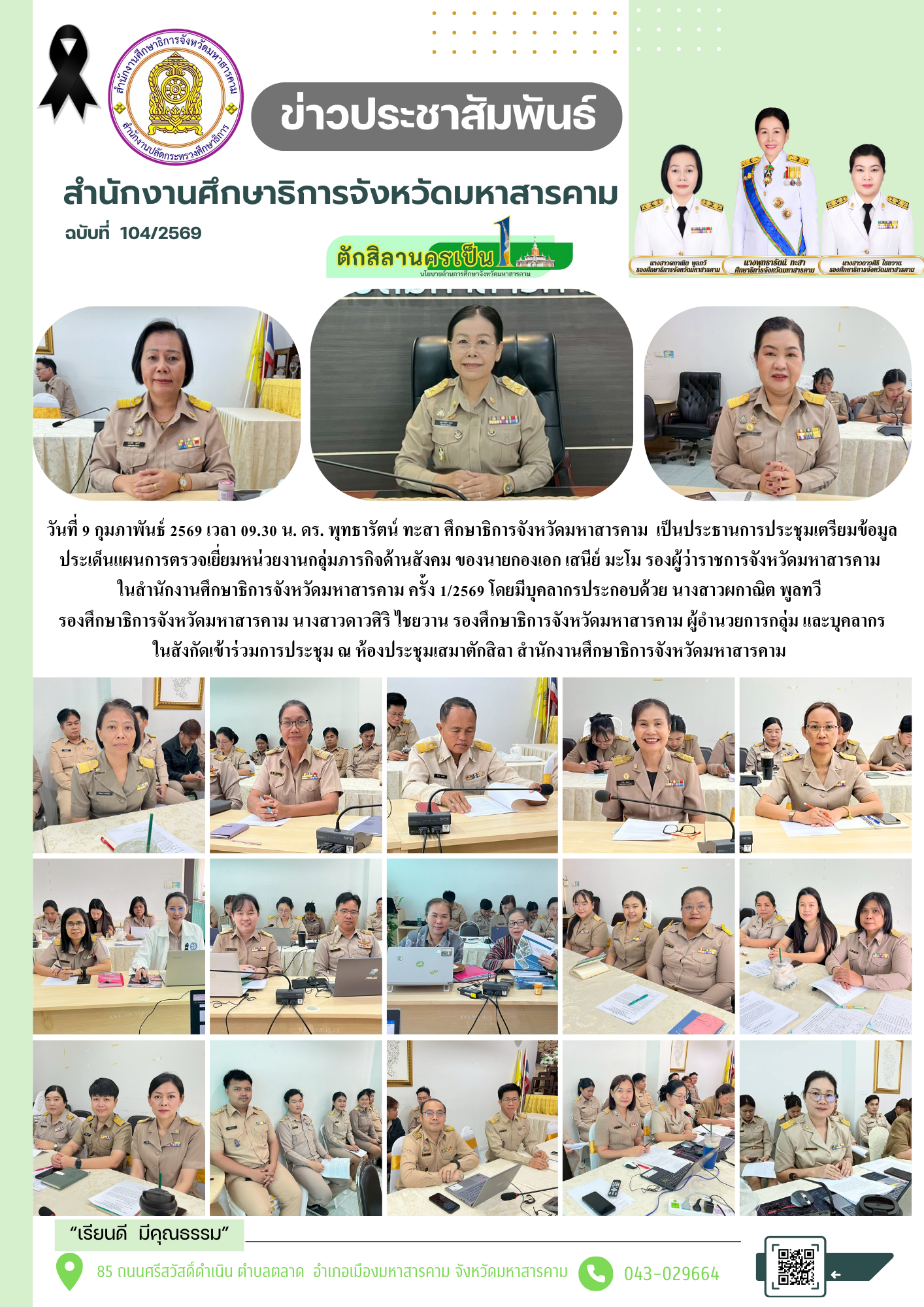 กิจกรรม วันที่ 9 กุมภาพันธ์ 2569 เวลา 09.30 น. ดร. พุทธารัตน์ ทะสา ศึกษาธิการจังหวัดมหาสารคาม เป็นประธานการประชุมเตรียมข้อมูลประเด็นแผนการตรวจเยี่ยมหน่วยงานกลุ่มภารกิจด้านสังคม ของนายกองเอก เสนีย์ มะโม รองผู้ว่าราชการจังหวัดมหาสารคาม ในสำนักงานศึกษาธิการจังหวัดมหาสารคาม ครั้ง 1/2569 โดยมีบุคลากรประกอบด้วย นางสาวผกาณิต พูลทวี รองศึกษาธิการจังหวัดมหาสารคาม นางสาวดาวศิริ ไชยวาน รองศึกษาธิการจังหวัดมหาสารคาม ผู้อำนวยการกลุ่ม และบุคลากร ในสังกัดเข้าร่วมการประชุม ณ ห้องประชุมเสมาตักสิลา สำนักงานศึกษาธิการจังหวัดมหาสารคาม Posted on 9 February 2026 by admin admin วันที่ ๖ กุมภาพันธ์ ๒๕๖๙ เวลา ๐๘.๐๐ น. ดร.พุทธารัตน์ ทะสา ศึกษาธิการจังหวัดมหาสารคาม พร้อมด้วยบุคลากรสำนักงานศึกษาธิการจังหวัดมหาสารคาม และบุคลากร นักเรียน โรงเรียนอนุบาลกิติยา จัดกิจกรรมเดินขบวนรณรงค์สัปดาห์ประชาธิปไตยในสถานศึกษา