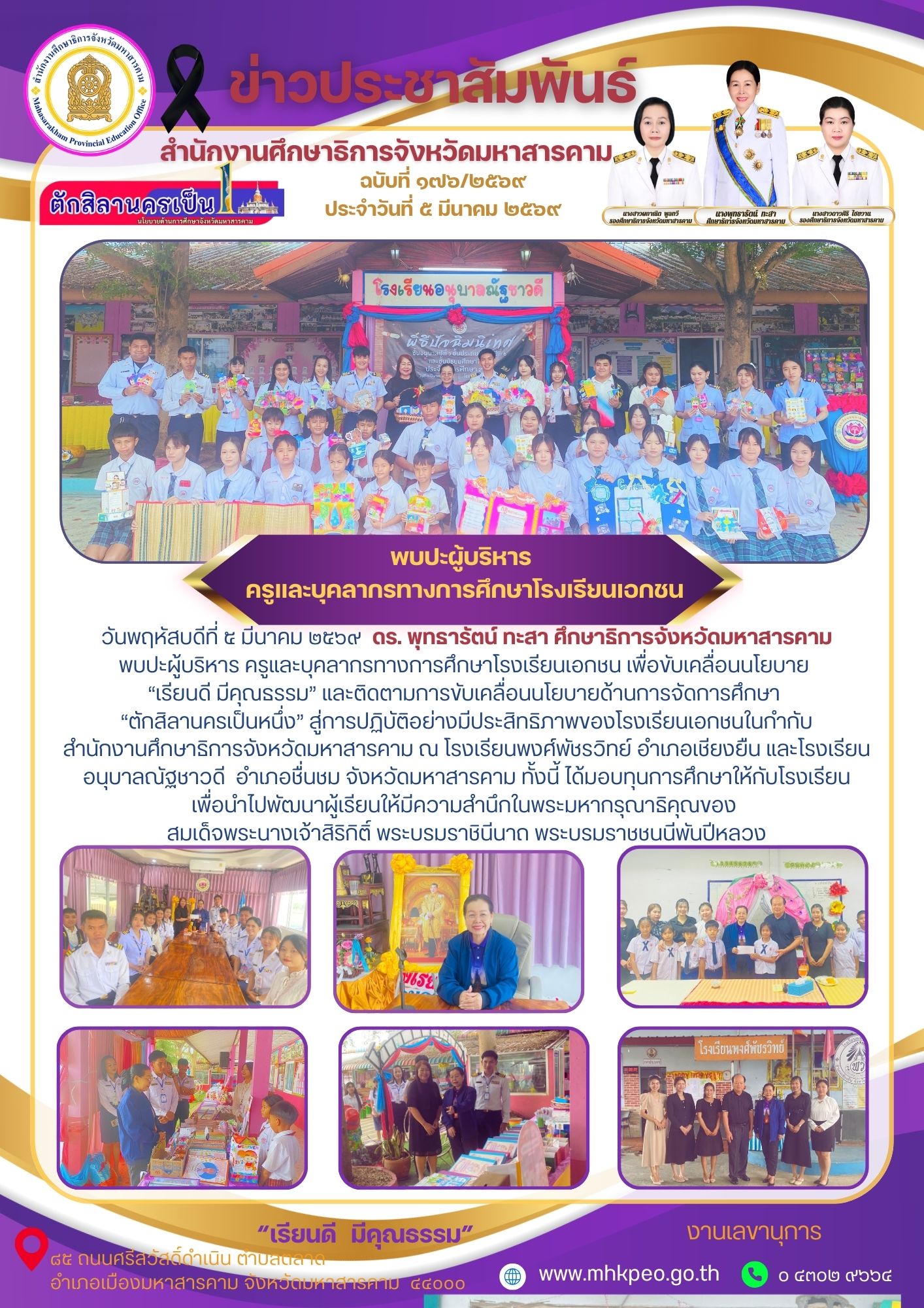 กิจกรรม วันพฤหัสบดีที่ ๕ มีนาคม ๒๕๖๙ ดร. พุทธารัตน์ ทะสา ศึกษาธิการจังหวัดมหาสารคาม พบปะผู้บริหาร ครูและบุคลากรทางการศึกษาโรงเรียนเอกชน เพื่อขับเคลื่อนนโยบาย “เรียนดี มีคุณธรรม” และติดตามการขับเคลื่อนนโยบายด้านการจัดการศึกษา “ตักสิลานครเป็นหนึ่ง” สู่การปฏิบัติอย่างมีประสิทธิภาพของโรงเรียนเอกชนในกำกับสำนักงานศึกษาธิการจังหวัดมหาสารคาม ณ โรงเรียนพงศ์พัชรวิทย์ อำเภอเชียงยืน และโรงเรียนอนุบาลณัฐชาวดี อำเภอชื่นชม จังหวัดมหาสารคาม ทั้งนี้ ได้มอบทุนการศึกษาให้กับโรงเรียน เพื่อนำไปพัฒนาผู้เรียนให้มีความสำนึกในพระมหากรุณาธิคุณของ สมเด็จพระนางเจ้าสิริกิติ์ พระบรมราชินีนาถ พระบรมราชชนนีพันปีหลวง Posted on 16 March 2026 by admin admin วันที่ 5 มีนาคม 2569 เวลา 14.00 น. ดร.พุทธารัตน์ ทะสา ศึกษาธิการจังหวัดมหาสารคาม มอบหมายให้ นางสาวผกาณิต พูลทวี รองศึกษาธิการจังหวัดมหาสารคาม เป็นประธานในการประชุมคณะกรรมการพิจารณาตรวจสอบและกลั่นกรองคุณสมบัติของบุคลากรโรงเรียนเอกชนในระบบ จังหวัดมหาสารคาม ที่พึงได้รับการเสนอขอ พระราชทานเครื่องราชอิสริยาภรณ์อันเป็นที่สรรเสริญยิ่งดิเรกคุณาภรณ์ ประจำปี พ.ศ. 2570 โดยมีนางอรุณรัตน์ อิ่มรัง ผู้อำนวยการกลุ่มบริหารงานบุคคล และบุคลากรกลุ่มส่งเสริมการศึกษาเอกชน สำนักงานศึกษาธิการจังหวัดมหาสารคาม เป็นกรรมการร่วมพิจารณาตรวจสอบและกลั่นกรองคุณสมบัติฯ ณ ห้องประชุมเสมาตักสิลา สำนักงานศึกษาธิการจังหวัดมหาสารคาม วันจันทร์ที่ ๙ มีนาคม ๒๕๖๙ เวลา ๐๘.๓๐ น. ดร.พุทธารัตน์ ทะสา ศึกษาธิการจังหวัดมหาสารคาม มอบหมายให้ นายสันติราษฎร์ พิทักษ์ เจ้าพนักงานธุรการปฏิบัติงาน เข้าร่วม โครงการอบรมพัฒนาศักยภาพเจ้าหน้าที่ปฏิบัติงานศูนย์ดำรงธรรมและการใช้งานแพลตฟอร์ม Trayy fondue จังหวัดมหาสารคาม ประจำปีงบประมาณ พ.ศ. ๒๕๖๙ เพื่อให้การแก้ไขปัญหาความเดือดร้อนของประชาชนมีความรวดเร็วและแม่นยำที่สุด รวมทั้งเพื่อพัฒนาเจ้าหน้าที่ให้มีความรู้ความเข้าใจเกี่ยวกับบทบาท ภารกิจ และขั้นตอนการปฏิบัติงานของศูนย์ดำรงธรรมทุกระดับ เพื่อพัฒนาทักษะการรับเรื่องร้องเรียน การสื่อสาร การเจรจาไกล่เกลี่ย ข้อพิพาทควบคุมอารมณ์ในการเผชิญหน้ากับผู้ร้องทุกประเภท เพื่อให้บริการประชาชนอย่างมืออาชีพ ณ โรงแรมสยามธาราพาเลซ ตำบลเกิ้ง อําเภอเมืองมหาสารคาม จังหวัดมหาสารคาม โดยมี นายชุมพิชญ์ เดชะรัฐ ผู้ว่าราชการจังหวัดมหาสารคาม เป็นประธาน
