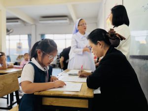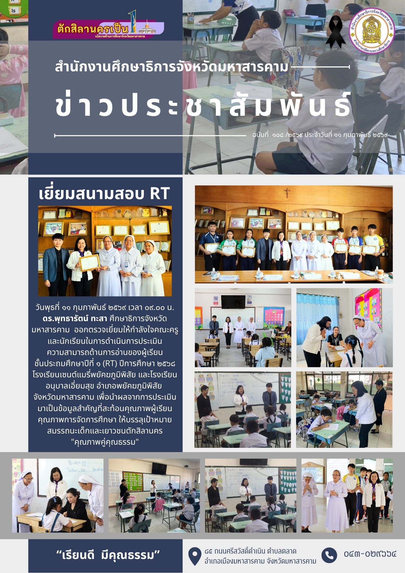 กิจกรรม วันพุธที่ ๑๑ กุมภาพันธ์ ๒๕๖๙ เวลา ๐๙.๐๐ น. ดร.พุทธารัตน์ ทะสา ศึกษาธิการจังหวัดมหาสารคาม ออกตรวจเยี่ยมให้กำลังใจคณะครูและนักเรียนในการดำเนินการประเมิน ความสามารถด้านการอ่านของผู้เรียน ชั้นประถมศึกษาปีที่ ๑ (RT) ปีการศึกษา ๒๕๖๘ โรงเรียนเซนต์แมรี่พยัคฆภูมิพิสัย และโรงเรียนอนุบาลเอี่ยมสุข อำเภอพยัคฆภูมิพิสัย จังหวัดมหาสารคาม เพื่อนำผลจากการประเมิน มาเป็นข้อมูลสำคัญที่สะท้อนคุณภาพผู้เรียน คุณภาพการจัดการศึกษา ให้บรรลุเป้าหมาย สมรรถนะเด็กและเยาวชนตักสิลานคร “คุณภาพคู่คุณธรรม” Posted on 12 February 2026 by admin admin วันที่ ๑๑ กุมภาพันธ์ ๒๕๖๙ เวลา ๐๙.๐๐ น. ดร.พุทธารัตน์ ทะสา ศึกษาธิการจังหวัดมหาสารคาม มอบหมายให้ นางสาวดาวศิริ ไชยวาน รองศึกษาธิการจังหวัดมหาสารคาม เป็นประธานการประชุมชี้แจงคณะกรรมการดำเนินงานภายใต้โครงการ “เสริมสร้างความเข้มแข็ง ๑ อำเภอ ๑ สถานศึกษาคุณภาพ ตามบริบทพื้นที่ ประจำปีงบประมาณ พ.ศ. ๒๕๖๙ โดยมี ดร.กาญจนา วิเศษรินทอง ผู้อำนวยการกลุ่มนิเทศ ติดตาม และประเมินผล พร้อมด้วย คณะศึกษานิเทศก์ ผู้บริหารและครูจากโรงเรียนนาดูนประชาสรรพ์ และโรงเรียนพยัคฆภูมิพิทยาคาร เข้าร่วมประชุมในครั้งนี้ ณ ห้องประชุมเสมาตักสิลา สำนักงานศึกษาธิการจังหวัดมหาสารคาม อำเภอเมืองมหาสารคาม จังหวัดมหาสารคาม วันพุธที่ ๑๑ กุมภาพันธ์ ๒๕๖๙ เวลา ๐๙.๐๐ น. ดร.พุทธารัตน์ ทะสา ศึกษาธิการจังหวัดมหาสารคาม มอบหมานให้ นางบุพวัณย์ เทศพรม นักวิชาการศึกษาชำนาญการ ปฏิบัติหน้าที่ ผู้อำนวยการกลุ่มส่งเสริมเอกชน และนางสาวธนาภา บุญครอบ ศึกษานิเทศก์ ออกตรวจเยี่ยมให้กำลังใจคณะครูและนักเรียน ในการดำเนินการประเมินความสามารถ ด้านการอ่านของผู้เรียนชั้นประถมศึกษาปีที่ ๑ (RT) ปีการศึกษา ๒๕๖๘ ณ โรงเรียนพระกุมารมหาสารคาม โรงเรียนพัฒนศึกษา และโรงเรียนในสังกัด ที่เข้ารับการทดสอบทั้งหมด ๑๙ โรงเรียน ภายในจังหวัดมหาสารคาม เพื่อนำผลจากการประเมินมาเป็นข้อมูลสำคัญที่สะท้อนคุณภาพผู้เรียน คุณภาพการจัดการศึกษา ให้บรรลุเป้าหมาย สมรรถนะเด็กและเยาวชนตักสิลานคร “คุณภาพคู่คุณธรรม”