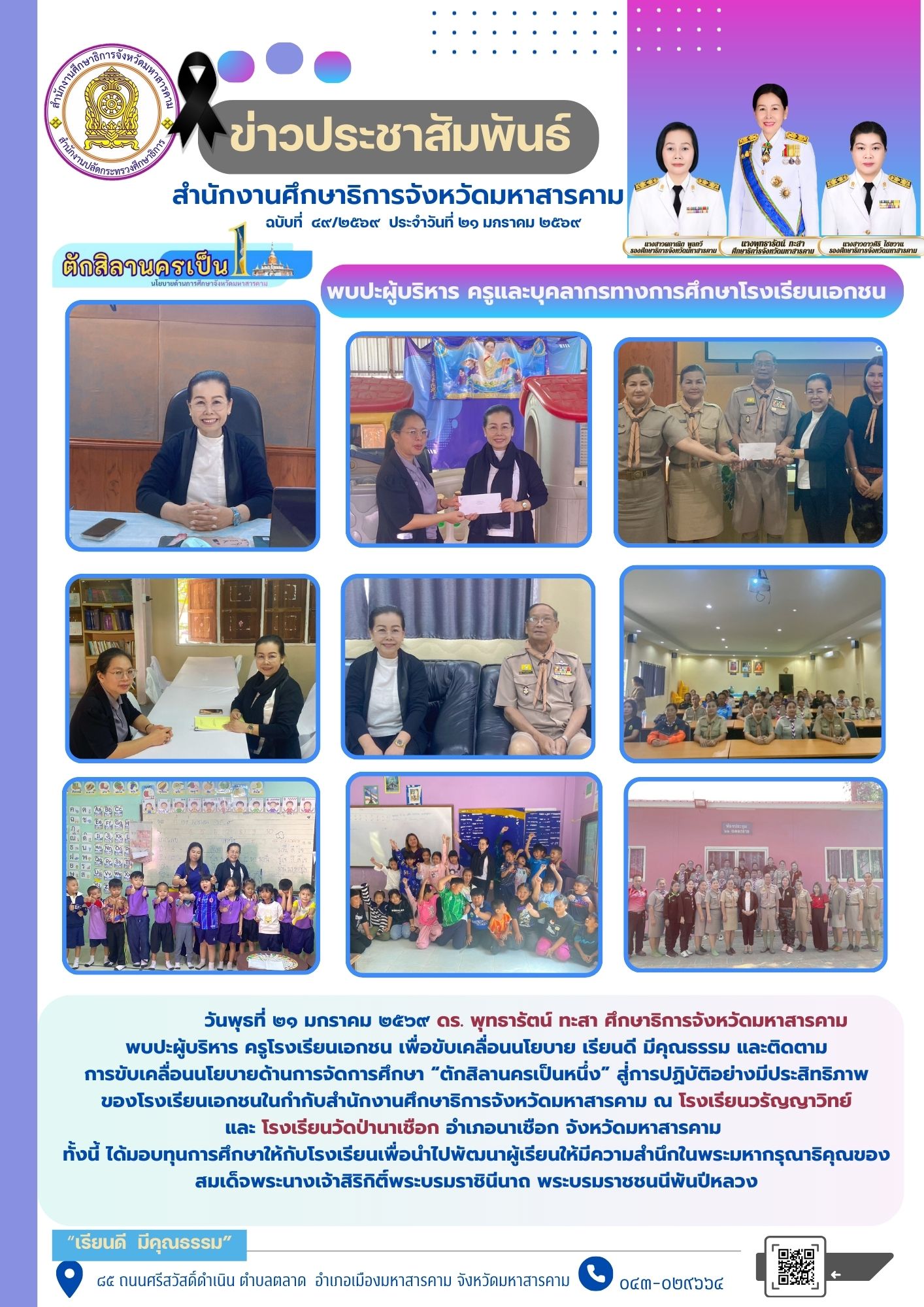 กิจกรรม วันพุธที่ ๒๑ มกราคม ๒๕๖๙ ดร. พุทธารัตน์ ทะสา ศึกษาธิการจังหวัดมหาสารคาม พบปะผู้บริหาร ครูโรงเรียนเอกชน เพื่อขับเคลื่อนนโยบาย เรียนดี มีคุณธรรม และติดตามการ ขับเคลื่อนนโยบายด้านการจัดการศึกษา “ตักสิลานครเป็นหนึ่ง” สู่่การปฏิบัติอย่างมีประสิทธิภาพของโรงเรียนเอกชนในกำกับสำนักงานศึกษาธิการจังหวัดมหาสารคาม ณ โรงเรียนวรัญญาวิทย์ และโรงเรียนวัดป่านาเชือก อำเภอนาเชือก จังหวัดมหาสารคาม ทั้งนี้ ได้มอบทุนการศึกษาให้กับโรงเรียนเพื่อนำไปพัฒนาผู้เรียนให้มีความสำนึกในพระมหากรุณาธิคุณของสมเด็จพระนางเจ้าสิริกิติ์ พระบรมราชินีนาถ พระบรมราชชนนีพันปีหลวง Posted on 22 January 2026 by admin admin วันอังคารที่ ๒๐ มกราคม ๒๕๖๙ เวลา ๐๙.๐๐ น. ดร. พุทธารัตน์ ทะสา ศึกษาธิการจังหวัดมหาสารคาม ร่วมเป็นเกียรติพิธีเปิดการแข่งขันกีฬา สกร. ร้อยแก่นสารสินธุ์เกมส์ ครั้งที่ ๔ ณ สนามมหาวิทยาลัยการกีฬาแห่งชาติ วิทยาเขตมหาสารคาม อำเภอเมืองมหาสารคาม จังหวัดมหาสารคาม ทั้งนี้ สำนักงานส่งเสริมการเรียนรู้ประจำจังหวัดมหาสารคามเป็นเจ้าภาพ โดยมี นายกองเอก เสนีย์ มะโน รองผู้ว่าราชการจังหวัดมหาสารคาม เป็นประธาน วันพุธที่ ๒๑ มกราคม ๒๕๖๙ เวลา ๐๖.๑๕ น. ดร.พุทธารัตน์ ทะสา ศึกษาธิการจังหวัดมหาสารคาม มอบหมายให้ นางสาวดาวศิริ ไชยวาน รองศึกษาธิการจังหวัดมหาสารคาม เข้าร่วมพิธีบวงสรวงมเหศักดิ์หลักเมือง และพิธีบวงสรวงแม่โพสพ เพื่อเป็นการอนุรักษ์ศิลปวัฒนธรรมและฟื้นฟูประเพณีพื้นบ้านของ ชาวอีสาน และส่งเสริมการท่องเที่ยวของจังหวัดมหาสารคามให้เป็นที่รู้จักอย่างแพร่หลาย เนื่องในงาน ประเพณีบุญเบิกฟ้าและงานกาชาดจังหวัดมหาสารคาม ประจำปี ๒๕๖๙ ณ บริเวณศาลหลักเมืองจังหวัดมหาสารคาม และหอพระประธานกันทรวิชัย หน้าอุทยานการเรียนรู้มหาสารคาม อำเภอเมืองมหาสารคาม จังหวัดมหาสารคาม โดยมี นายชุมพิชญ์ เดชะรัฐ ผู้ว่าราชการจังหวัดมหาสารคาม เป็นประธานในพิธี