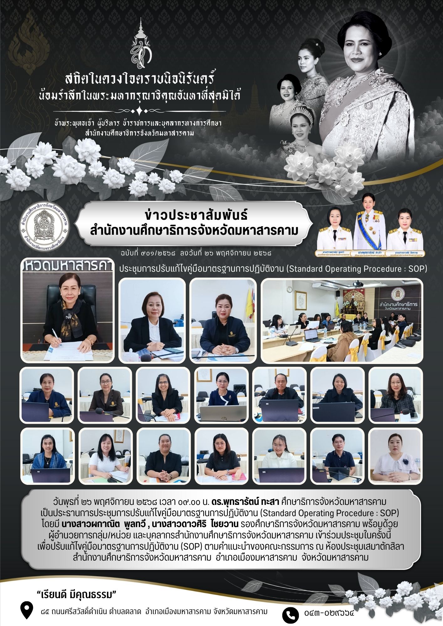 กิจกรรม วันพุธที่ ๒๖ พฤศจิกายน ๒๕๖๘ เวลา ๐๙.๐๐ น. ดร.พุทธารัตน์ ทะสา ศึกษาธิการจังหวัดมหาสารคาม เป็นประธานการประชุมการปรับแก้ไขคู่มือมาตรฐานการปฏิบัติงาน (Standard Operating Procedure : SOP) โดยมี นางสาวผกาณิต พูลทวี , นางสาวดาวศิริ ไชยวาน รองศึกษาธิการจังหวัดมหาสารคาม พร้อมด้วย ผู้อำนวยการกลุ่ม/หน่วย และบุคลากรสำนักงานศึกษาธิการจังหวัดมหาสารคาม เข้าร่วมประชุมในครั้งนี้ เพื่อปรับแก้ไขคู่มือมาตรฐานการปฏิบัติงาน (SOP) ตามคำแนะนำของคณะกรรมการ ณ ห้องประชุมเสมาตักสิลา สำนักงานศึกษาธิการจังหวัดมหาสารคาม อำเภอเมืองมหาสารคาม จังหวัดมหาสารคาม Posted on 28 November 2025 by admin admin วันพุธที่ ๒๖ พฤศจิกายน ๒๕๖๘ เวลา ๐๗.๐๐ น. ดร.พุทธารัตน์ ทะสา ศึกษาธิการจังหวัดมหาสารคาม พร้อมด้วย นางสาวผกาณิต พูลทวี และนางสาวดาวศิริ ไชยวาน รองศึกษาธิการจังหวัดมหาสารคาม เข้าร่วมโครงการพบปะแลกเปลี่ยน ความคิดเห็นและสร้างความสามัคคี ประจำเดือนพฤศจิกายน ๒๕๖๘ ณ โครงการชลประทานมหาสารคาม จัดโดยหน่วยงานสังกัดกระทรวงเกษตรและสหกรณ์จังหวัดมหาสารคาม ได้รับเกียรติจากนายสมเกียรติ วิริยะกุลนันท์ รองผู้ว่าราชการจังหวัดมหาสารคาม เป็นประธาน วันพุธ ที่ ๒๖ พฤศจิกายน ๒๕๖๘ เวลา ๑๓.๓๐ น. ดร.พุทธารัตน์ ทะสา ศึกษาธิการจังหวัดมหาสารคาม พร้อมด้วย นางสาวผกาณิต พูลทวี, นางสาวดาวศิริ ไชยวาน รองศึกษาธิการจังหวัดมหาสารคาม,ผู้อำนวยการกลุ่มนิเทศ ติดตามและประเมินผล, ปฏิบัติหน้าที่ ผู้อำนวยการกลุ่มส่งเสริมการศึกษาเอกชน และบุคลากรกลุ่มพัฒนาการศึกษา,กลุ่มส่งเสริมการศึกษาเอกชนและกลุ่มนโยบายและแผน เข้าร่วมประชุม 4thCredit Bank Forum : การจัดทำฐานข้อมูลการศึกษาและฝึกอบรมของจังหวัด เพื่อเทียบโอนและสะสมระบบธนาคารหน่วยกิต โดยรับชมผ่าน Live ถ่ายทอดสดผ่าน Facebook : thailand NQF โดยมี รศ.ประวิต เอราวรรณ์ เลขาธิการสภาการศึกษา เป็นประธาน