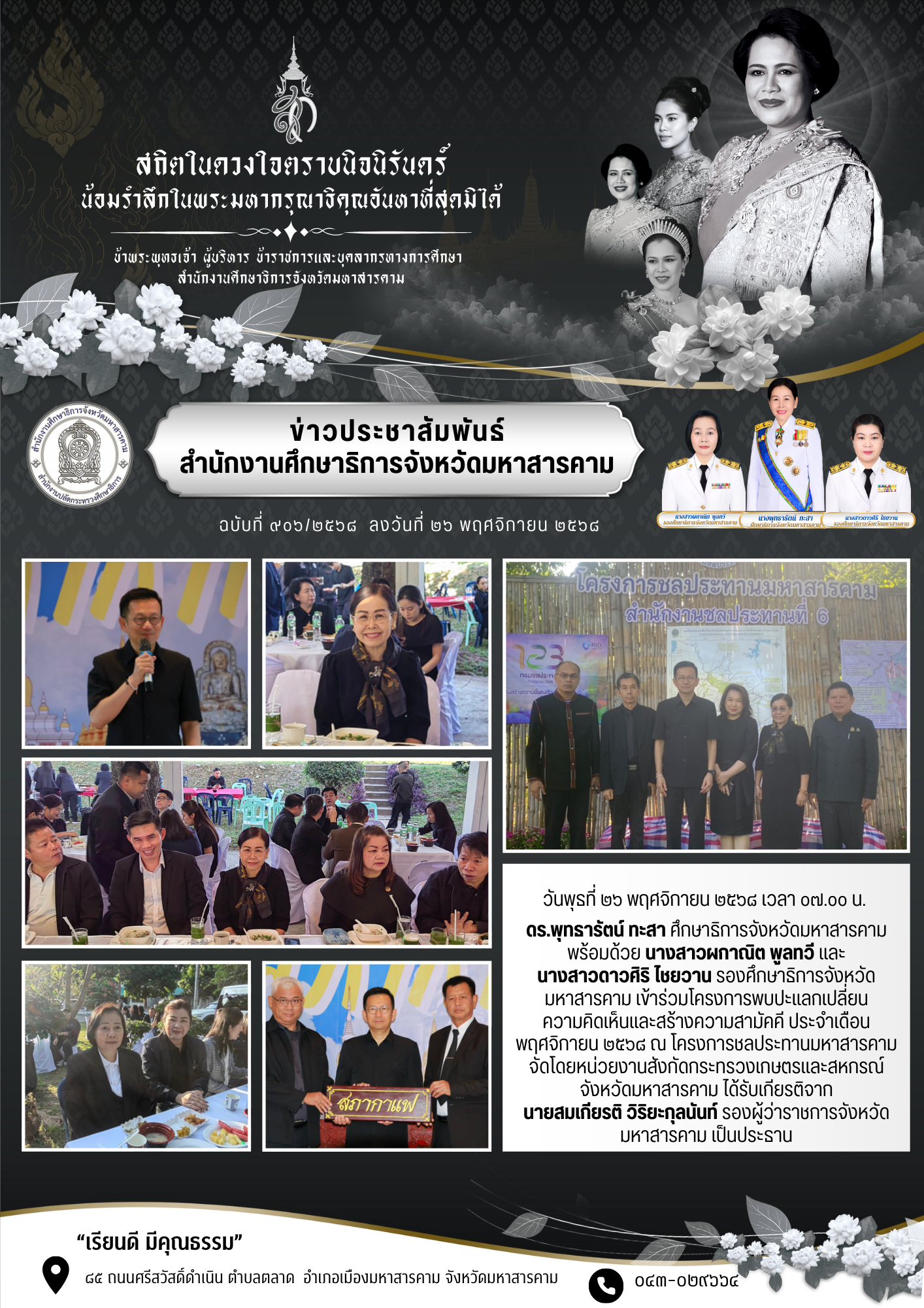 กิจกรรม วันพุธที่ ๒๖ พฤศจิกายน ๒๕๖๘ เวลา ๐๗.๐๐ น. ดร.พุทธารัตน์ ทะสา ศึกษาธิการจังหวัดมหาสารคาม พร้อมด้วย นางสาวผกาณิต พูลทวี และนางสาวดาวศิริ ไชยวาน รองศึกษาธิการจังหวัดมหาสารคาม เข้าร่วมโครงการพบปะแลกเปลี่ยน ความคิดเห็นและสร้างความสามัคคี ประจำเดือนพฤศจิกายน ๒๕๖๘ ณ โครงการชลประทานมหาสารคาม จัดโดยหน่วยงานสังกัดกระทรวงเกษตรและสหกรณ์จังหวัดมหาสารคาม ได้รับเกียรติจากนายสมเกียรติ วิริยะกุลนันท์ รองผู้ว่าราชการจังหวัดมหาสารคาม เป็นประธาน Posted on 28 November 2025 by admin admin วันที่ 25 พฤศจิกายน 2568 สำนักงานศึกษาธิการจังหวัดมหาสารคาม นำโดย ดร. พุทธรัตน์ ทะสา ศึกษาธิการจังหวัดมหาสารคาม บุคลากรกลุ่มพัฒนาการศึกษา และทีมงานร่วมกับคณะกรรมการทุนการศึกษาพระราชทาน ม.ท.ศ. ประจำจังหวัดมหาสารคาม ลงพื้นที่ติดตามนักเรียนทุนพระราชทานรุ่นที่ 15 -17 ทั้งในด้านการเรียนความประพฤติ และการใช้จ่ายเงินทุนพระราชทาน ตลอดจนการช่วยเหลือนักเรียน กรณีต้องเผชิญปัญหาต่างๆ ณ โรงเรียนสารคามพิทยาคม โรงเรียนเชียงยืนพิทยาคม โรงเรียนโกสุมวิทยาสรรค์ โรงเรียนบรบือ โรงเรียนพยัคฆภูมิวิทยาคาร ทั้งนี้ได้รับเกียรติจาก นายสมเกียรติ วิริยะกุลนันท์ รองผู้ว่าราชการจังหวัดมหาสารคาม เป็นประธาน วันพุธที่ ๒๖ พฤศจิกายน ๒๕๖๘ เวลา ๐๙.๐๐ น. ดร.พุทธารัตน์ ทะสา ศึกษาธิการจังหวัดมหาสารคาม เป็นประธานการประชุมการปรับแก้ไขคู่มือมาตรฐานการปฏิบัติงาน (Standard Operating Procedure : SOP) โดยมี นางสาวผกาณิต พูลทวี , นางสาวดาวศิริ ไชยวาน รองศึกษาธิการจังหวัดมหาสารคาม พร้อมด้วย ผู้อำนวยการกลุ่ม/หน่วย และบุคลากรสำนักงานศึกษาธิการจังหวัดมหาสารคาม เข้าร่วมประชุมในครั้งนี้ เพื่อปรับแก้ไขคู่มือมาตรฐานการปฏิบัติงาน (SOP) ตามคำแนะนำของคณะกรรมการ ณ ห้องประชุมเสมาตักสิลา สำนักงานศึกษาธิการจังหวัดมหาสารคาม อำเภอเมืองมหาสารคาม จังหวัดมหาสารคาม