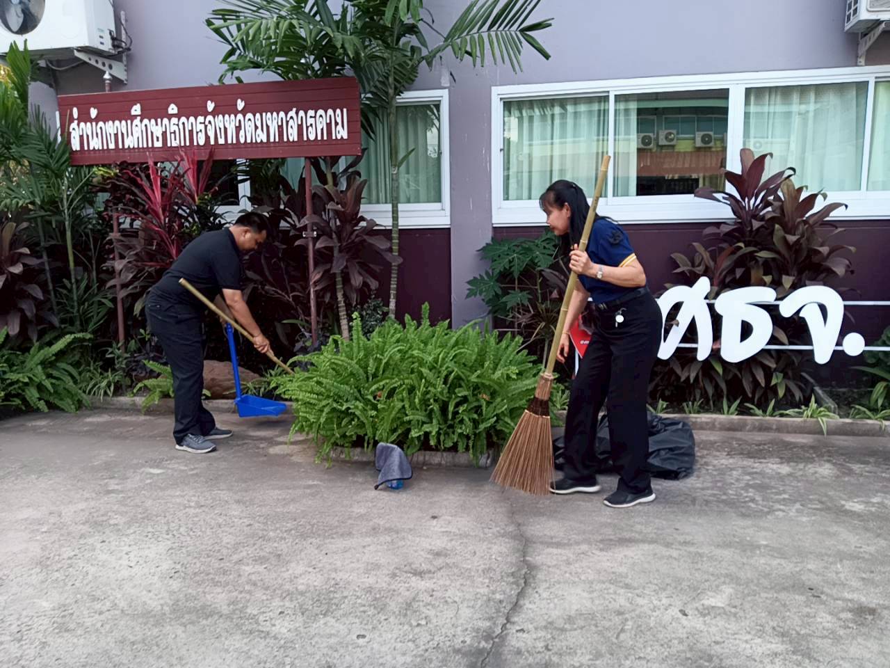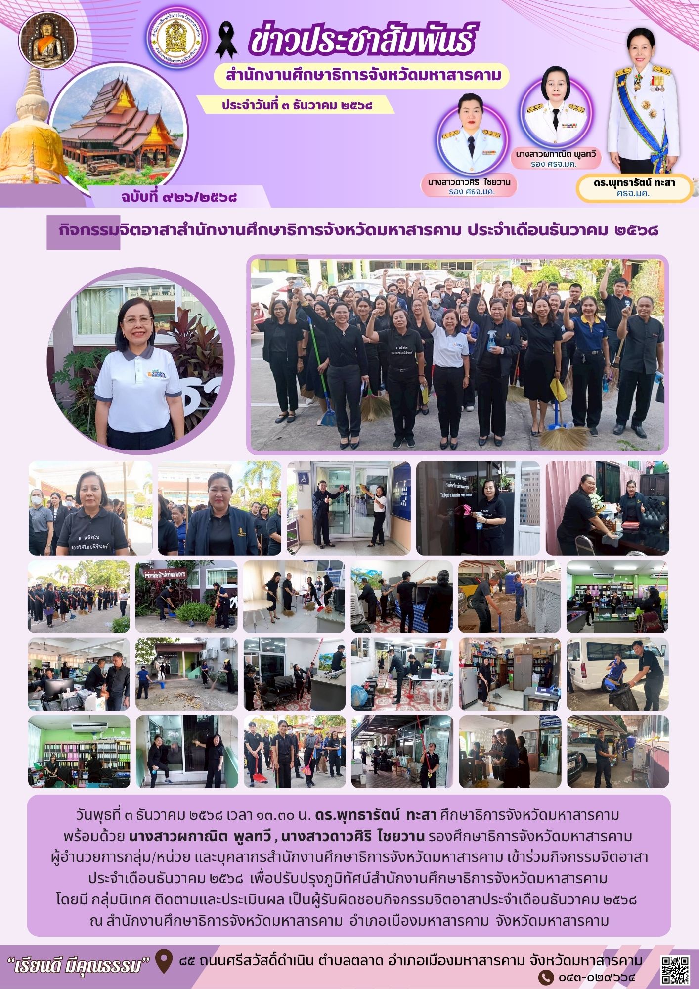 วันพุธที่ ๓ ธันวาคม ๒๕๖๘ เวลา ๑๓.๓๐ น. ดร.พุทธารัตน์ ทะสา ศึกษาธิการจังหวัดมหาสารคาม พร้อมด้วย นางสาวผกาณิต พูลทวี , นางสาวดาวศิริ ไชยวาน รองศึกษาธิการจังหวัดมหาสารคาม ผู้อำนวยการกลุ่ม/หน่วย และบุคลากรสำนักงานศึกษาธิการจังหวัดมหาสารคาม เข้าร่วมกิจกรรมจิตอาสาประจำเดือนธันวาคม ๒๕๖๘ เพื่อปรับปรุงภูมิทัศน์สำนักงานศึกษาธิการจังหวัดมหาสารคาม โดยมี กลุ่มนิเทศ ติดตามและประเมินผล เป็นผู้รับผิดชอบกิจกรรมจิตอาสาประจำเดือนธันวาคม ๒๕๖๘ ณ สำนักงานศึกษาธิการจังหวัดมหาสารคาม อำเภอเมืองมหาสารคาม จังหวัดมหาสารคาม