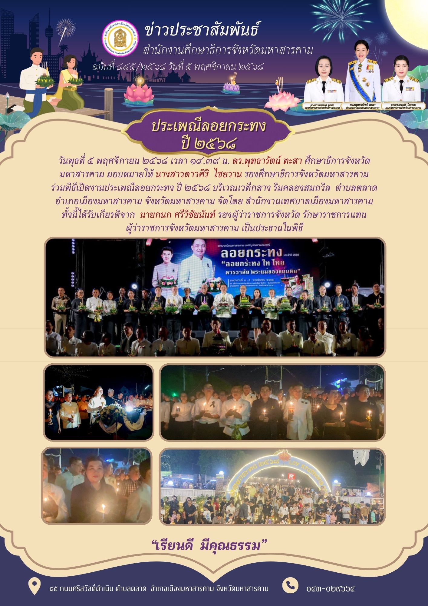 วันพุธที่ ๕ พฤศจิกายน ๒๕๖๘ เวลา ๑๙.๓๙ น. ดร.พุทธารัตน์ ทะสา ศึกษาธิการจังหวัดมหาสารคาม มอบหมายให้ นางสาวดาวศิริ ไชยวาน รองศึกษาธิการจังหวัดมหาสารคาม ร่วมพิธีเปิดงานประเพณีลอยกระทง ปี ๒๕๖๘ บริเวณเวทีกลาง ริมคลองสมถวิล ตำบลตลาด อำเภอเมืองมหาสารคาม จังหวัดมหาสารคาม จัดโดย สำนักงานเทศบาลเมืองมหาสารคาม ทั้งนี้ได้รับเกียรติจาก นายกนก ศรีวิชัยนันท์ รองผู้ว่าราชการจังหวัด รักษาราชการแทนผู้ว่าราชการจังหวัดมหาสารคาม เป็นประธานในพิธี
