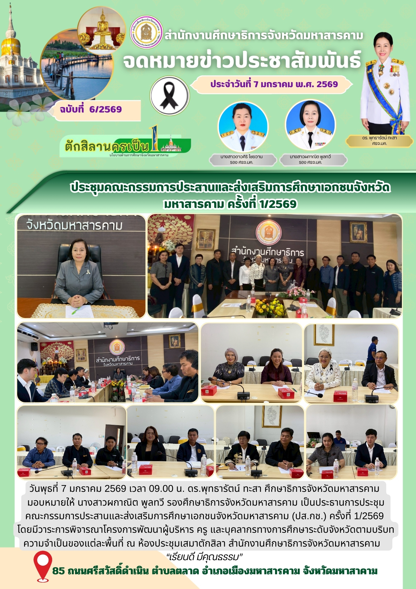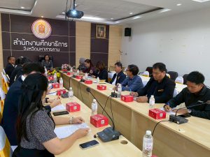 กิจกรรม วันพุธที่ 7 มกราคม 2569 เวลา 09.00 น. ดร.พุทธารัตน์ ทะสา ศึกษาธิการจังหวัดมหาสารคาม มอบหมายให้ นางสาวผกาณิต พูลทวี รองศึกษาธิการจังหวัดมหาสารคาม เป็นประธานการประชุม คณะกรรมการประสานและส่งเสริมการศึกษาเอกชนจังหวัดมหาสารคาม (ปส.กช.) ครั้งที่ 1/2569 โดยมีวาระการพิจารณาโครงการพัฒนาผู้บริหาร ครู และบุคลากรทางการศึกษาระดับจังหวัดตามบริบท ความจำเป็นของแต่ละพื้นที่ ณ ห้องประชุมเสมาตักสิลา สำนักงานศึกษาธิการจังหวัดมหาสารคาม Posted on 8 January 2026 by admin admin วันจันทร์ที่ ๕ มกราคม ๒๕๖๙ เวลา ๐๘.๓๐ น. ดร. พุทธารัตน์ ทะสา ศึกษาธิการจังหวัดมหาสารคาม พร้อมด้วยบุคลากรสำนักงานศึกษาธิการจังหวัดมหาสารคาม ร่วมกิจกรรมเทิดทูนสถาบันชาติ ศาสนา พระมหากษัตริย์ โดยการเข้าแถวเคารพธงชาติ สวดมนต์ไหว้พระ กล่าวอุดมการณ์รักชาติ และคำปฏิญาณตน เพื่อแสดงออกถึงความจงรักภักดีต่อชาติ ศาสนา และพระมหากษัตริย์ พร้อมด้วยร่วมกิจกรรมเดินจงกรม-นังสมาธิ และกิจกรรม Morning Talk ณ ห้องประชุมเสมาตักสิลา สำนักงานศึกษาธิการจังหวัดมหาสารคาม อำเภอเมืองมหาสารคาม จังหวัดมหาสารคาม วันพุธที่ ๗ มกราคม ๒๕๖๙ เวลา ๐๙.๐๐ น. ดร.พุทธารัตน์ ทะสา ศึกษาธิการจังหวัดมหาสารคาม ให้เกียรติเป็นประธานในการประเมินคัดเลือก ข้าราชการครูและบุคลากรทางการศึกษา เนื่องในวันครู ประจำปี ๒๕๖๙ เพื่อรับรางวัลจากสำนักงานศึกษาธิการจังหวัดมหาสารคาม ณ หอประชุมโรงเรียนบ้านเชียงยืน อำเภอเชียงยืน จังหวัดมหาสารคาม ทั้งนี้ ดร.นงลักษณ์ มีแก้ว ศึกษานิเทศก์ชำนาญการพิเศษ และนางสาวนิตยา ฮะยงยุทธ ศึกษานิเทศก์ชำนาญการพิเศษ ร่วมเป็นคณะกรรรมการประเมินคัดเลือกข้าราชการครู และบุคลากรทางการศึกษา ซึ่งจัดโดย นายกสมาคมครูอำเภอเชียงยืน จังหวัดมหาสารคาม