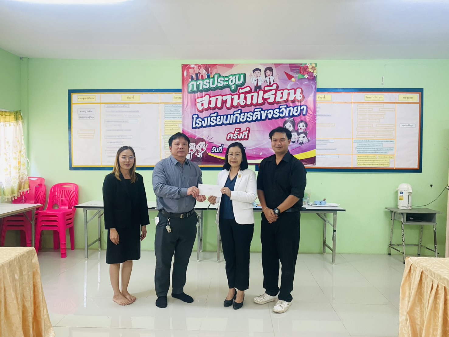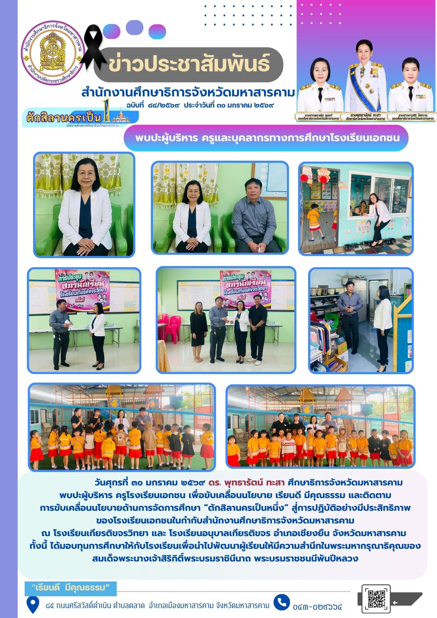 กิจกรรม วันศุกรที่ ๓๐ มกราคม ๒๕๖๙ ดร. พุทธารัตน์ ทะสา ศึกษาธิการจังหวัดมหาสารคาม พบปะผู้บริหาร ครูโรงเรียนเอกชน เพื่อขับเคลื่อนนโยบาย เรียนดี มีคุณธรรม และติดตาม การขับเคลื่อนนโยบายด้านการจัดการศึกษา “ตักสิลานครเป็นหนึ่ง” สู่่การปฏิบัติอย่างมีประสิทธิภาพ ของโรงเรียนเอกชนในกำกับสำนักงานศึกษาธิการจังหวัดมหาสารคาม ณ โรงเรียนเกียรติขจรวิทยา และ โรงเรียนอนุบาลเกียรติขจร อำเภอเชียงยืน จังหวัดมหาสารคาม ทั้งนี้ ได้มอบทุนการศึกษาให้กับโรงเรียนเพื่อนำไปพัฒนาผู้เรียนให้มีความสำนึกในพระมหากรุณาธิคุณของ สมเด็จพระนางเจ้าสิริกิติ์พระบรมราชินีนาถ พระบรมราชชนนีพันปีหลวง Posted on 30 January 202630 January 2026 by admin admin วันพฤหัสบดีที่ ๒๙ มกราคม ๒๕๖๙ เวลา ๐๙.๐๐ น. ดร.พุทธารัตน์ ทะสา ศึกษาธิการจังหวัดมหาสารคาม นางสาวผกาณิต พูลทวี นางสาวดาวศิริ ไชยวาน รองศึกษาธิการจังหวัดมหาสารคาม พร้อมด้วย ผู้อำนวยการกลุ่ม/หน่วย และบุคลากรสำนักงานศึกษาธิการจังหวัดมหาสารคาม ร่วมประชุมบุคลากร สำนักงานศึกษาธิการจังหวัดมหาสารคาม ครั้งที่ ๑/๒๕๖๙ เพื่อติดตามผลการดำเนินงานเดือนธันวาคม ๒๕๖๘ – มกราคม ๒๕๖๙ ณ ห้องประชุมเสมาตักสิลา สำนักงานศึกษาธิการจังหวัดมหาสารคาม วันที่ ๒๘-๒๙ มกราคม ๒๕๖๙ ดร.พุทธารัตน์ ทะสา ศึกษาธิการจังหวัดมหาสารคาม มอบหมายให้ ดร.นงลักษณ์ มีแก้ว ศึกษานิเทศก์ ชำนาญการพิเศษ และ นางสาวธนาภา บุญครอบ ศึกษานิเทศก์ชำนาญการพิเศษ เข้าร่วมการประชุมตามโครงการ “ปลุกพลังปฐมวัย พลิกอนาคตอีสาน” เพื่อขับเคลื่อนคุณภาพ การศึกษาระดับปฐมวัยทุกภาคส่วน จัดโดย สถาบันบัณฑิตพัฒบริหารศาสตร์ (นิด้า) ยูนิเซฟ ธนาคารโลก (World bank group) และมูลนิธิเด็กน้อยพัฒนา ณ โรงแรมแคนทารี่ โคราช จังหวัดนครราชสีมา