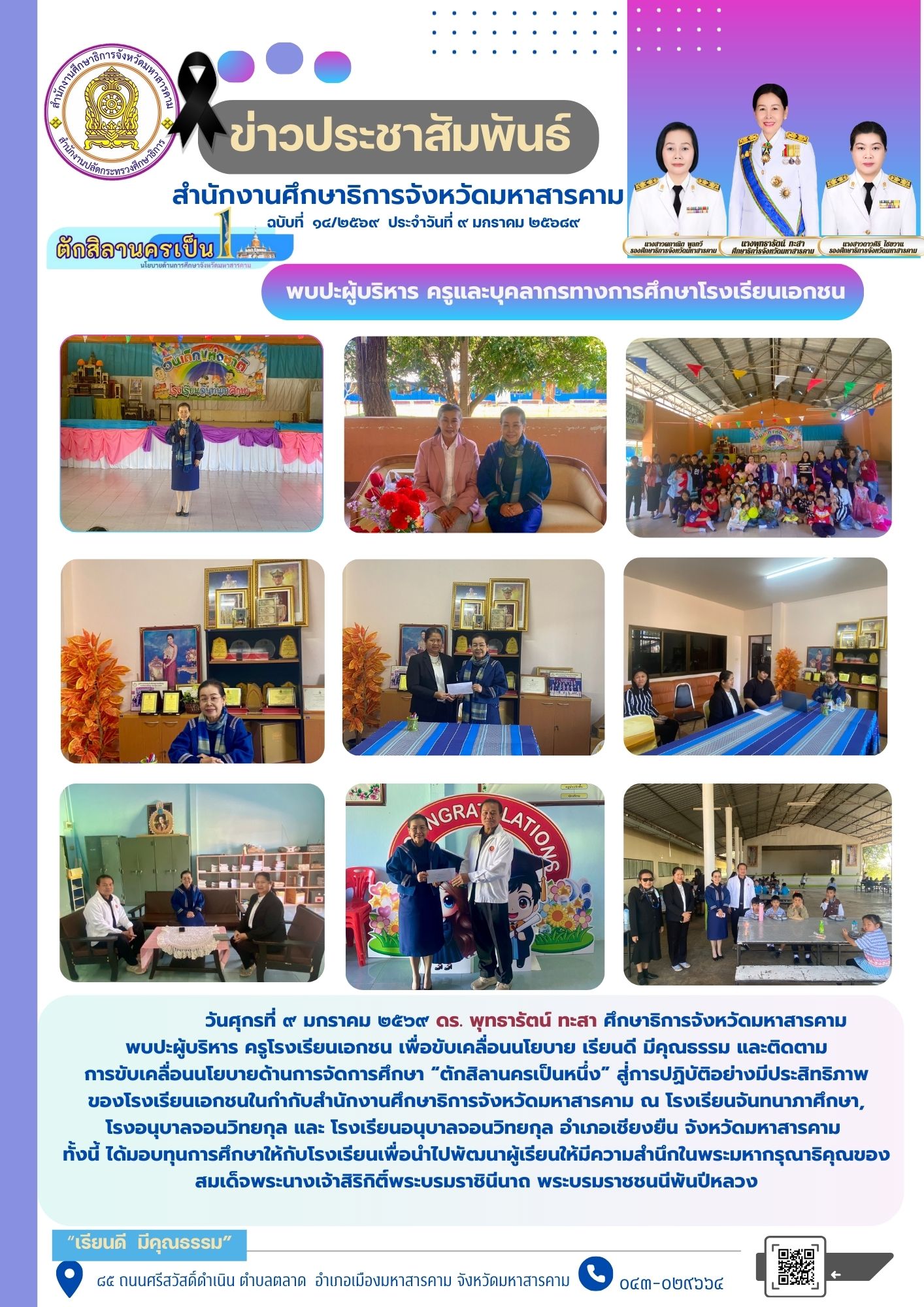 วันศุกรที่ ๙ มกราคม ๒๕๖๙ ดร. พุทธารัตน์ ทะสา ศึกษาธิการจังหวัดมหาสารคาม พบปะผู้บริหาร ครูโรงเรียนเอกชน เพื่อขับเคลื่อนนโยบาย เรียนดี มีคุณธรรม และติดตามการขับเคลื่อนนโยบายด้านการจัดการศึกษา “ตักสิลานครเป็นหนึ่ง” สู่การปฏิบัติอย่างมีประสิทธิภาพของโรงเรียนเอกชนในกำกับสำนักงานศึกษาธิการจังหวัดมหาสารคาม ณ โรงเรียนจันทนาภาศึกษา,โรงอนุบาลจอนวิทยกุล และ โรงเรียนอนุบาลจอนวิทยกุล อำเภอเชียงยืน จังหวัดมหาสารคาม ทั้งนี้ ได้มอบทุนการศึกษาให้กับโรงเรียนเพื่อนำไปพัฒนาผู้เรียนให้มีความสำนึกในพระมหากรุณาธิคุณของสมเด็จพระนางเจ้าสิริกิติ์ พระบรมราชินีนาถ พระบรมราชชนนีพันปีหลวง